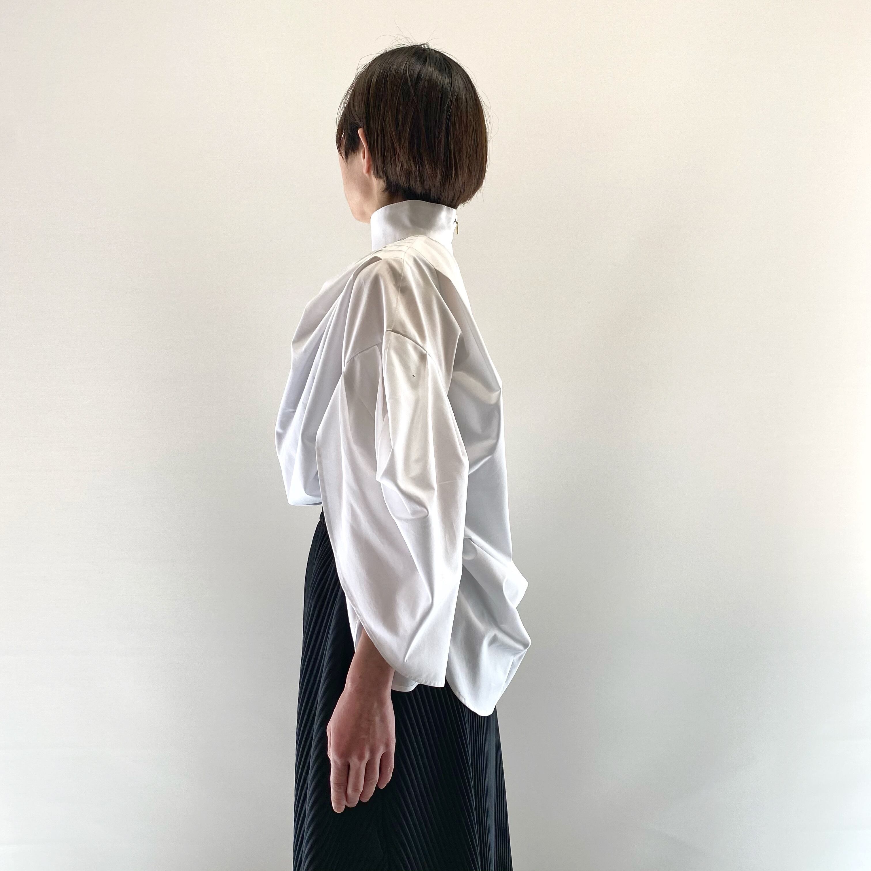 禁欲的でスッとしたハイネックが、胸元や袖のボリューム対比して、全体をキュッと引き締める印象に