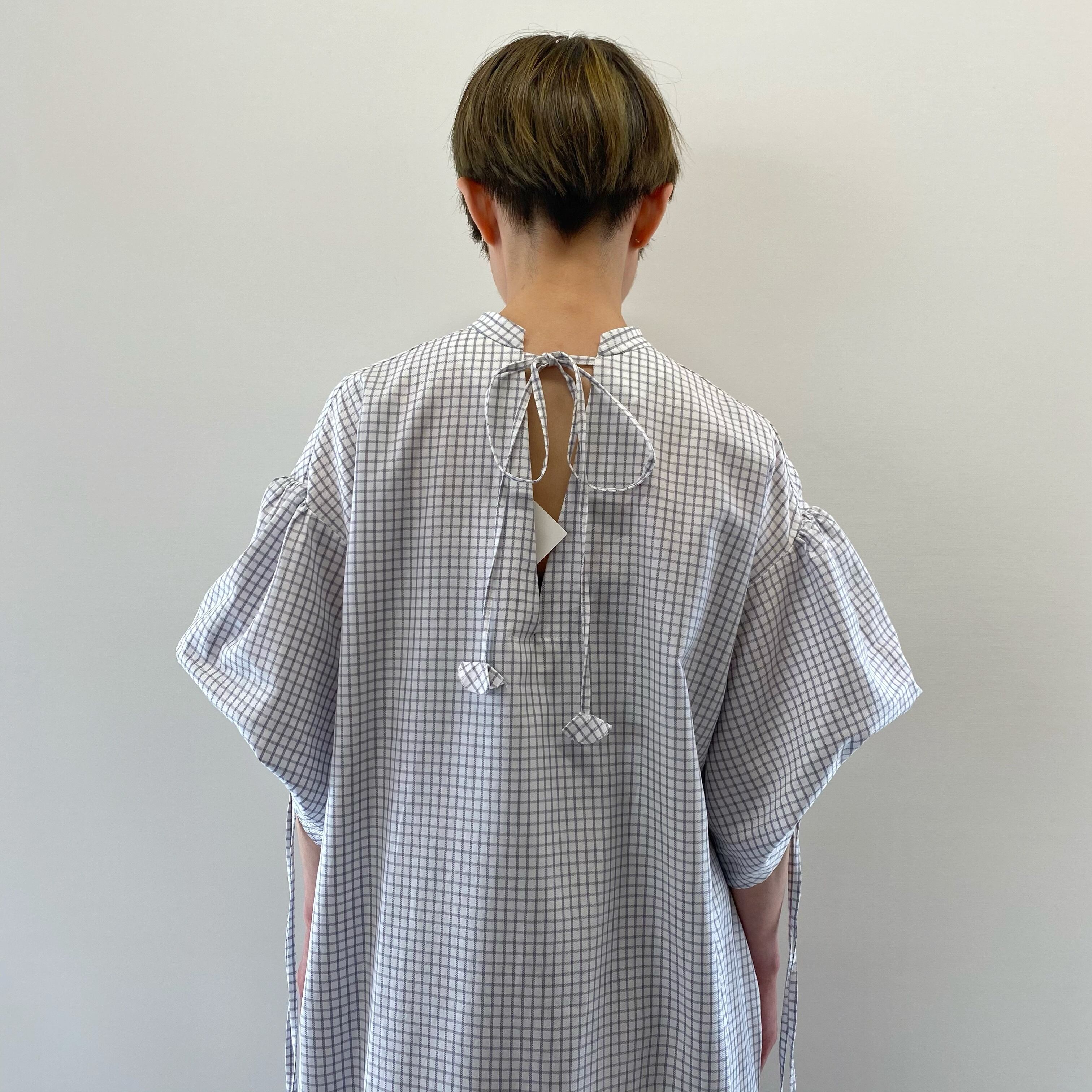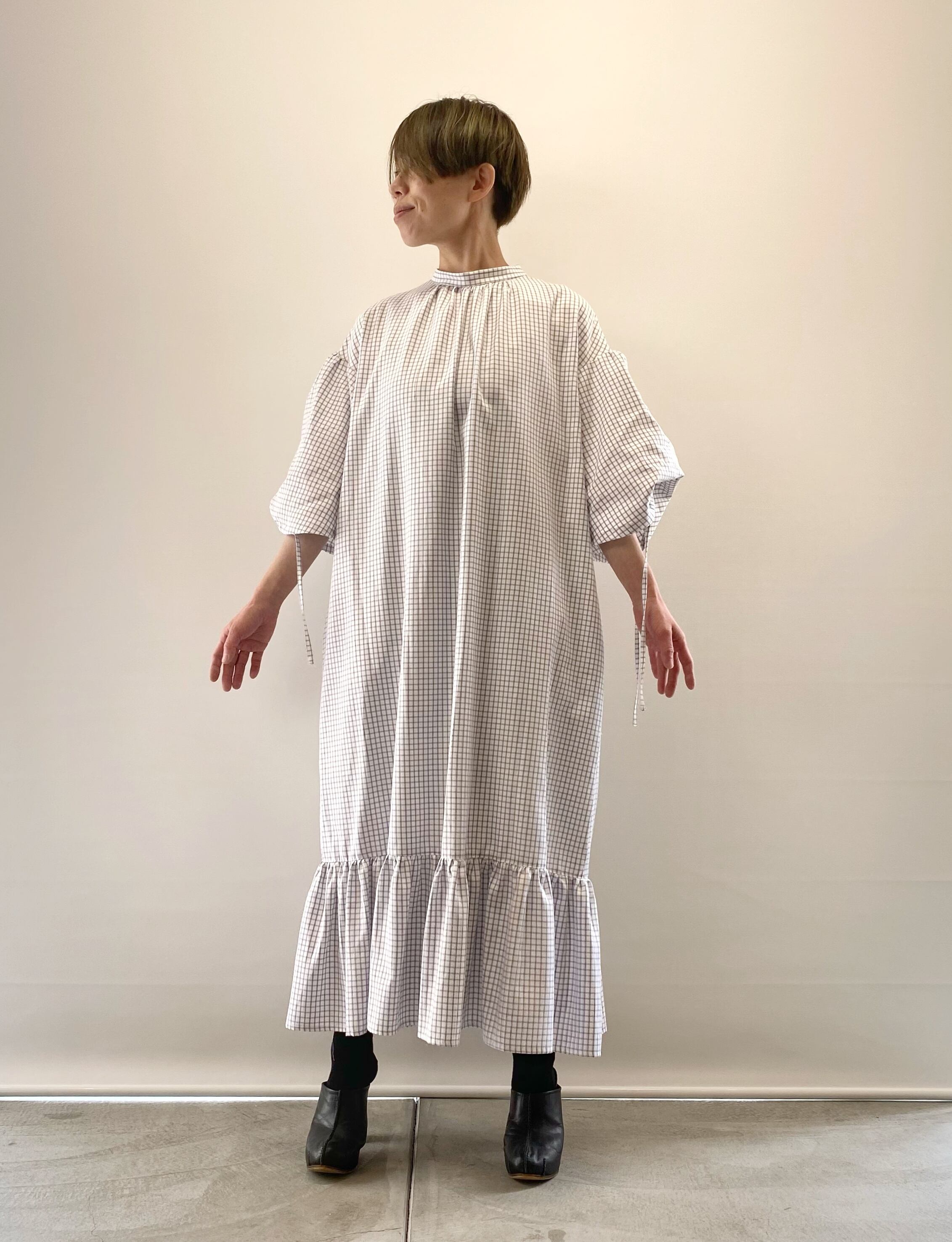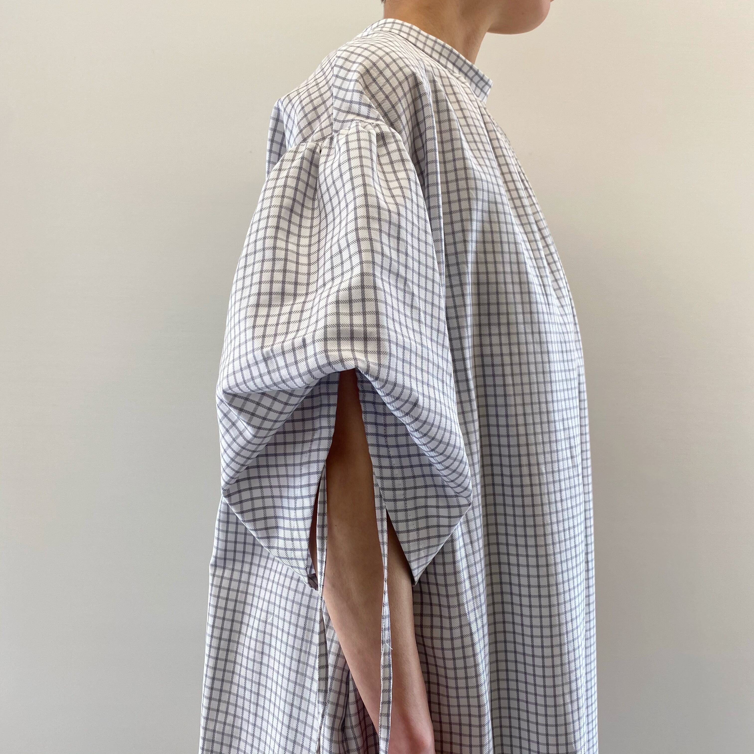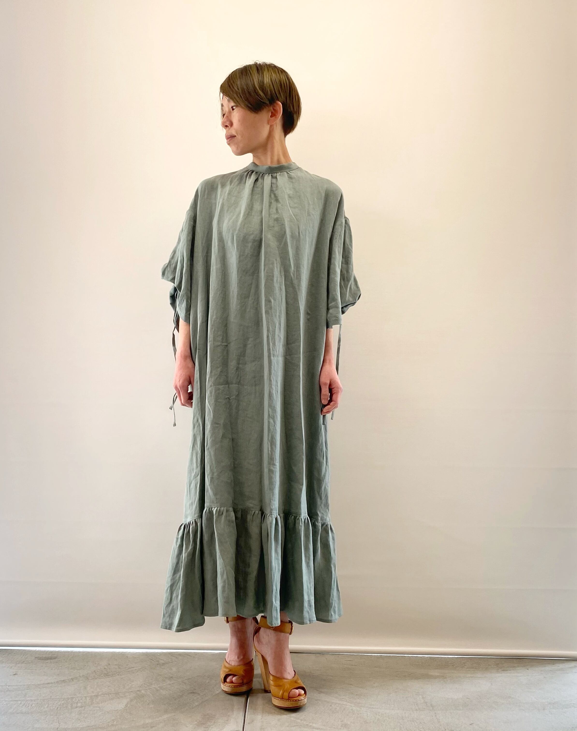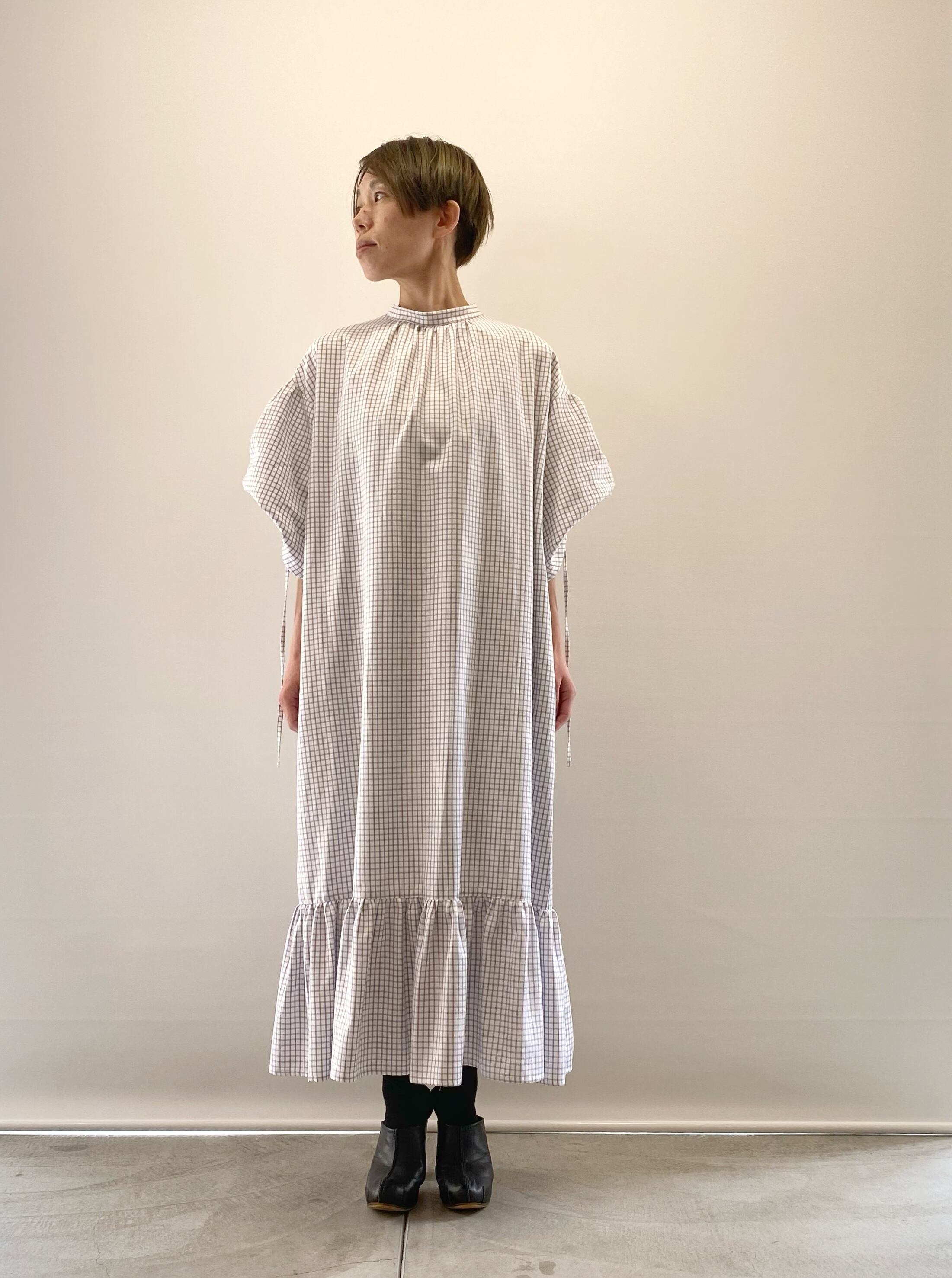 袖、裾にギャザーを入れたフェミニンなスタンドカラーワンピース。袖口には共地のヒモが入り、このヒモをしぼることにより、袖の形に変化を持たせることができます。さらに前後どちらでも着用できる便利なアイテムです。
