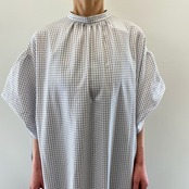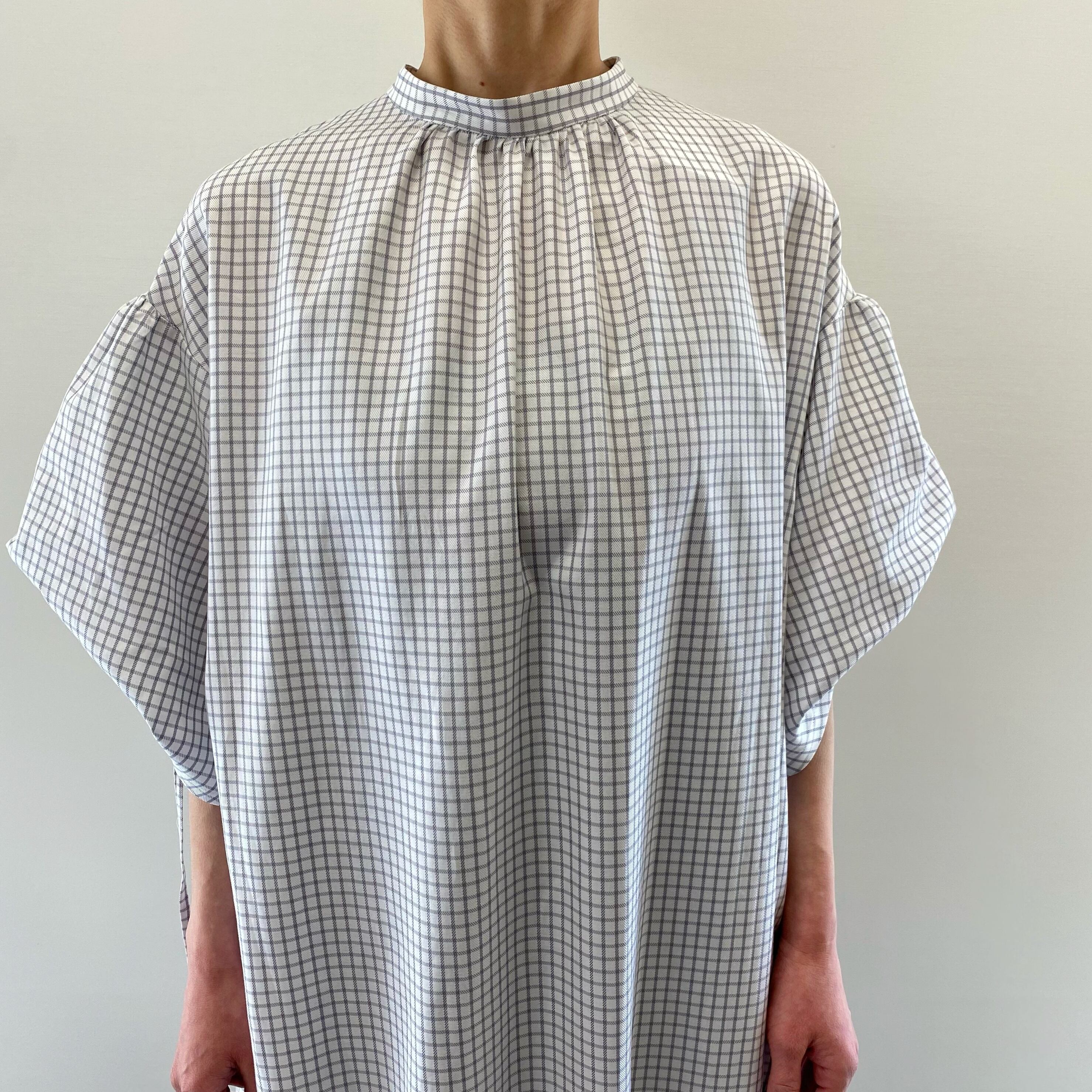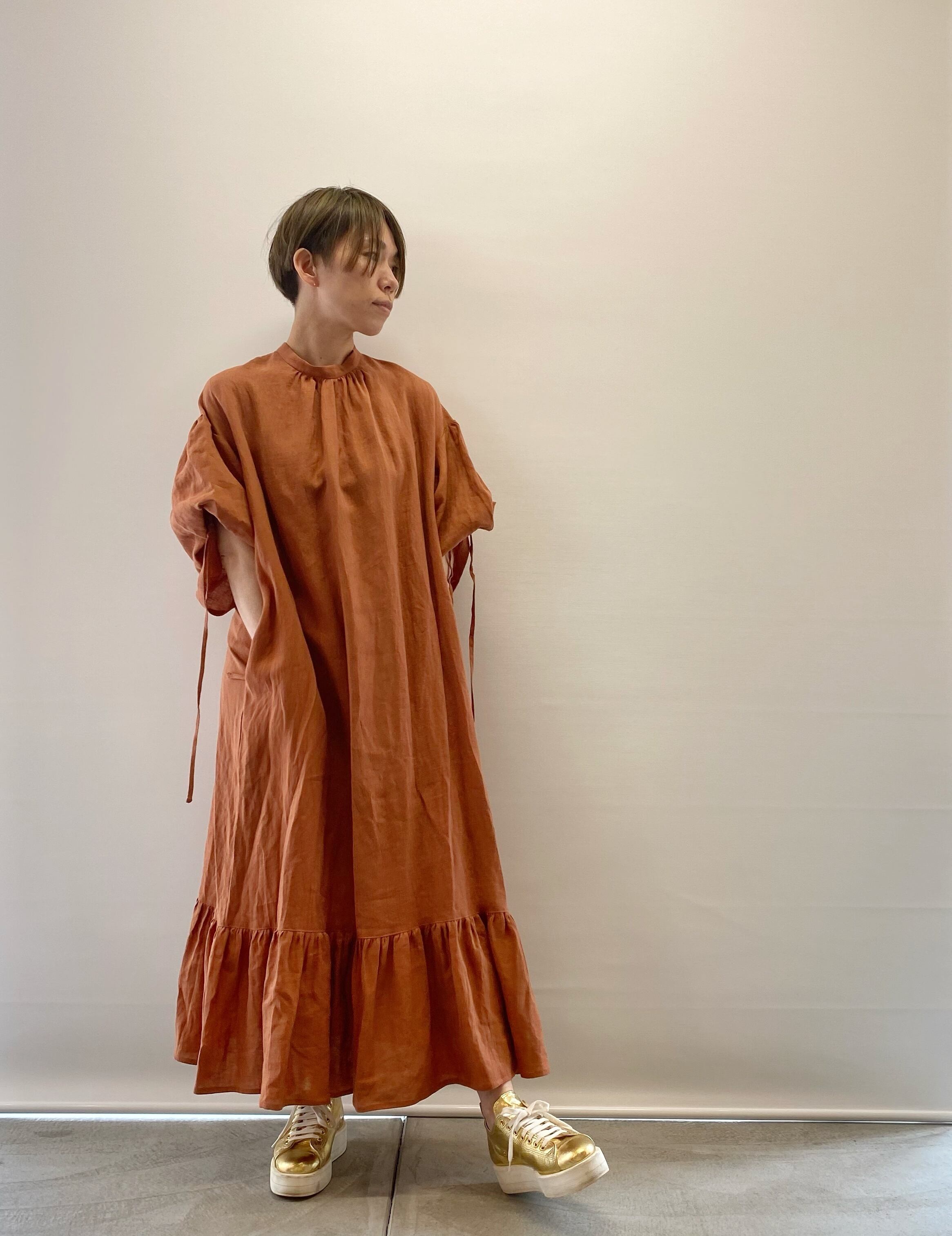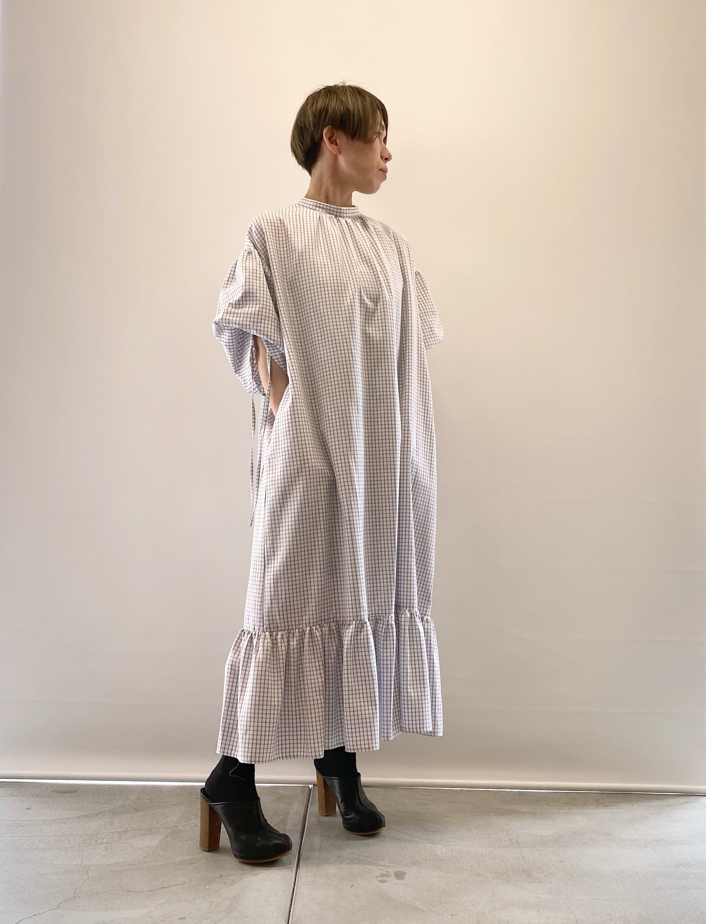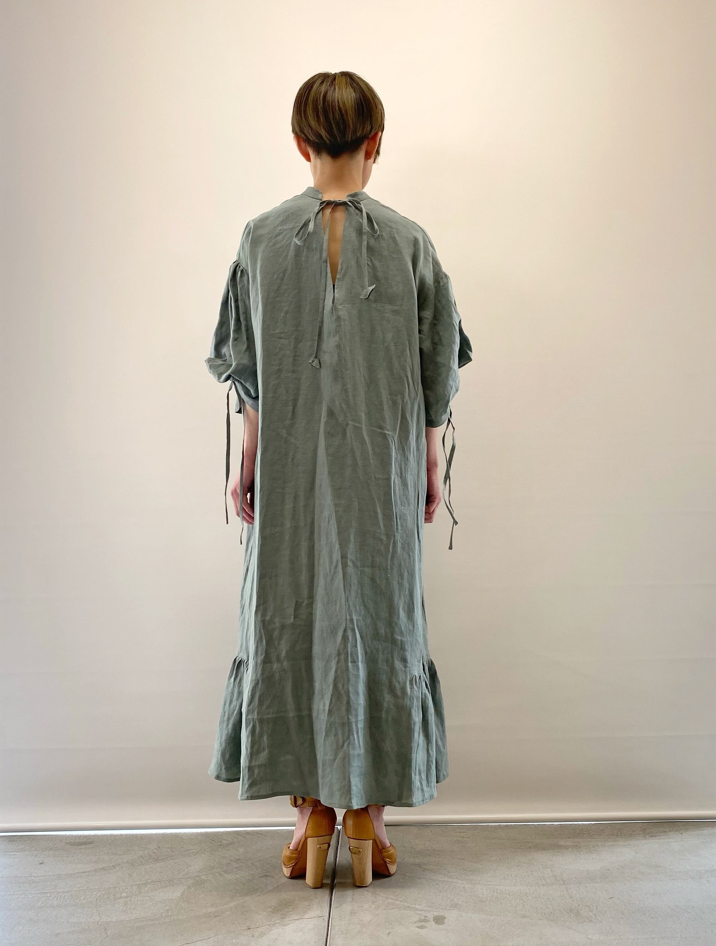 袖、裾にギャザーを入れたフェミニンなスタンドカラーワンピース。袖口には共地のヒモが入り、このヒモをしぼることにより、袖の形に変化を持たせることができます。さらに前後どちらでも着用できる便利なアイテムです。