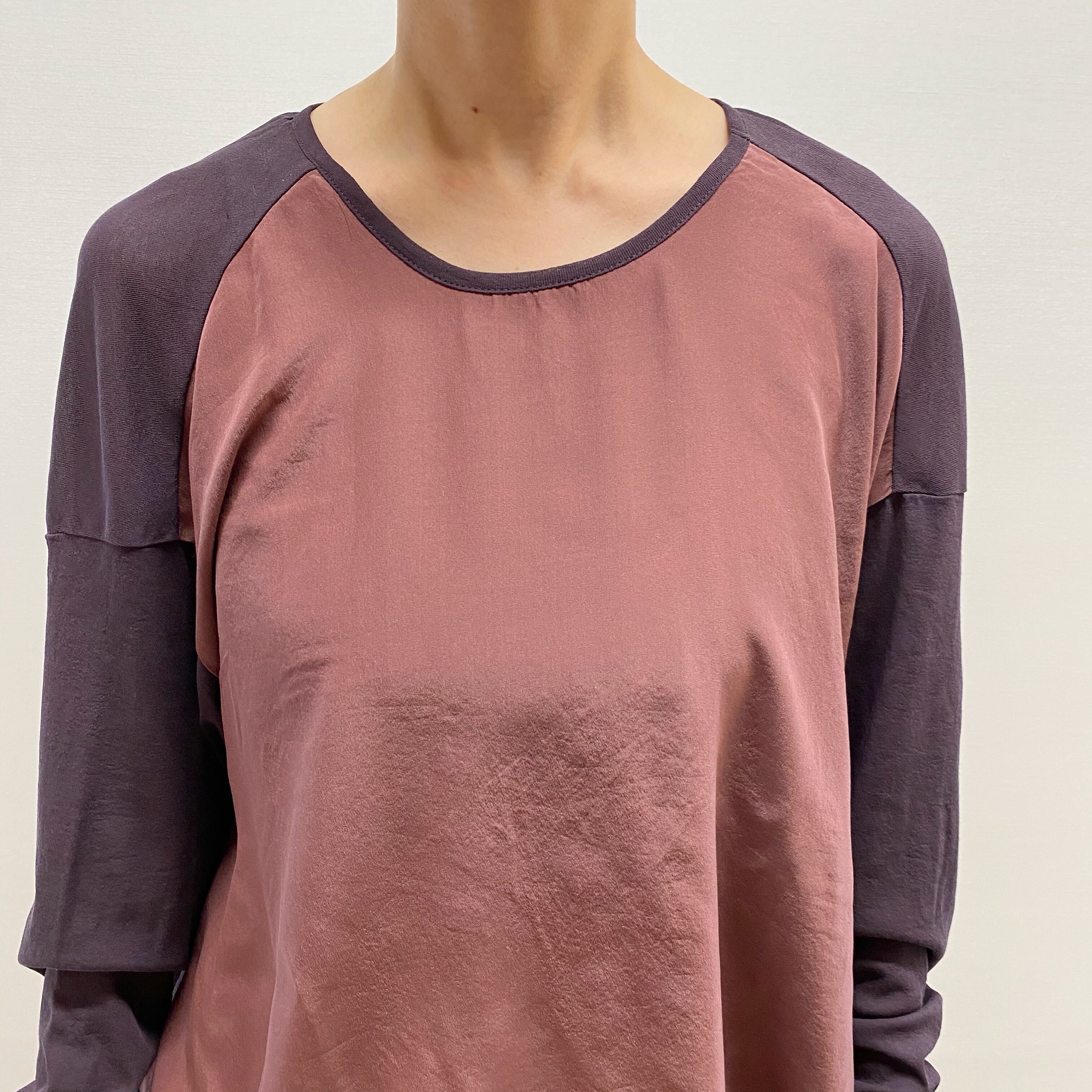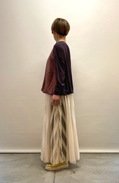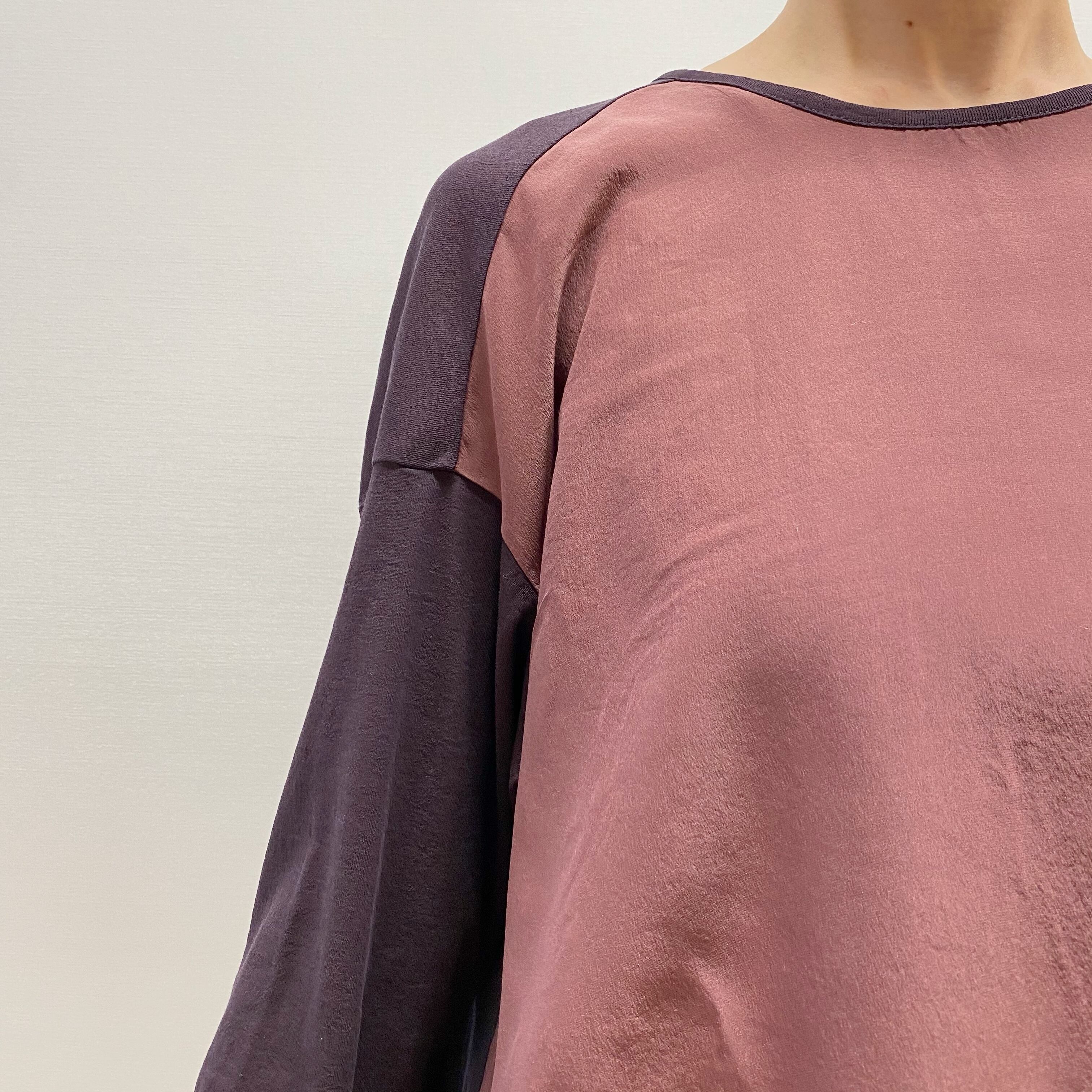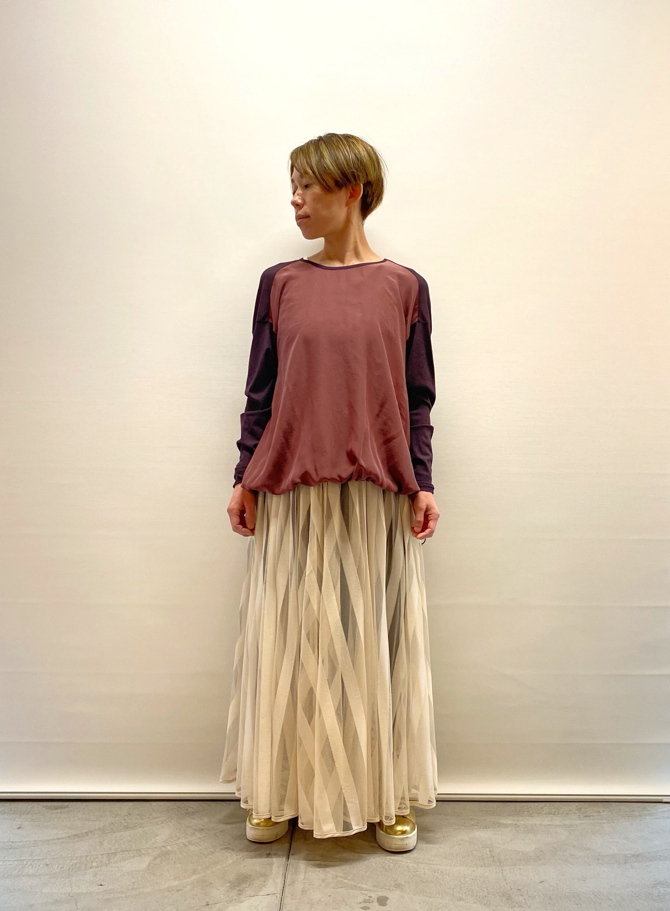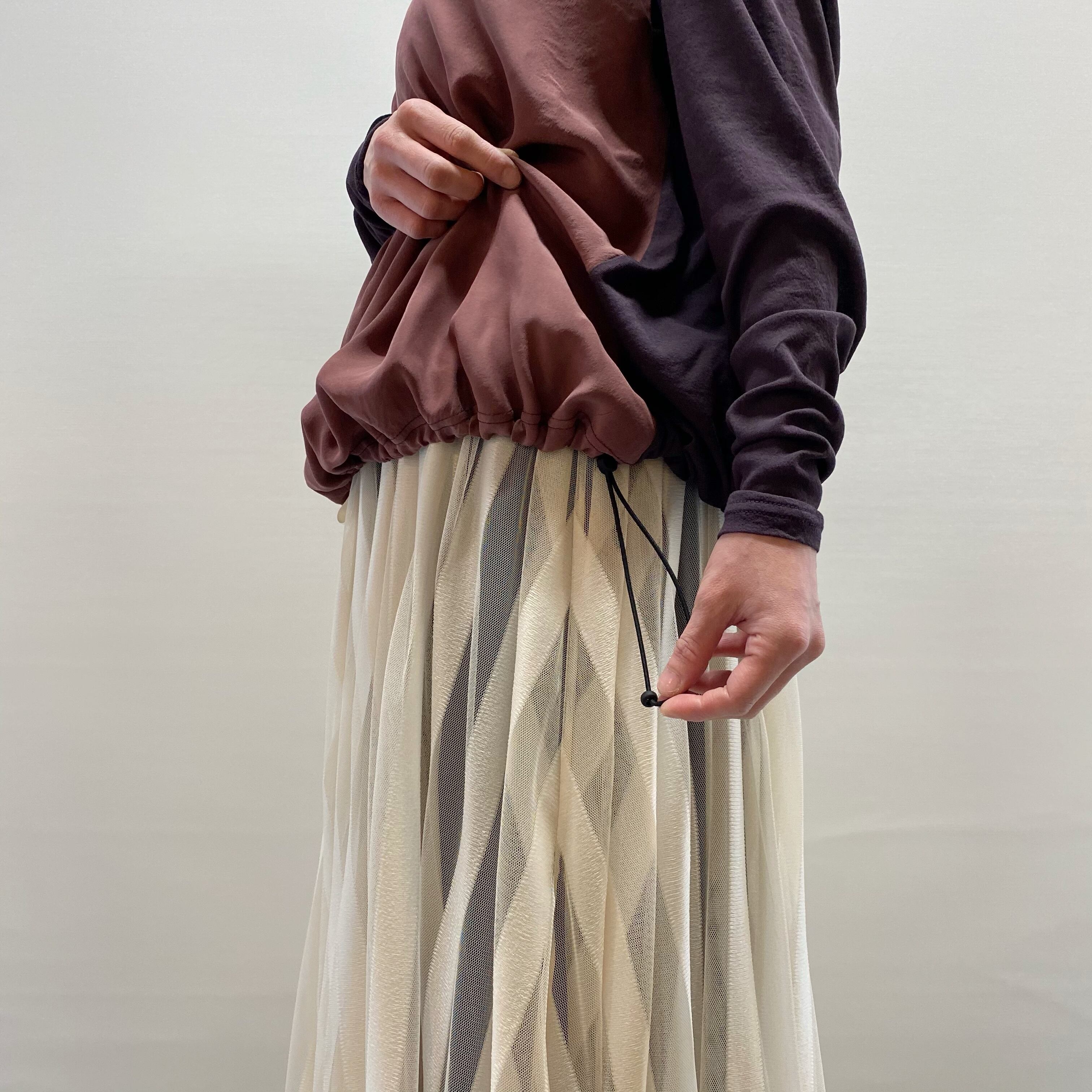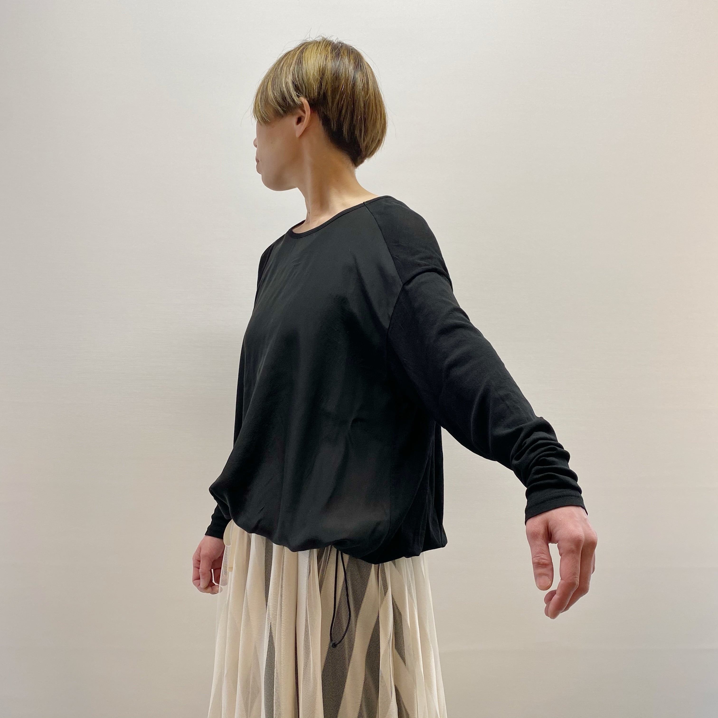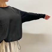 前身をシルクにすることで、ブラウスのようにキレイ目に着用できるプルオーバーです。裾のストリングスが、ヒップラインをきれいに見せてくれるアクセントになります