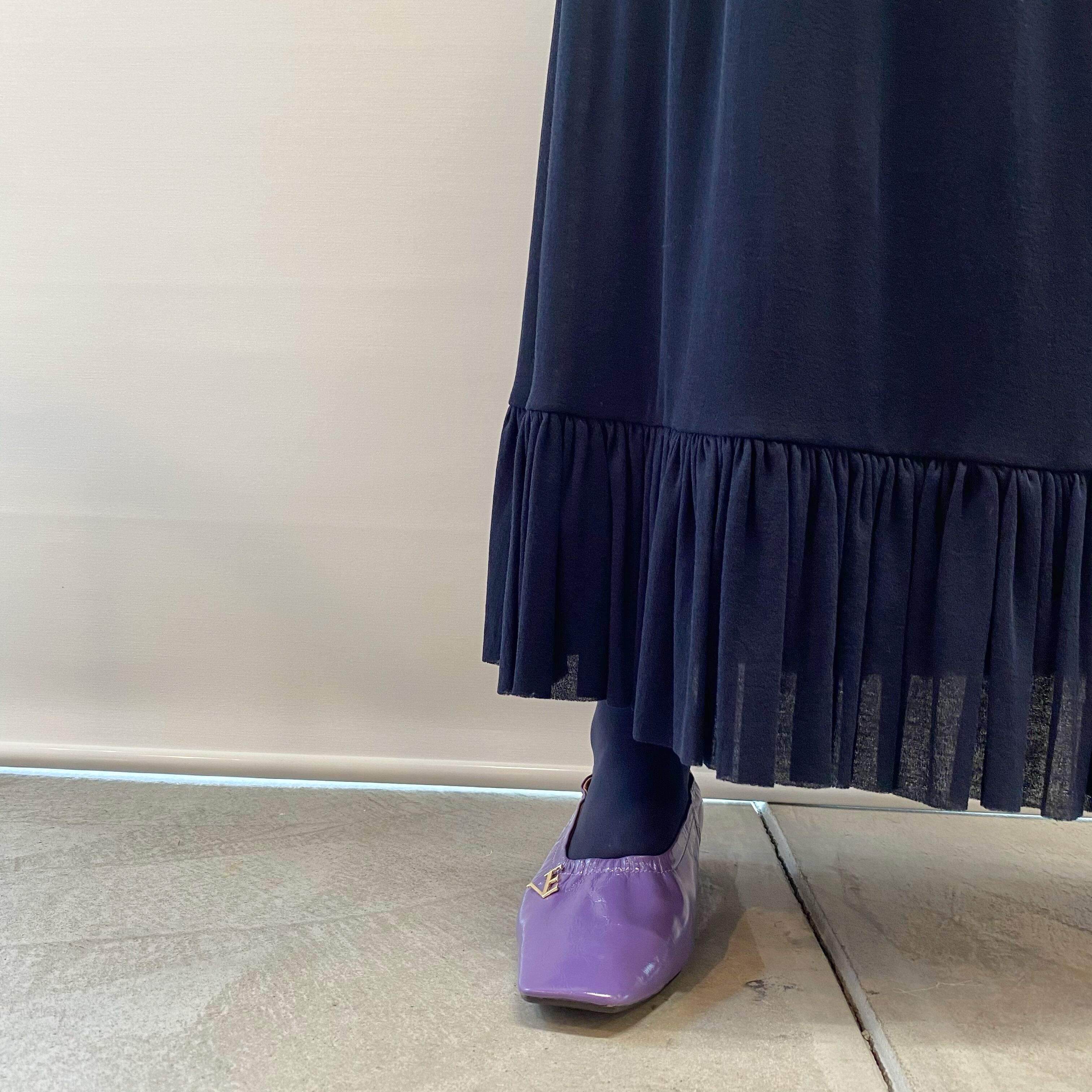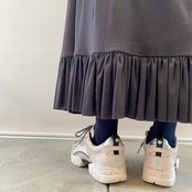 裾にたっぷりのギャザーをデザインすることで、さらに落ち感の美しいシルエットを生み出しました。歩くたびに揺れるスカートの裾がとても可愛いいです。