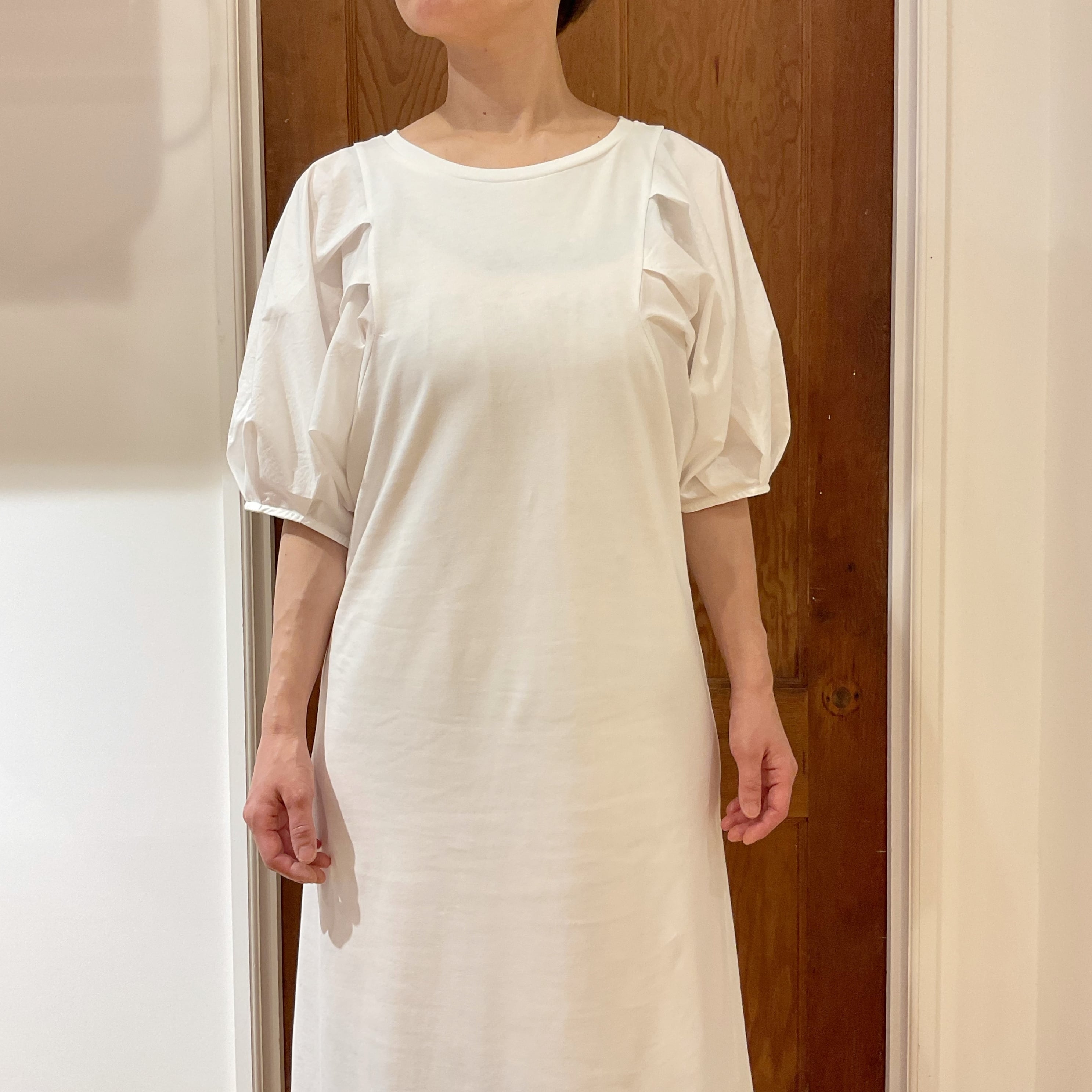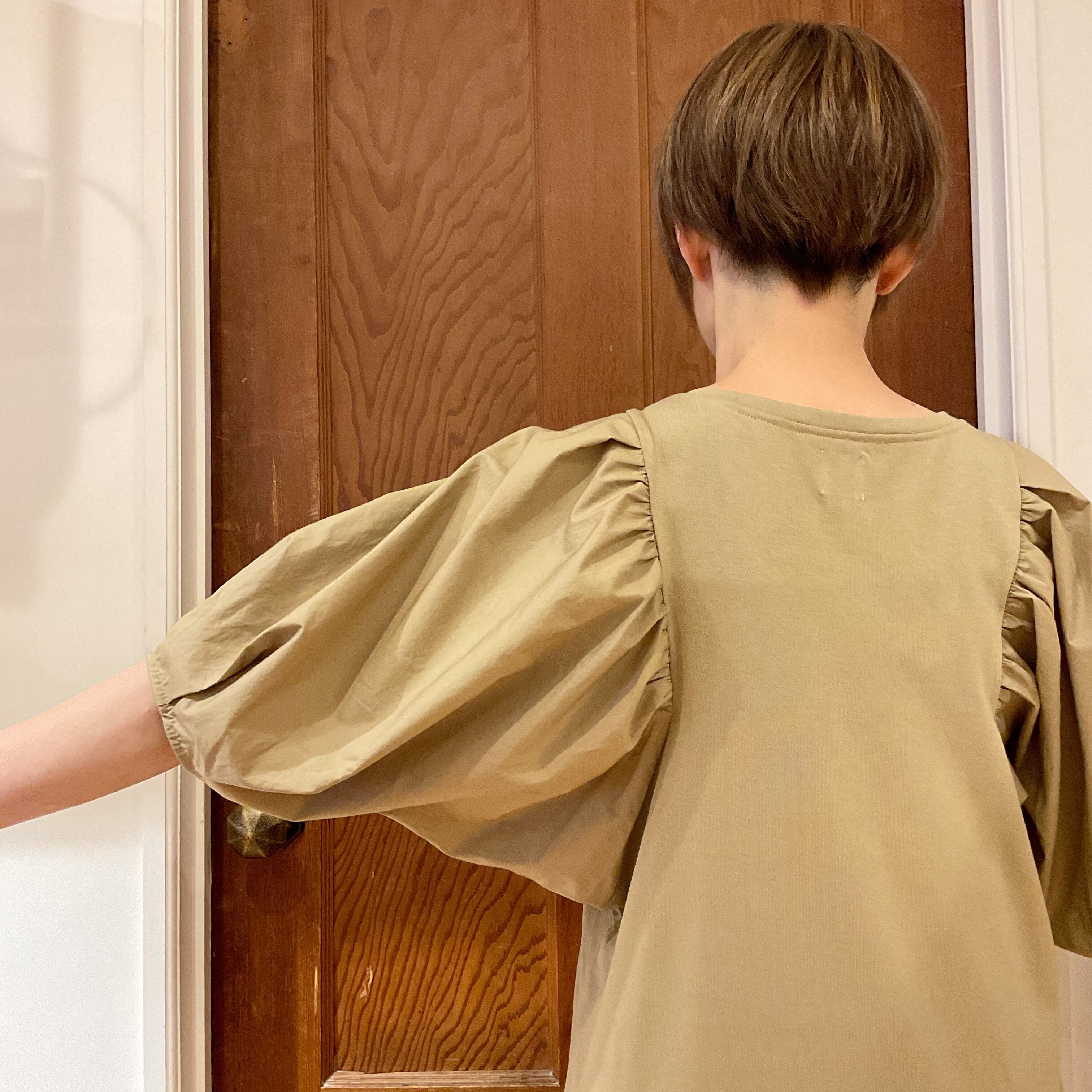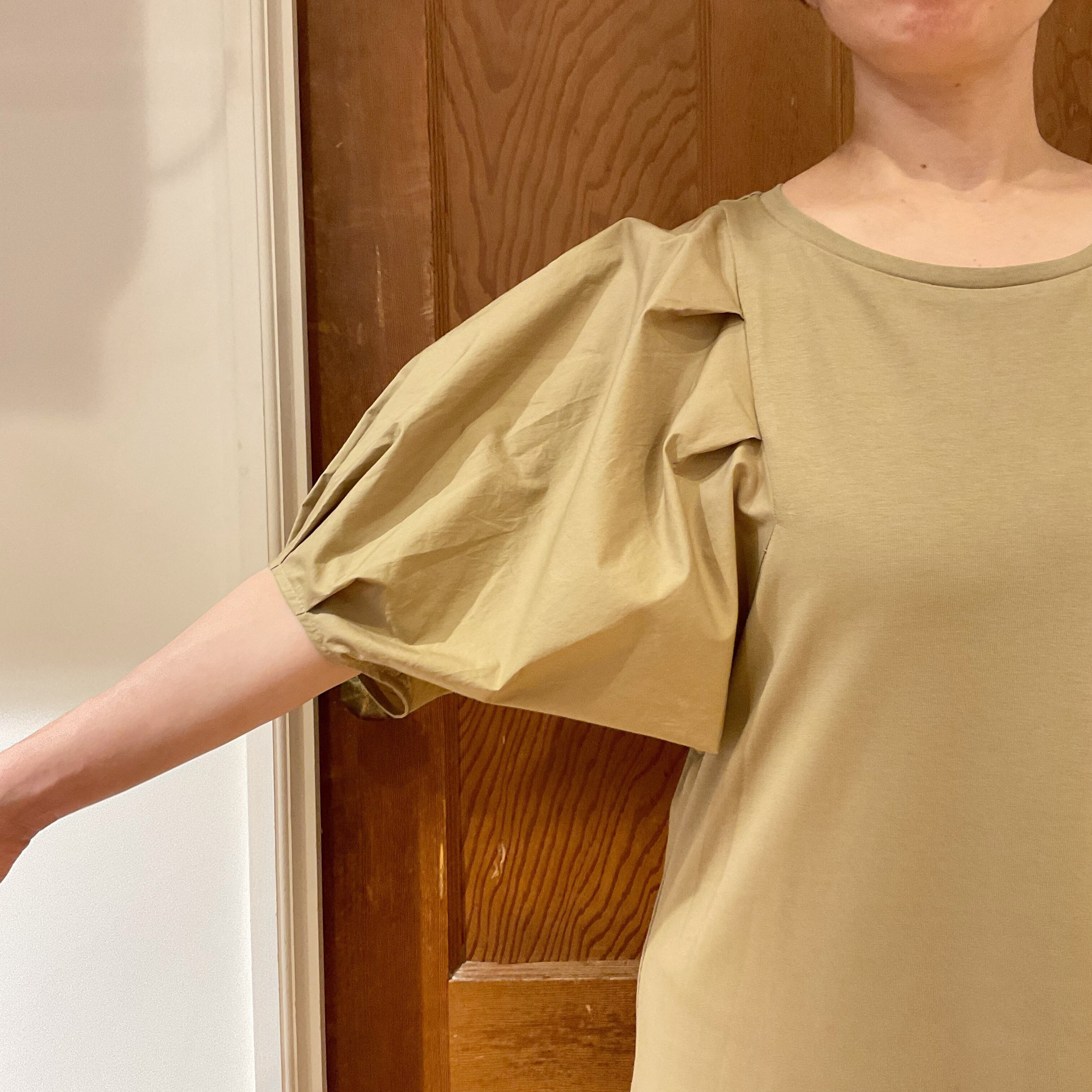 <Design Detail> 身頃はカットソー、ボリュームのお袖は布帛生地のドッキングワンピ