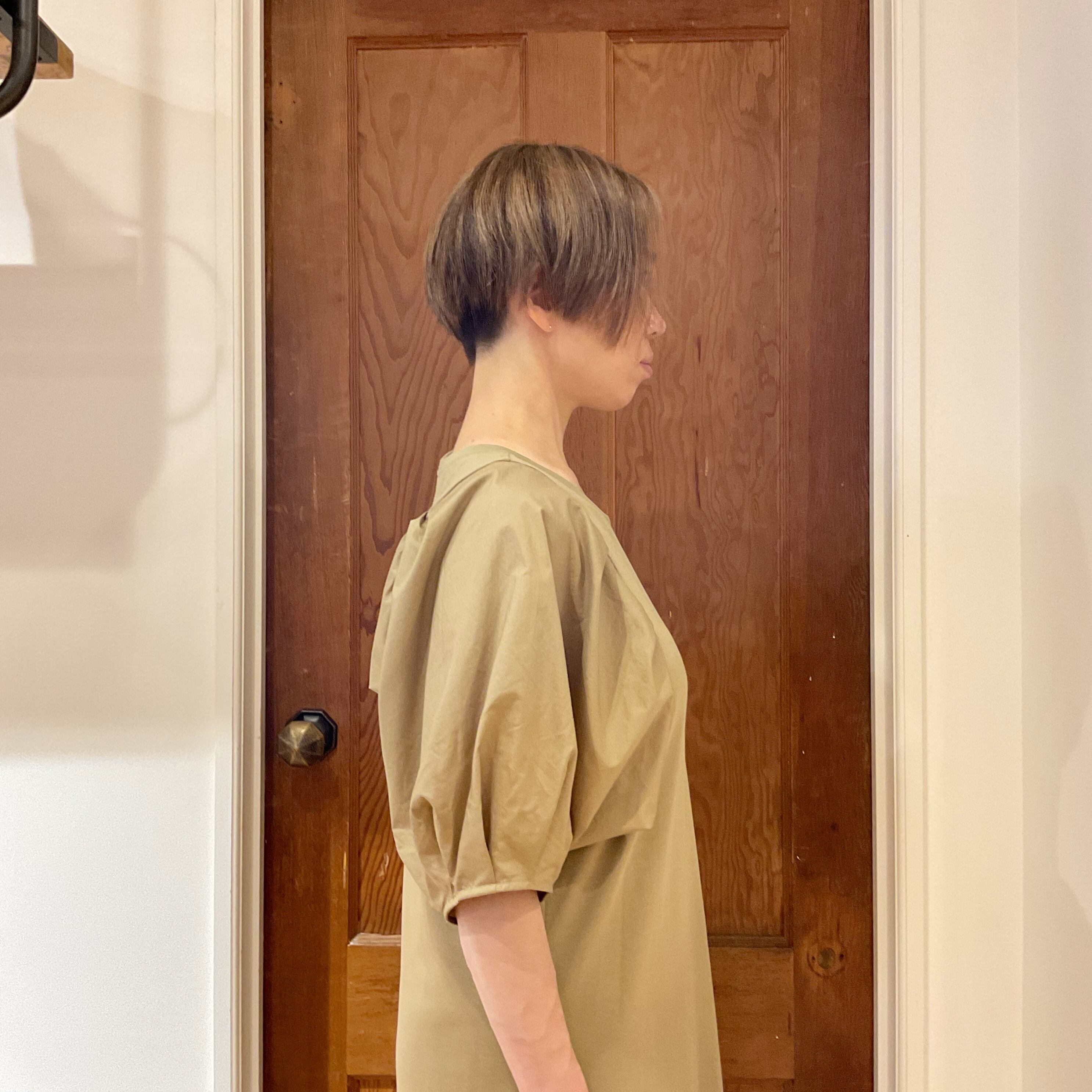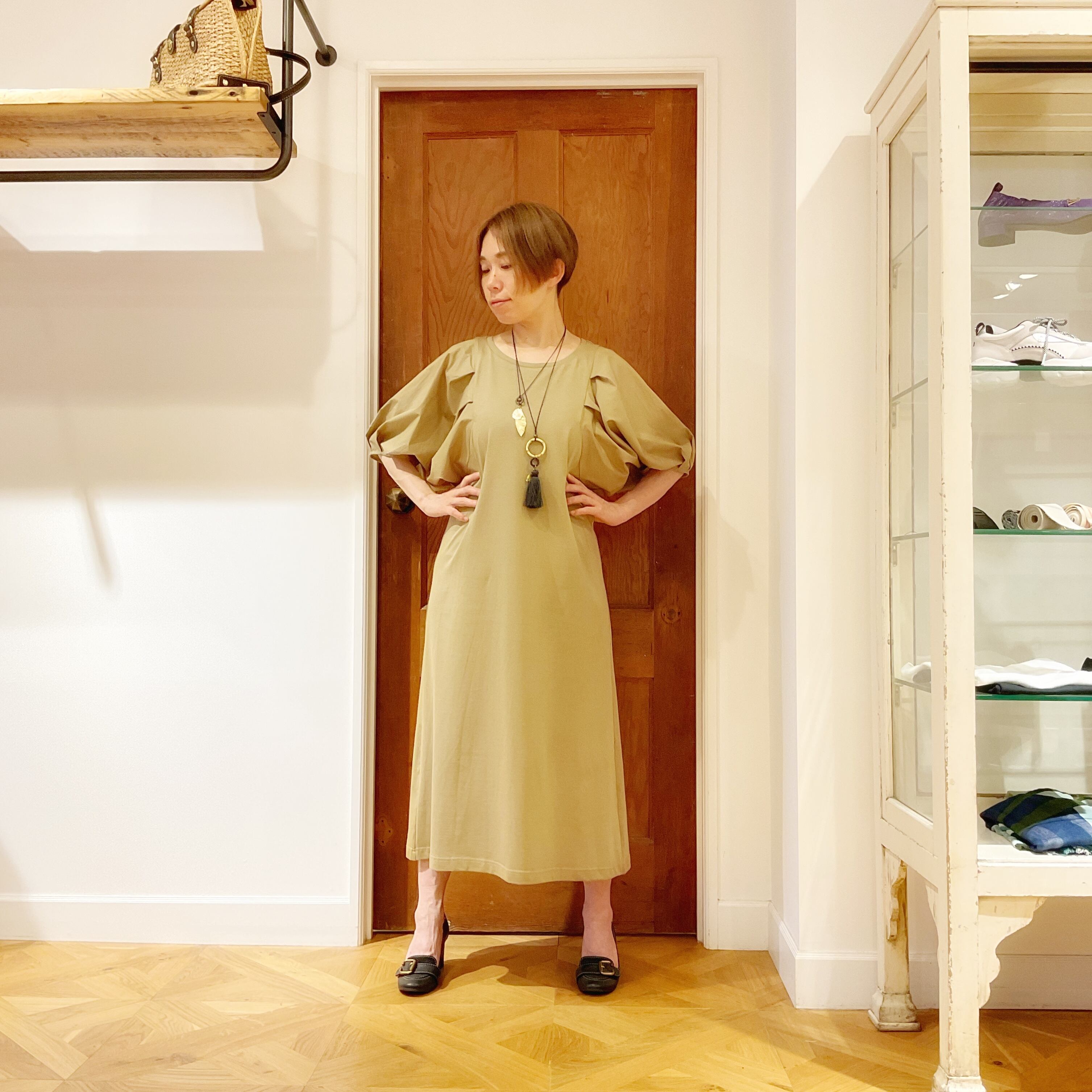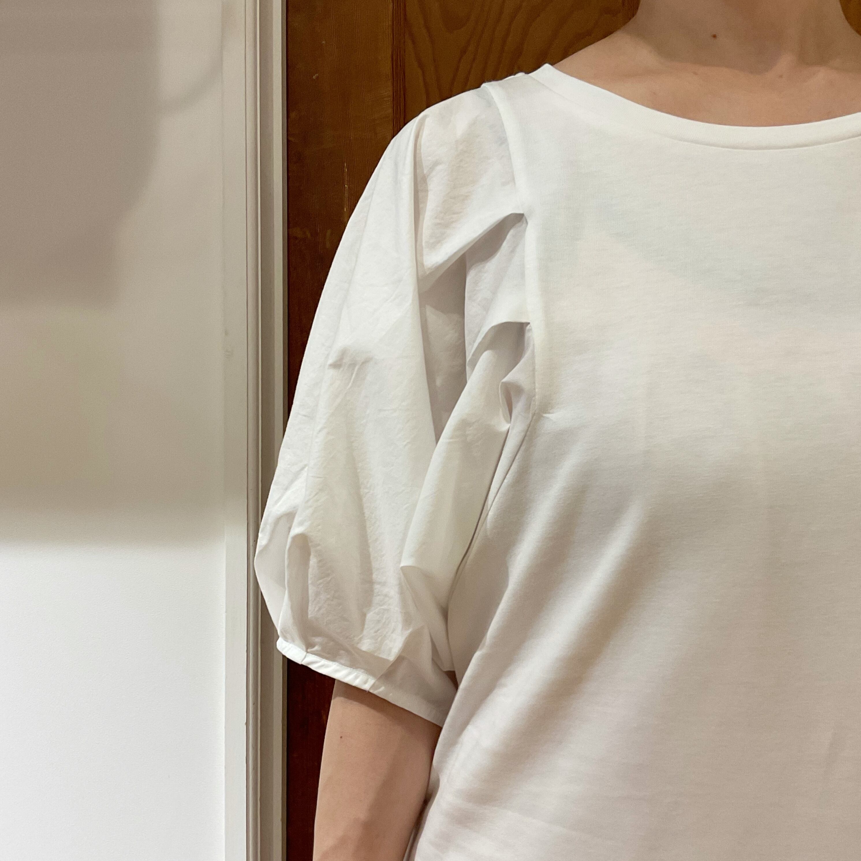 <Design Detail> 身頃はカットソー、ボリュームのお袖は布帛生地のドッキングワンピ