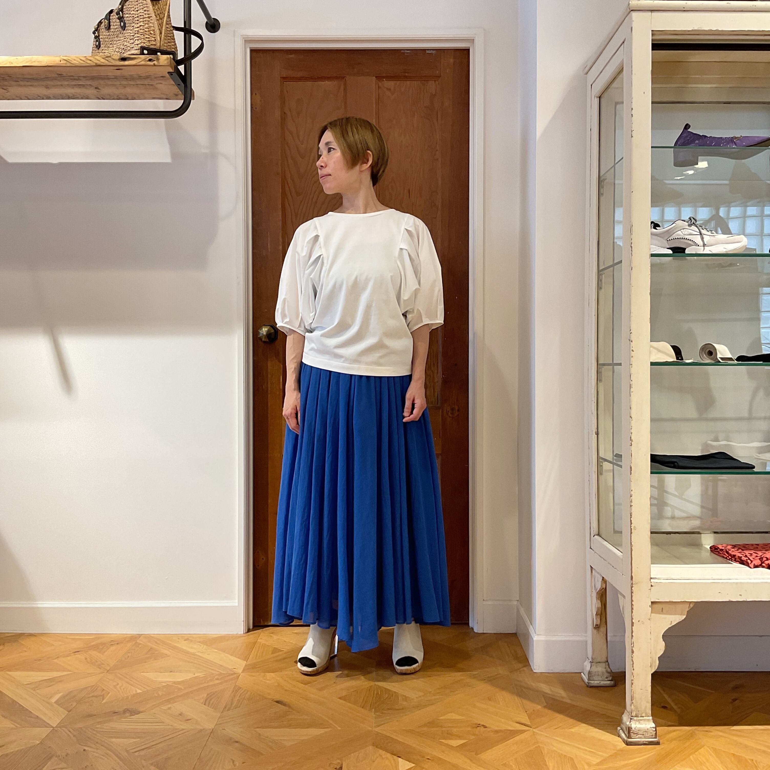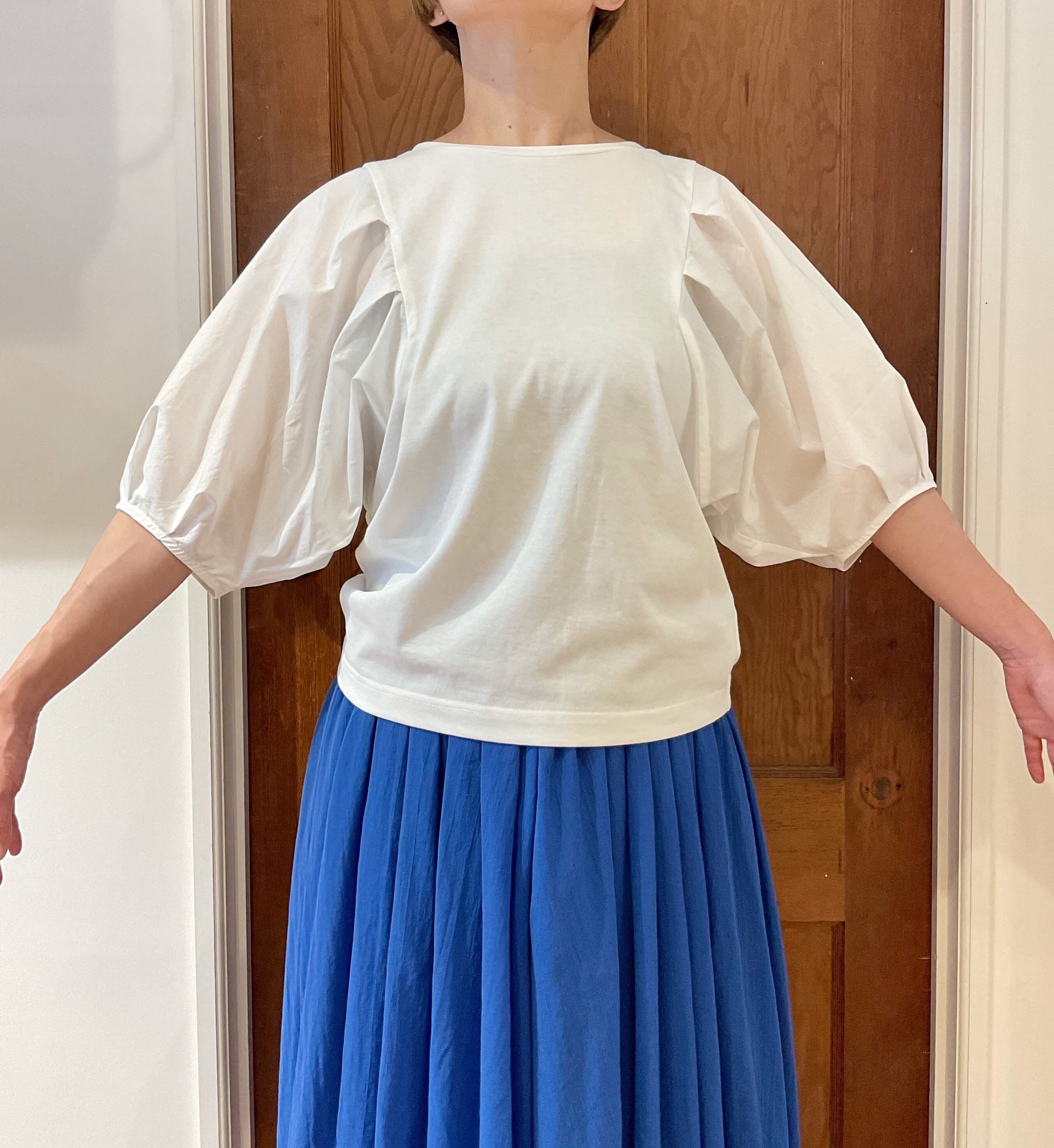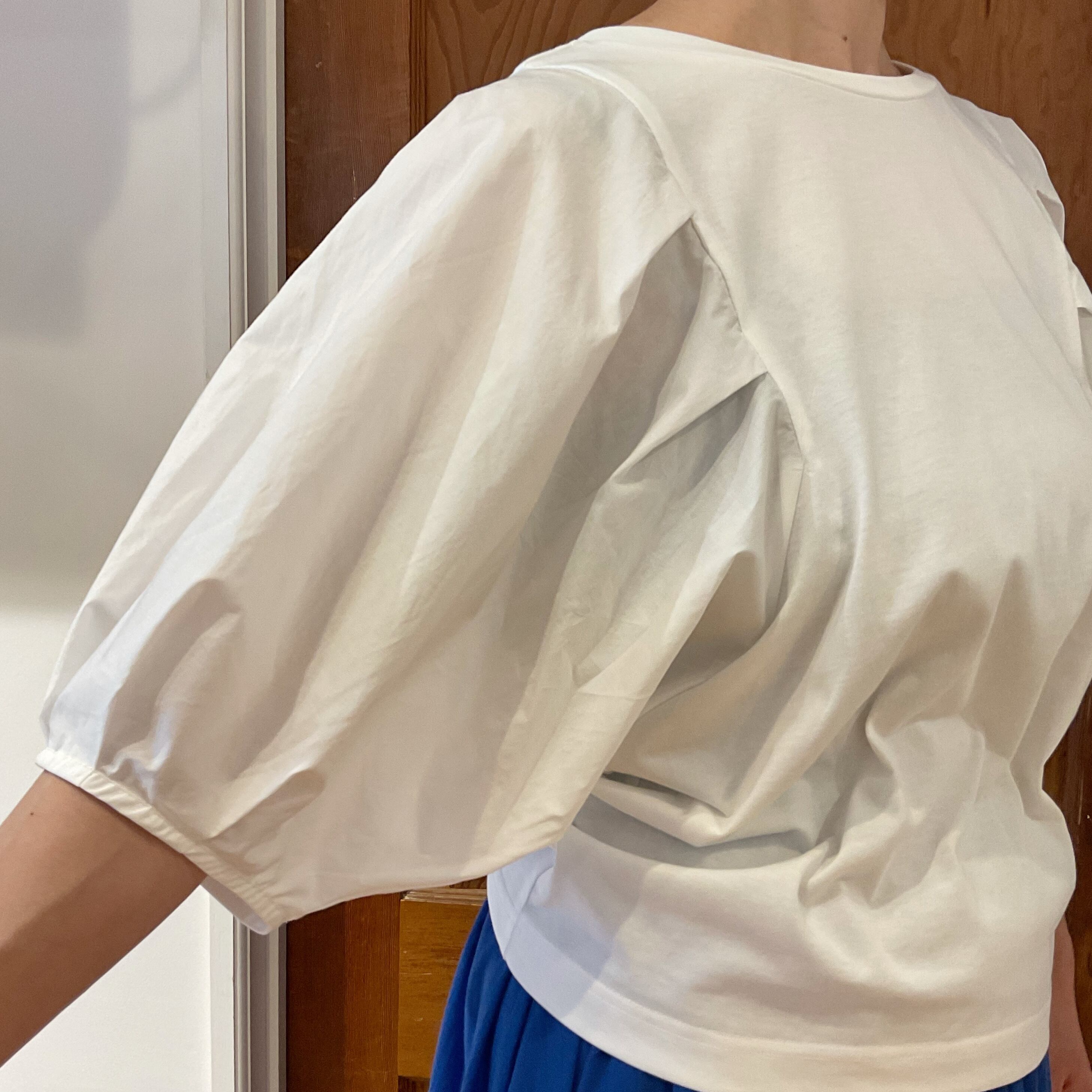 今年らしいボリューム袖。前後のタックの取り方を変えることで、より立体的なシルエットに