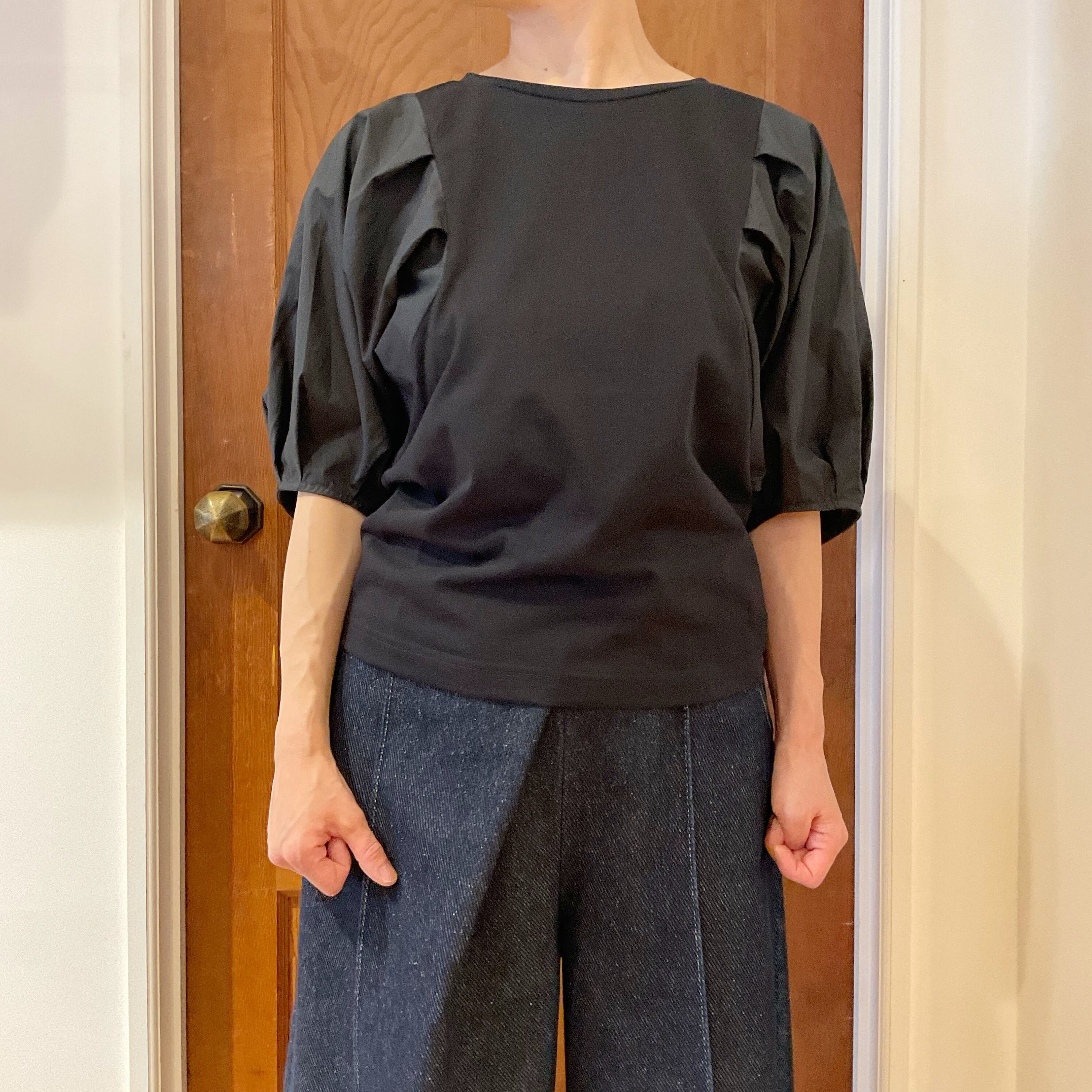 <Design Detail> ボディーは綿100%のカットソー、袖は綿100%シャツ素材のドッキングトップ。