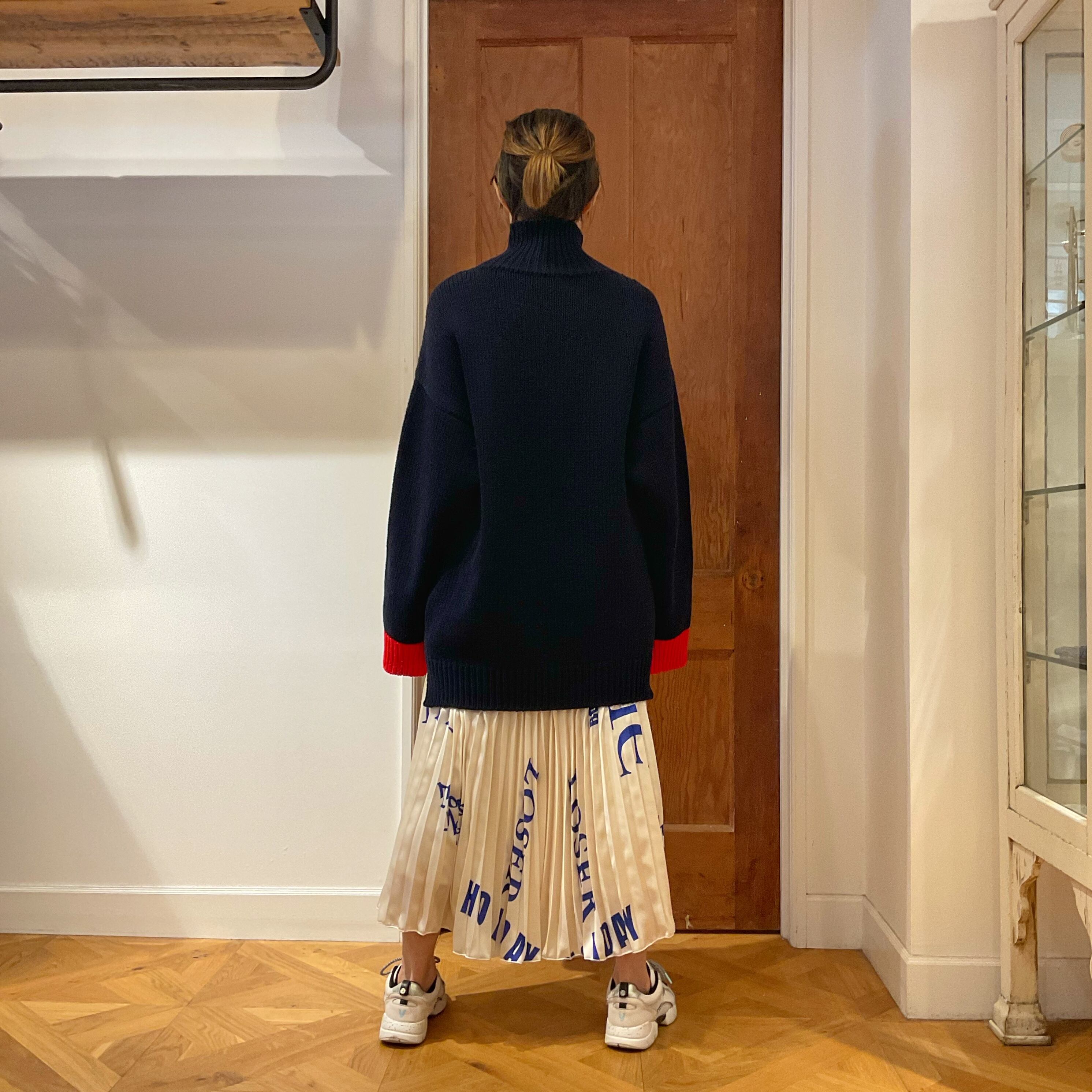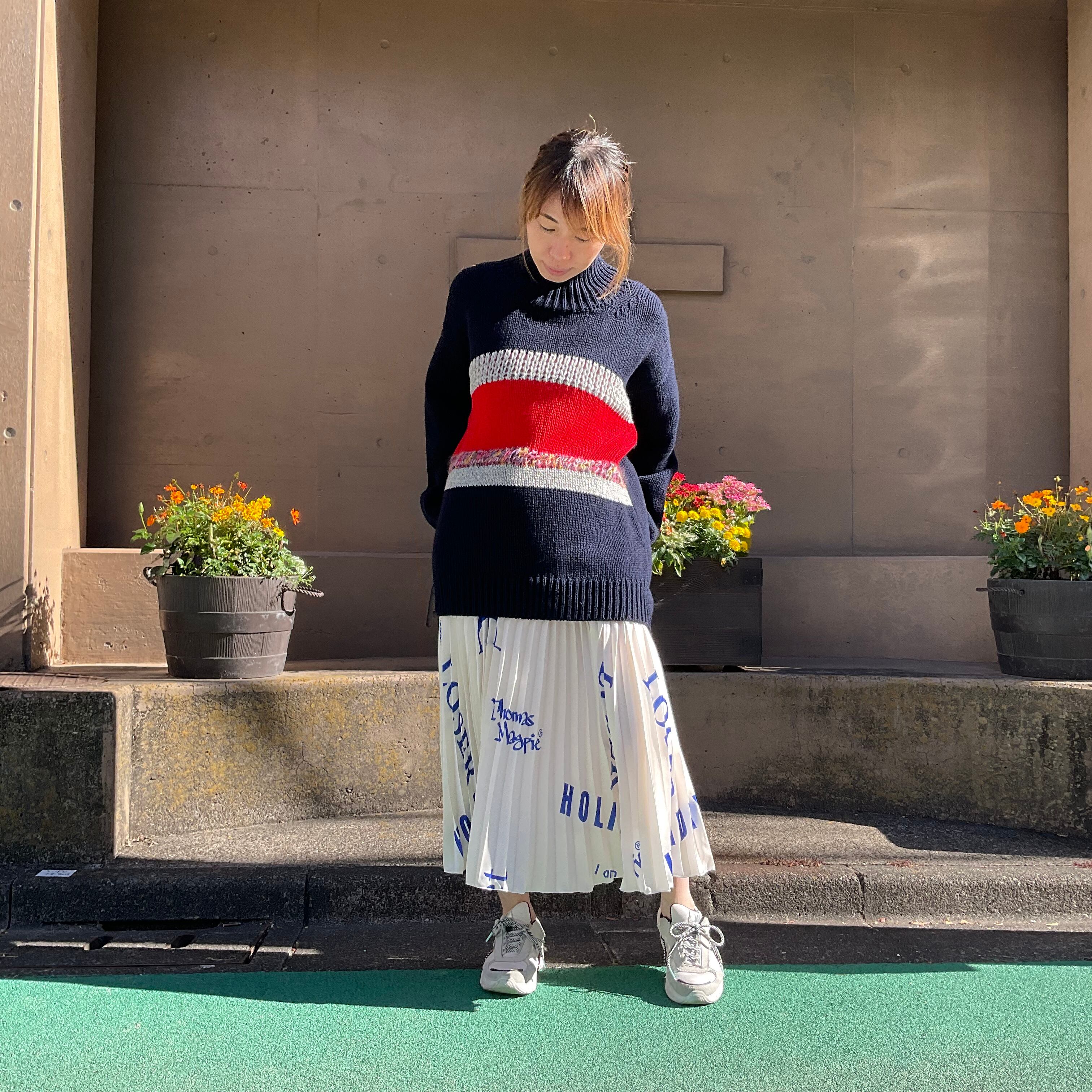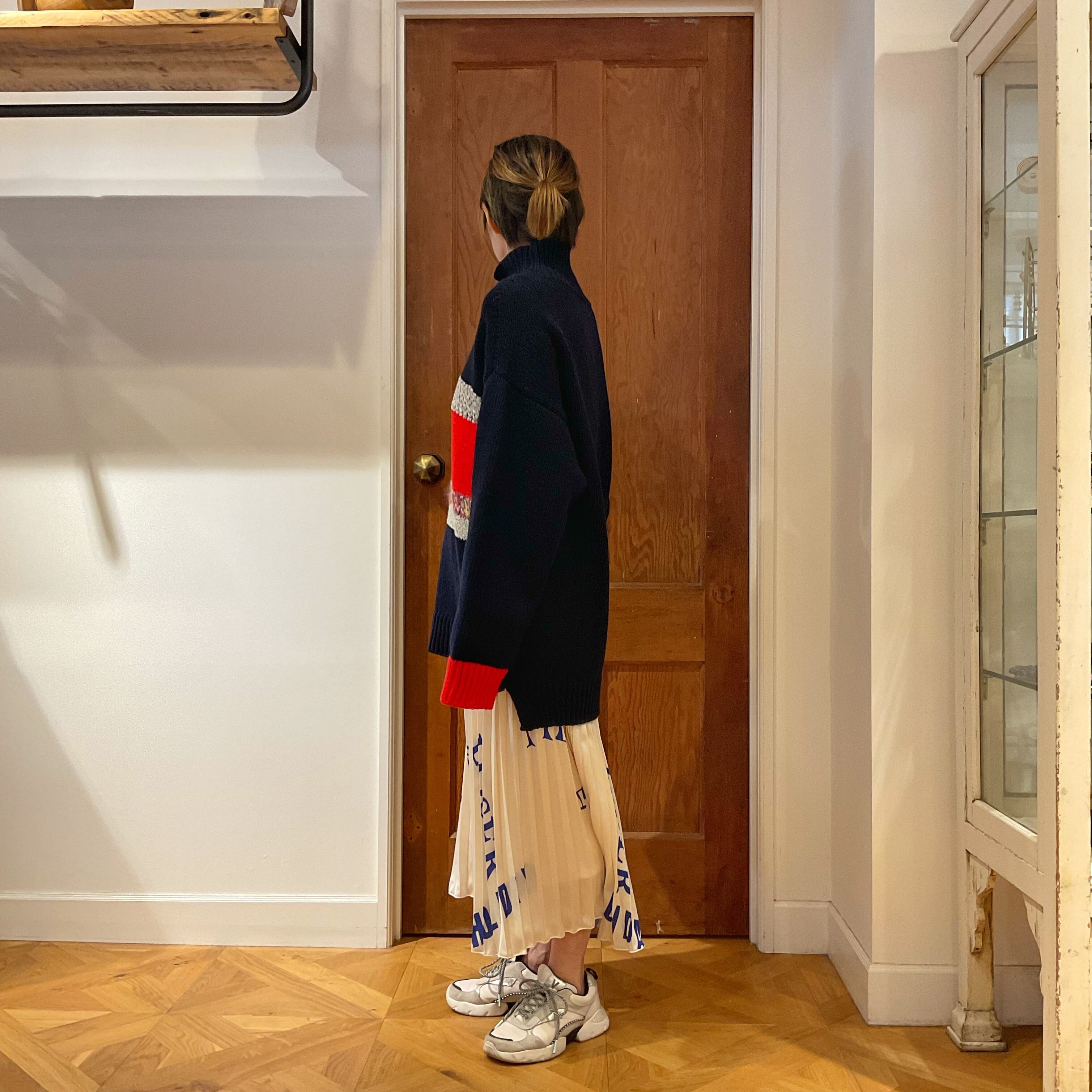細身のパンツは鉄板ですが、今年は小柄な方も長身の方もロングスカートやプリーツスカートでゆるく着るのもおすすめ!
