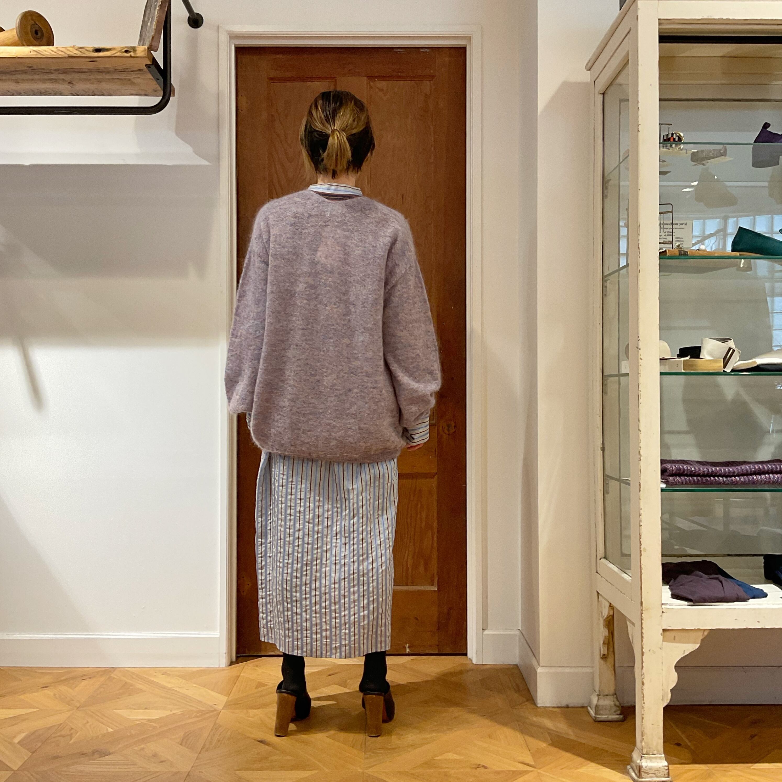 「普遍的な女性の気品を導きだすデイリーウエア」をコンセプトに掲げる京都ブランドs:m(シーム)。生地の見た目の華やかさや特徴あるデザインというよりは、実際に袖を通した時の素材感や収まり感、体が動いた時にどう見えるかを大切にしています。デザイナーさんは、展示会に行くと、完璧な首周りの幅やプリーツやタックの入れ方によるボリュームの収まり具合をいかに研究したかなどを、いつも一生懸命熱弁してくれますw