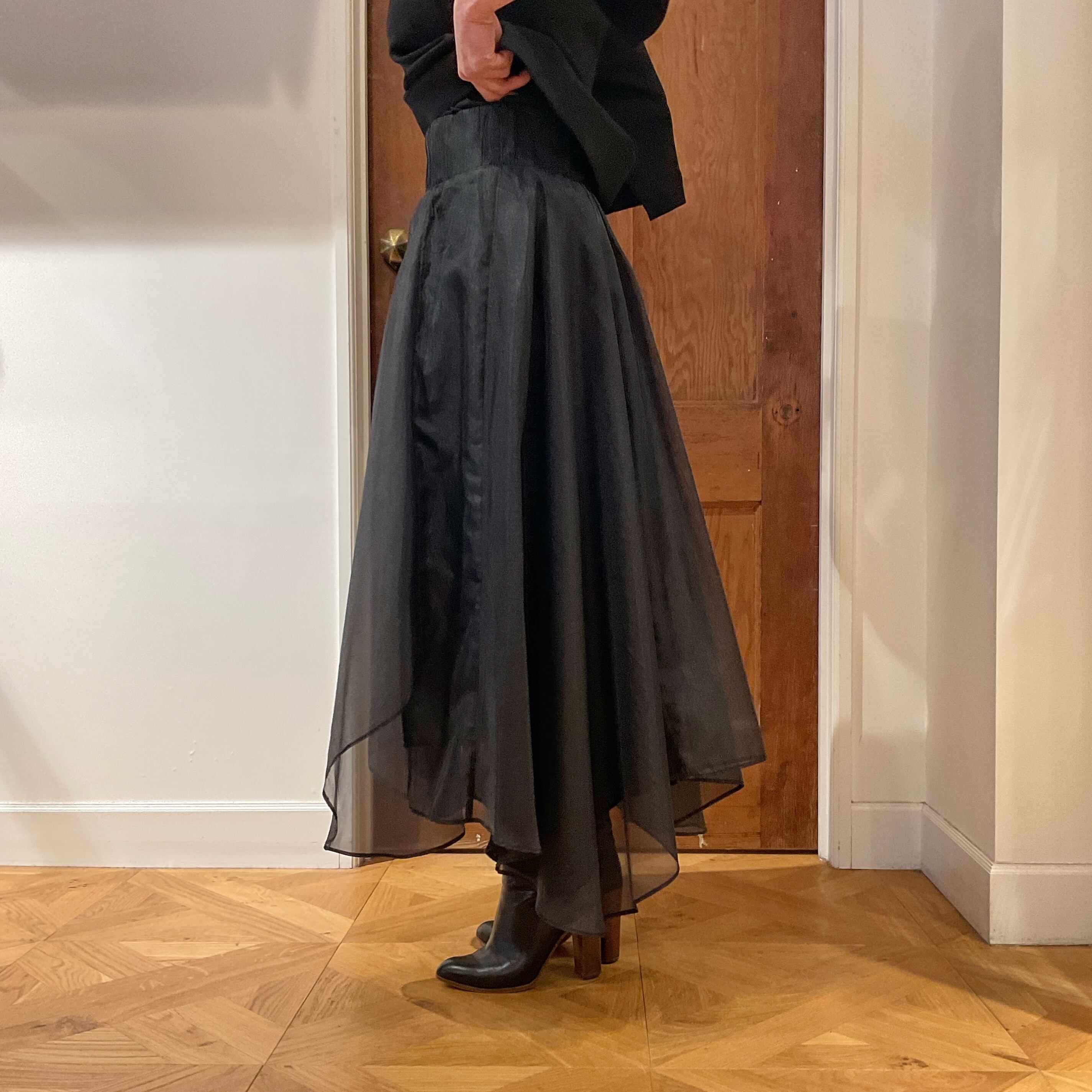 大胆な長短を付けたアシンメトリーのシルエットがdivkaらしいフレアスカート
