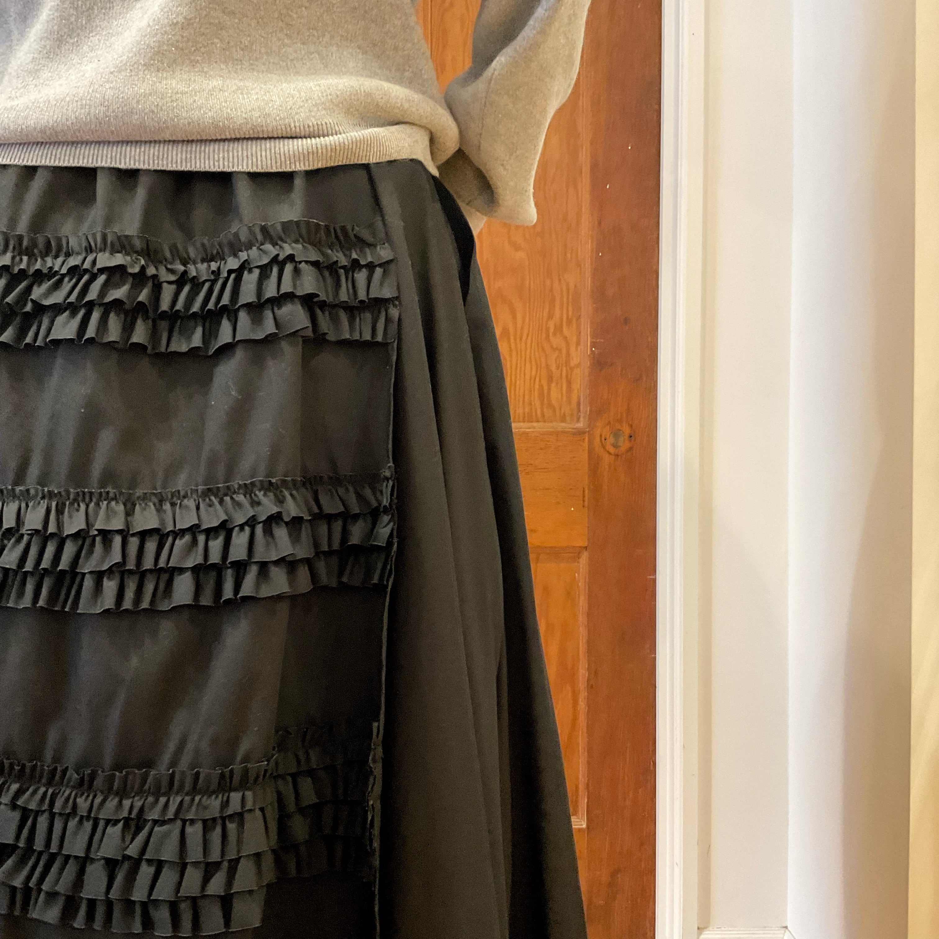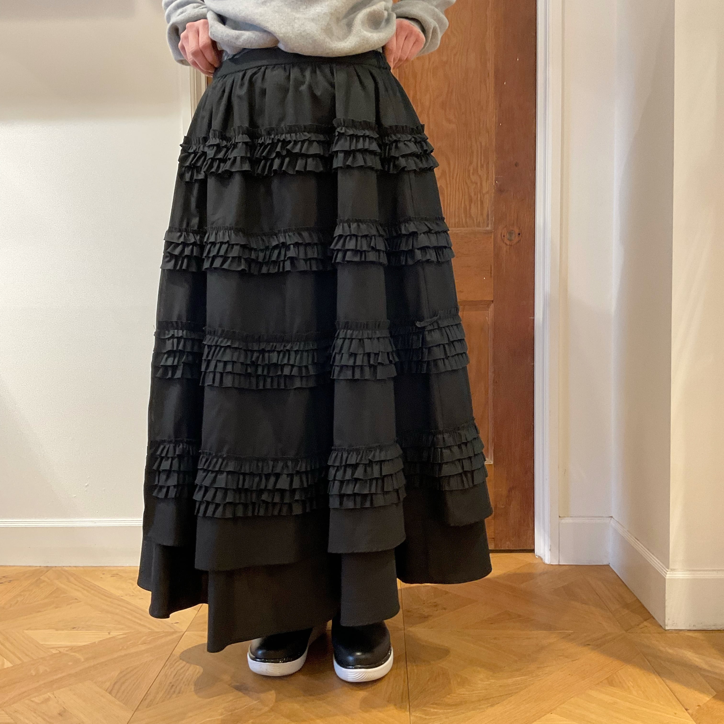 フリルがふんだんに使われた生地を、コットンの裏地に巻き付けたようなフレアスカート