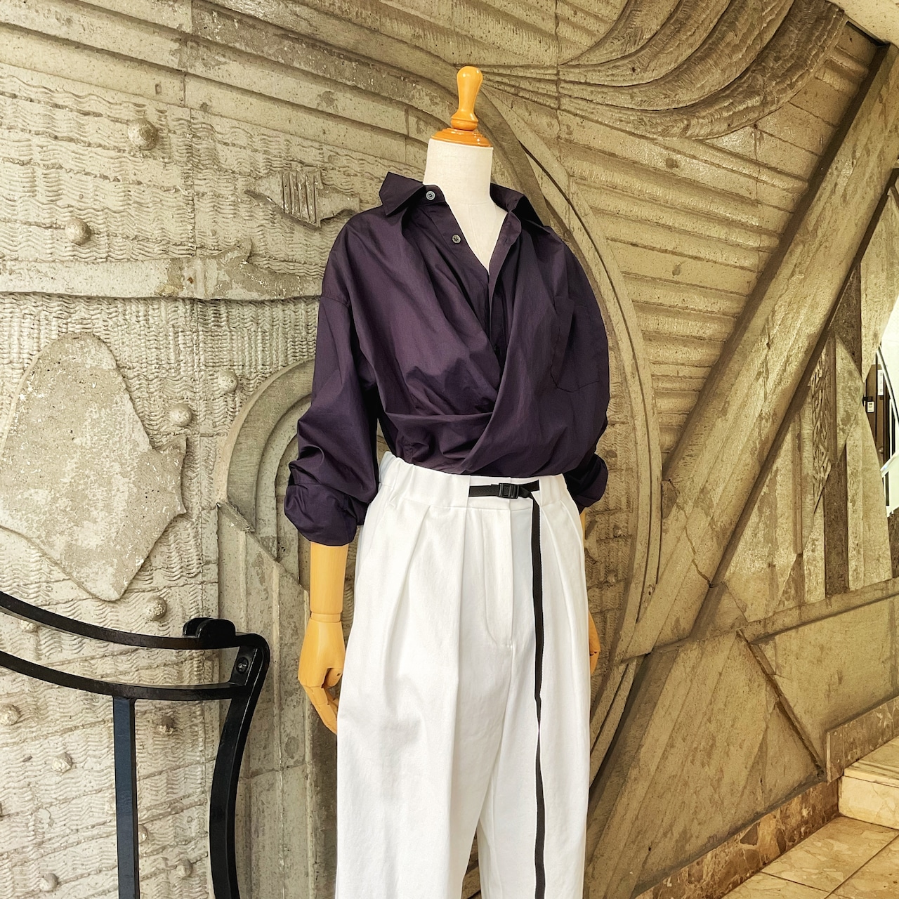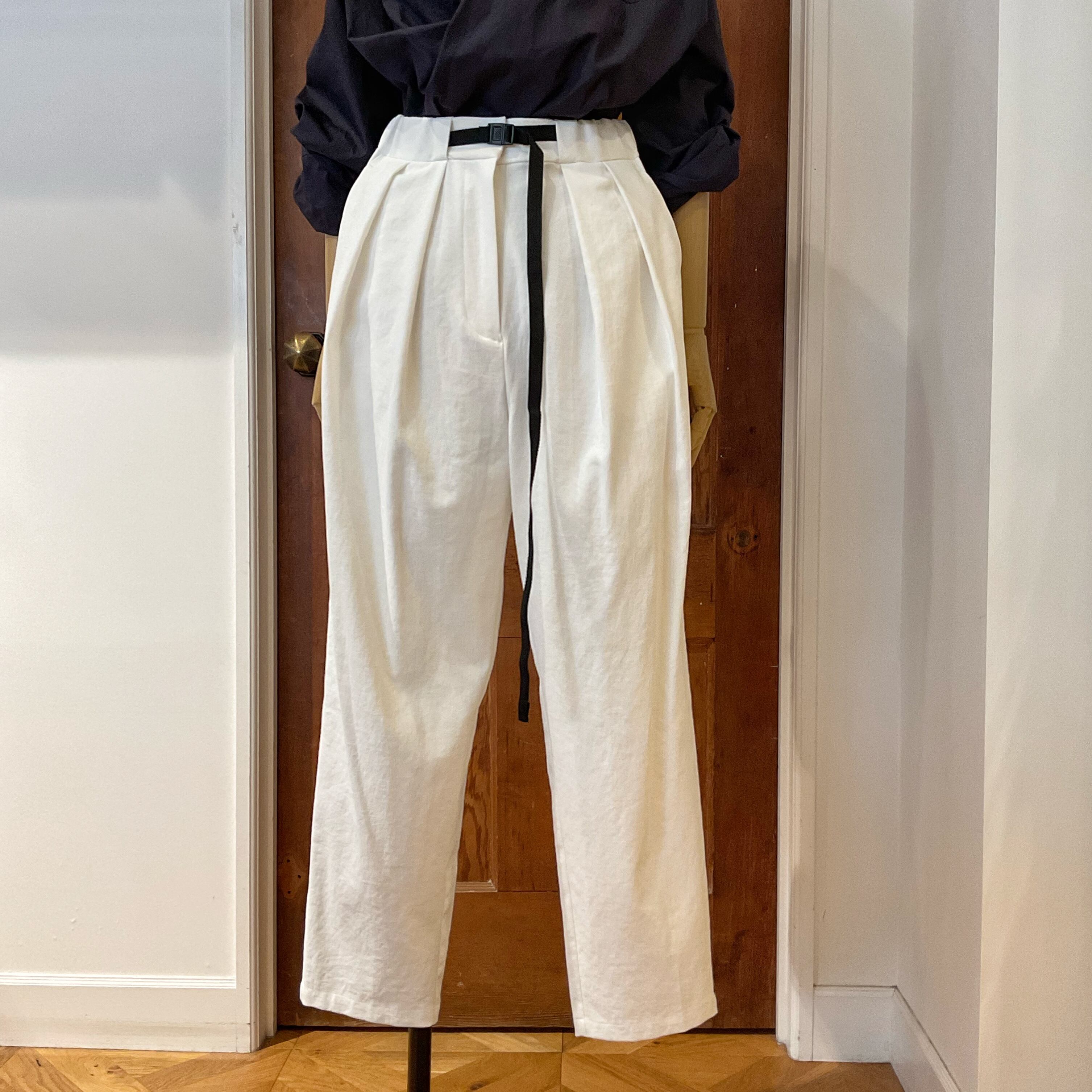 太ももからのタックが立体的で綺麗なので、トップスはコンパクトな丈のモノか、インして着るのがお勧め