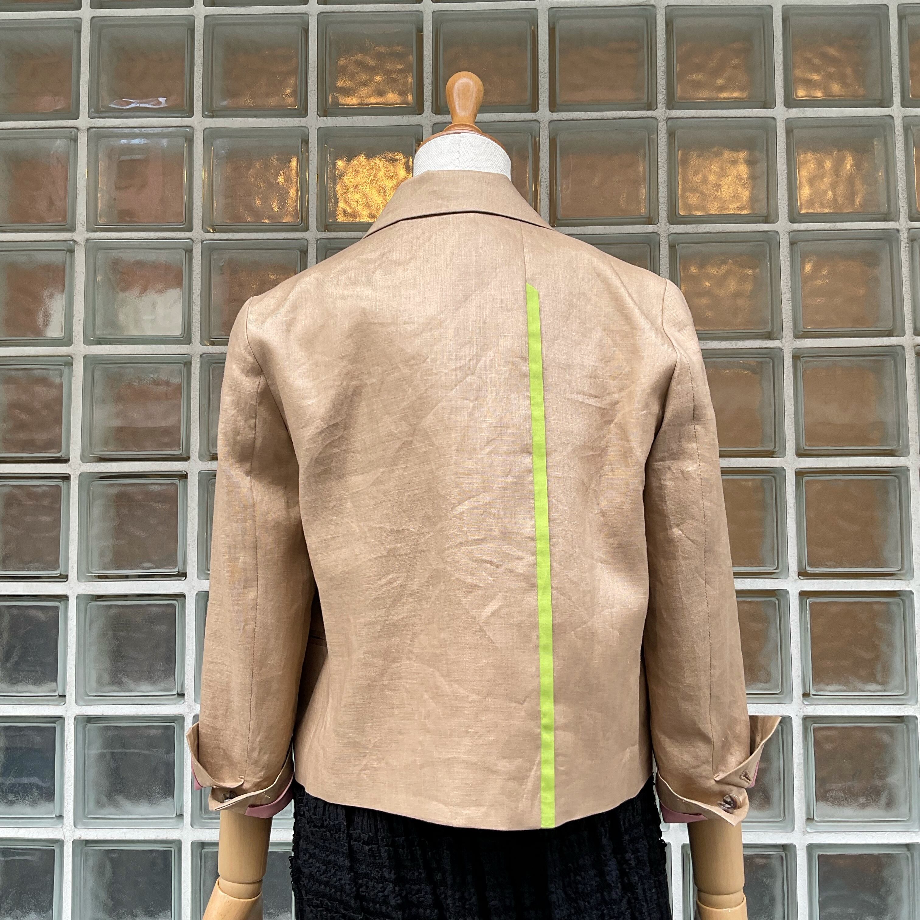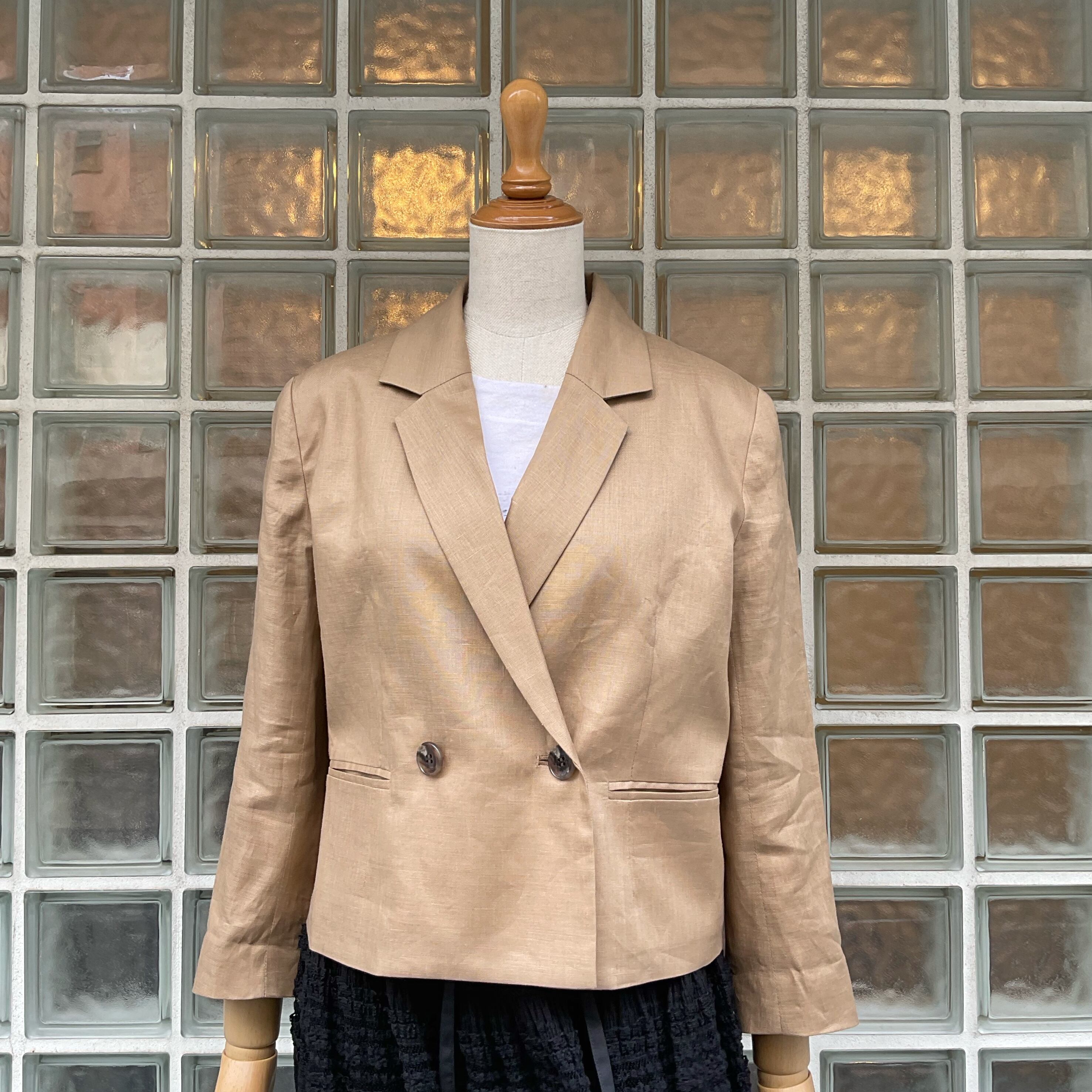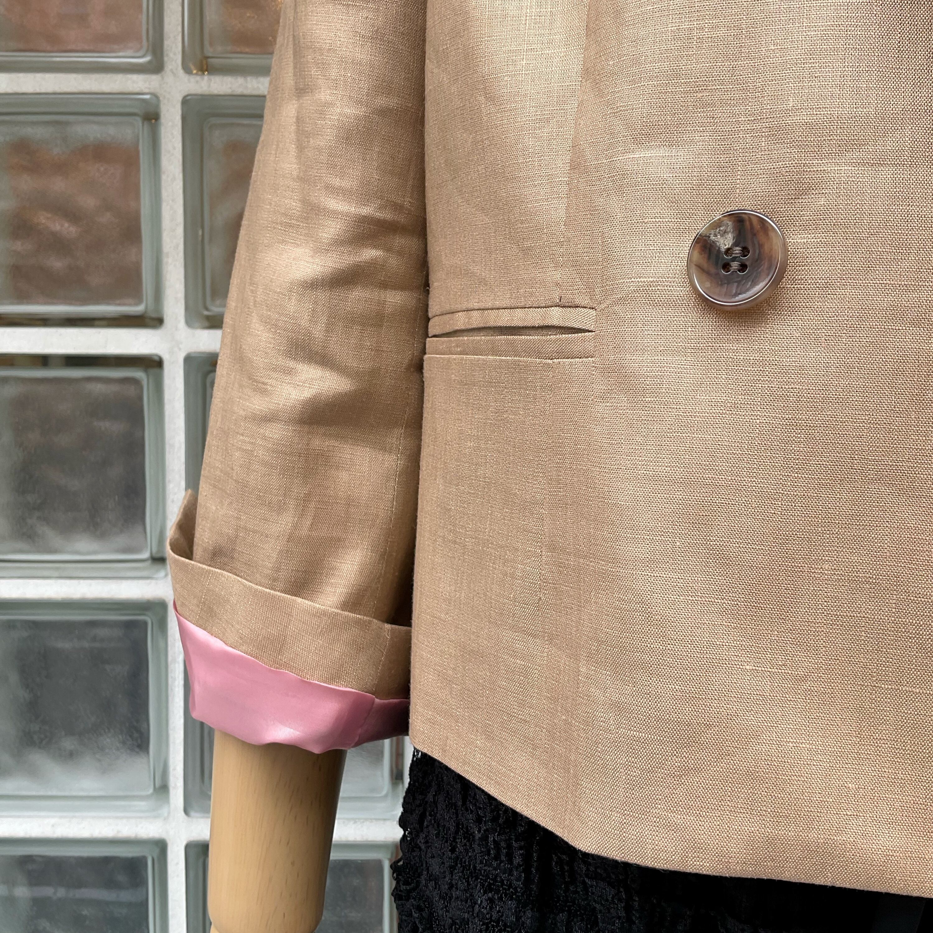 細めのテーラードに1つボタンのダブル仕立て、コンパクトな着丈で、ダブルでも重さの無い、カーディガンをサラッと羽織ってるような軽い雰囲気