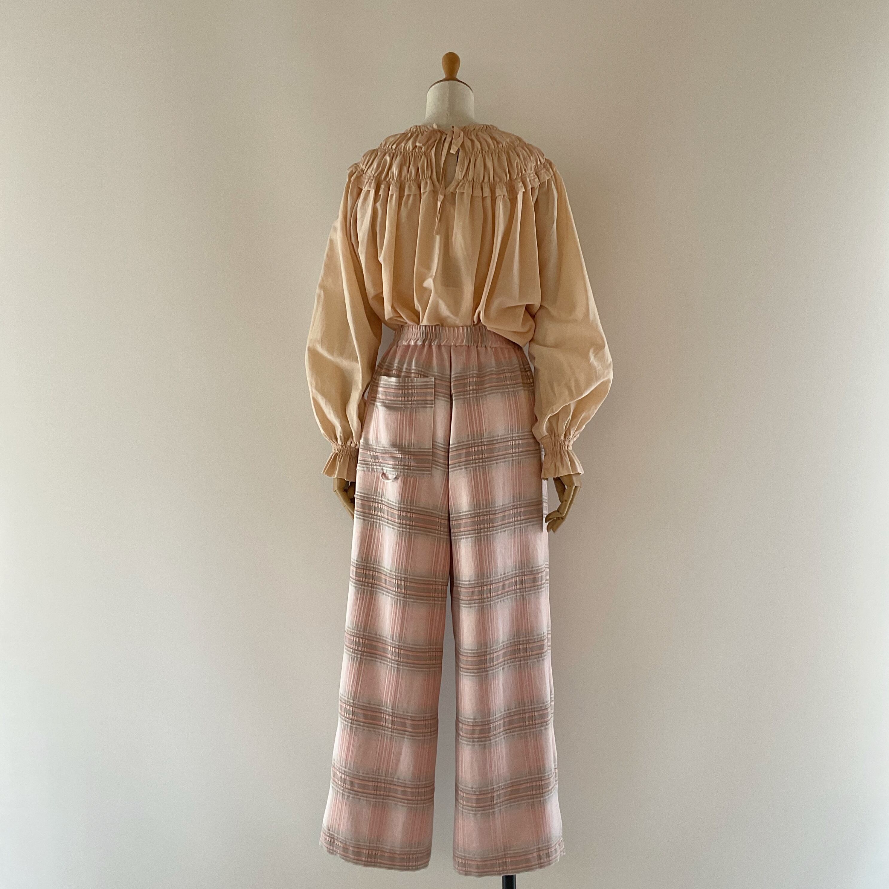 逆に写真のピンクチェックのパンツのようにかちっと厚みもあるワイドパンツならインした方が綺麗に決まる