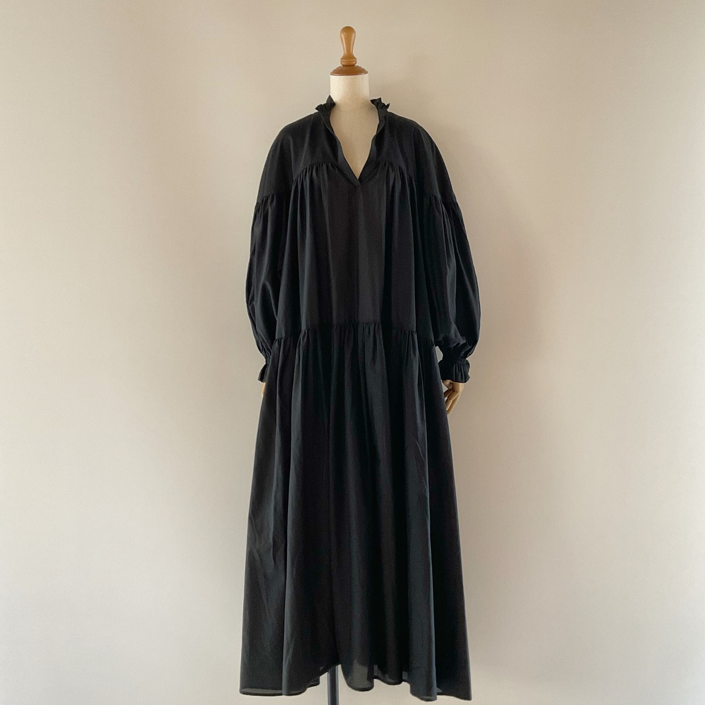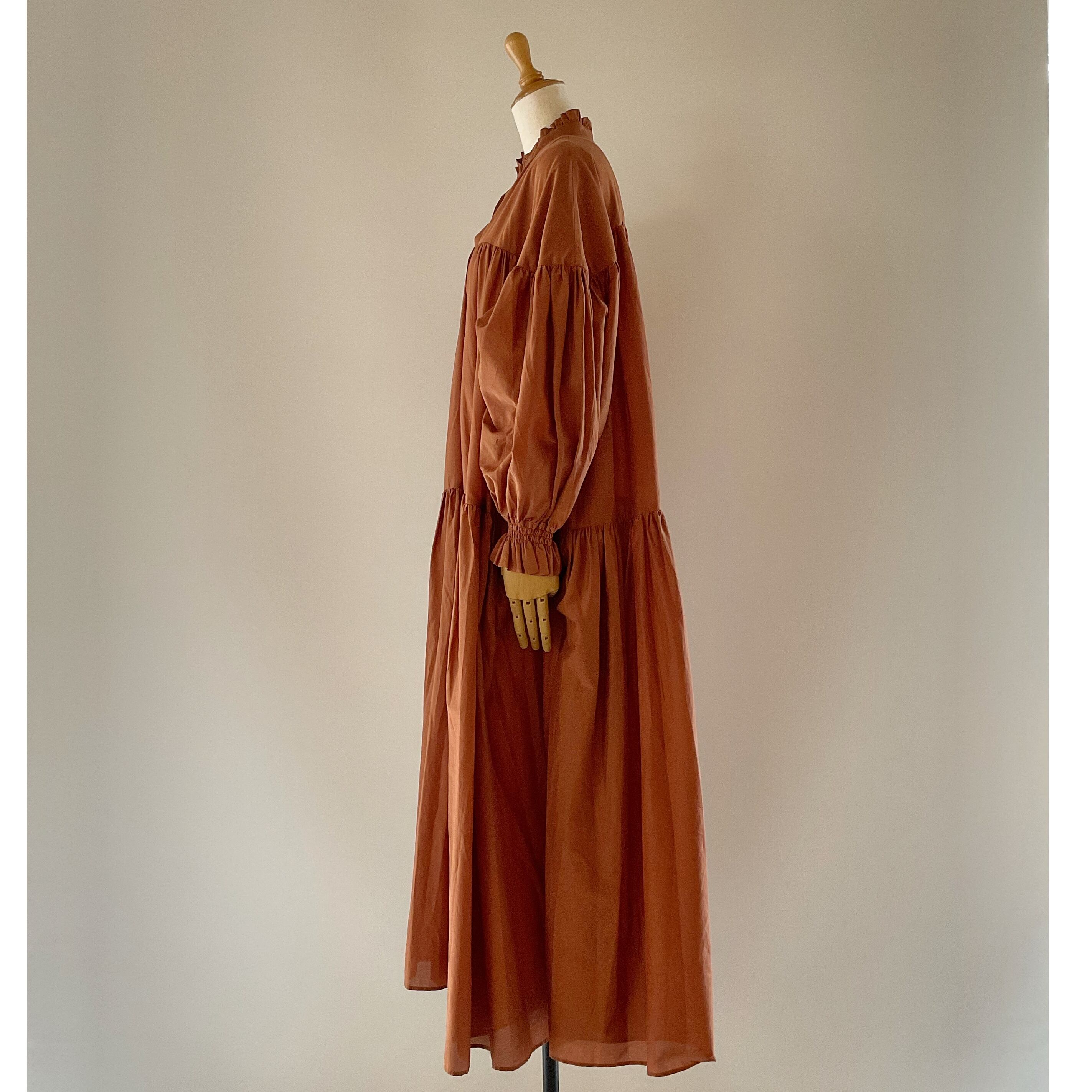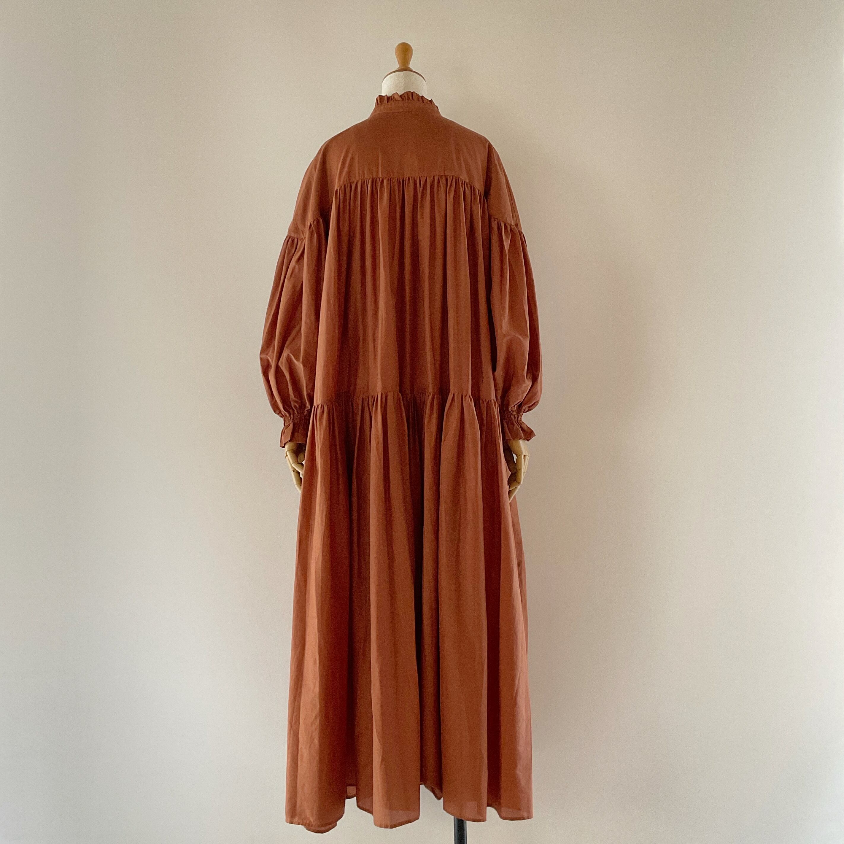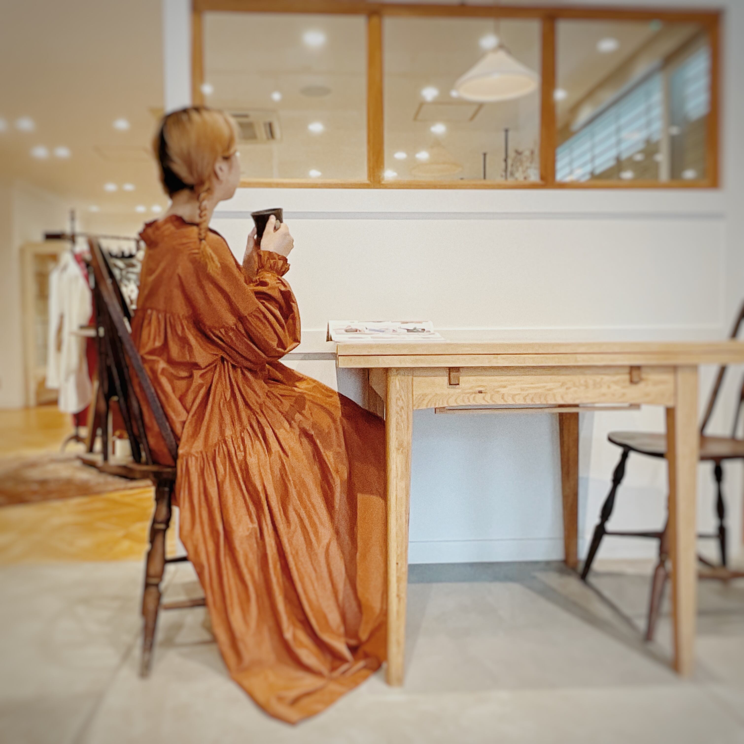 コットンシルクで優しい肌触りのドレスを作りました。今回はたっぷりとした用尺にして広がりが大変美しいシルエットを作っています。とても軽い素材のコットンシルクローンで歩く度に、広がり、その広がりが一度浮くと落ちるのに時間がかかります。その揺れ感と軽さゆえの落ちる緩やかさがとてもロマンティックで女性らしい瞬間ではないかと思います。長年女性として生きてきた中で、女性の美しさは若さ、メイクアップ、そして着る物からの演出の比重が多いと感じます。