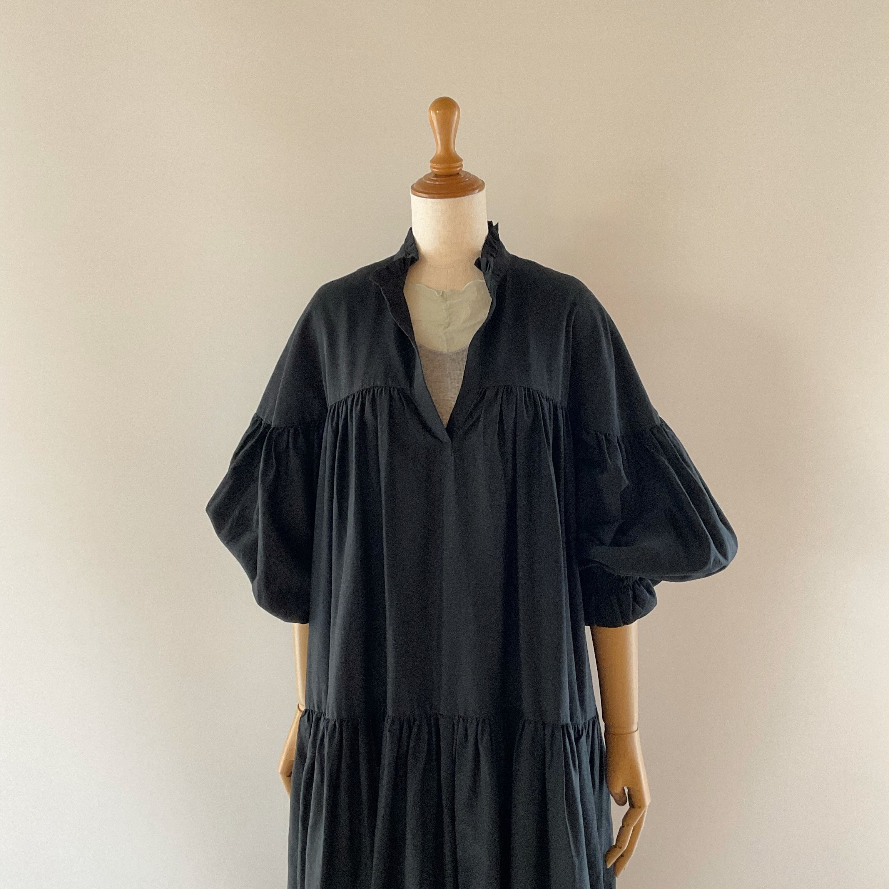 袖口は腕のどの部分でも留まるようにシャーリングのゴムにしてみました。ですので半袖にしたい場合はたくし上げて半袖使用にしてパフ部分を膨らませて着用してみてください。たくしあげて短めの袖のように見えるシルエットも、下ろして長袖のパフスリーブ仕様もどちらもロマンティックなシルエットです。
