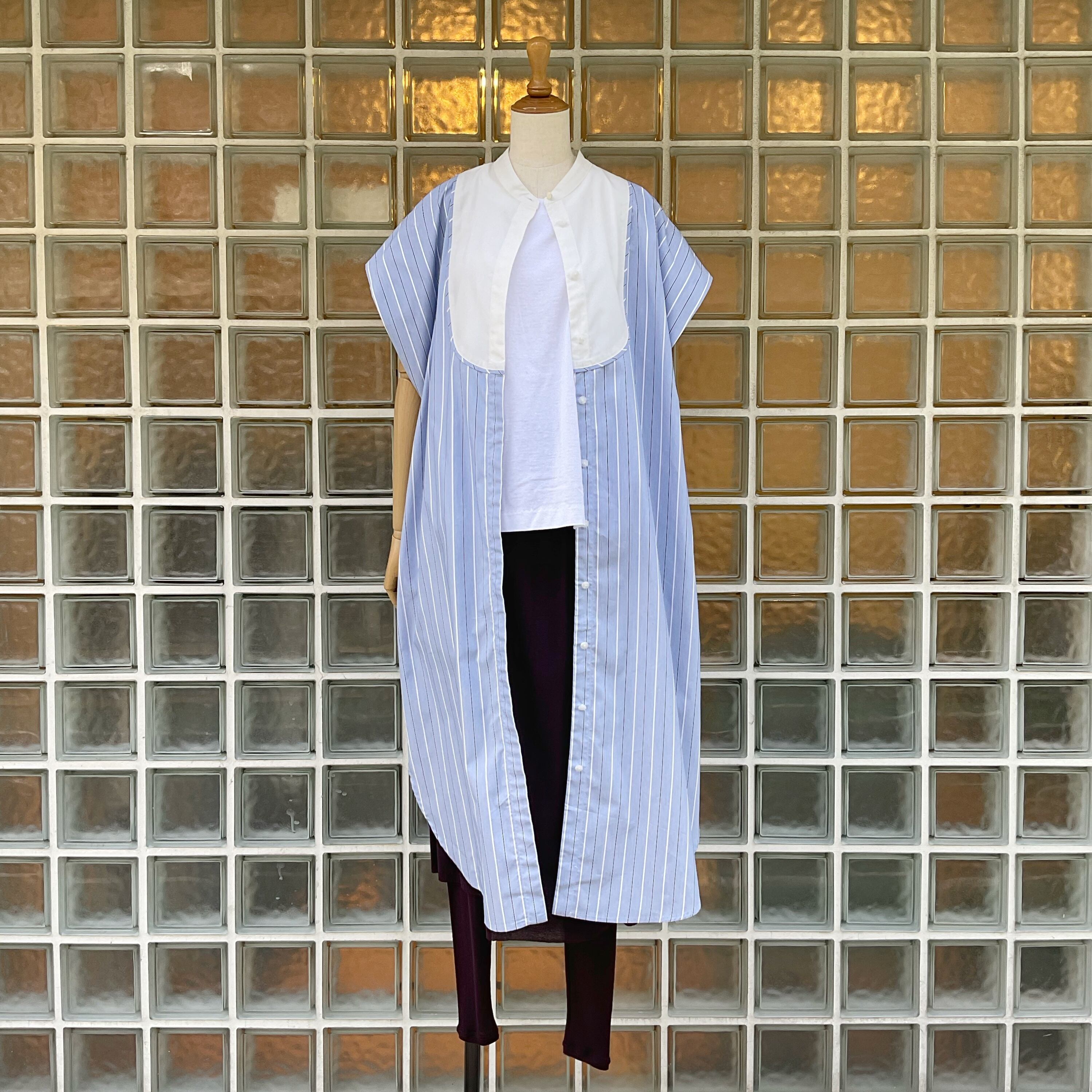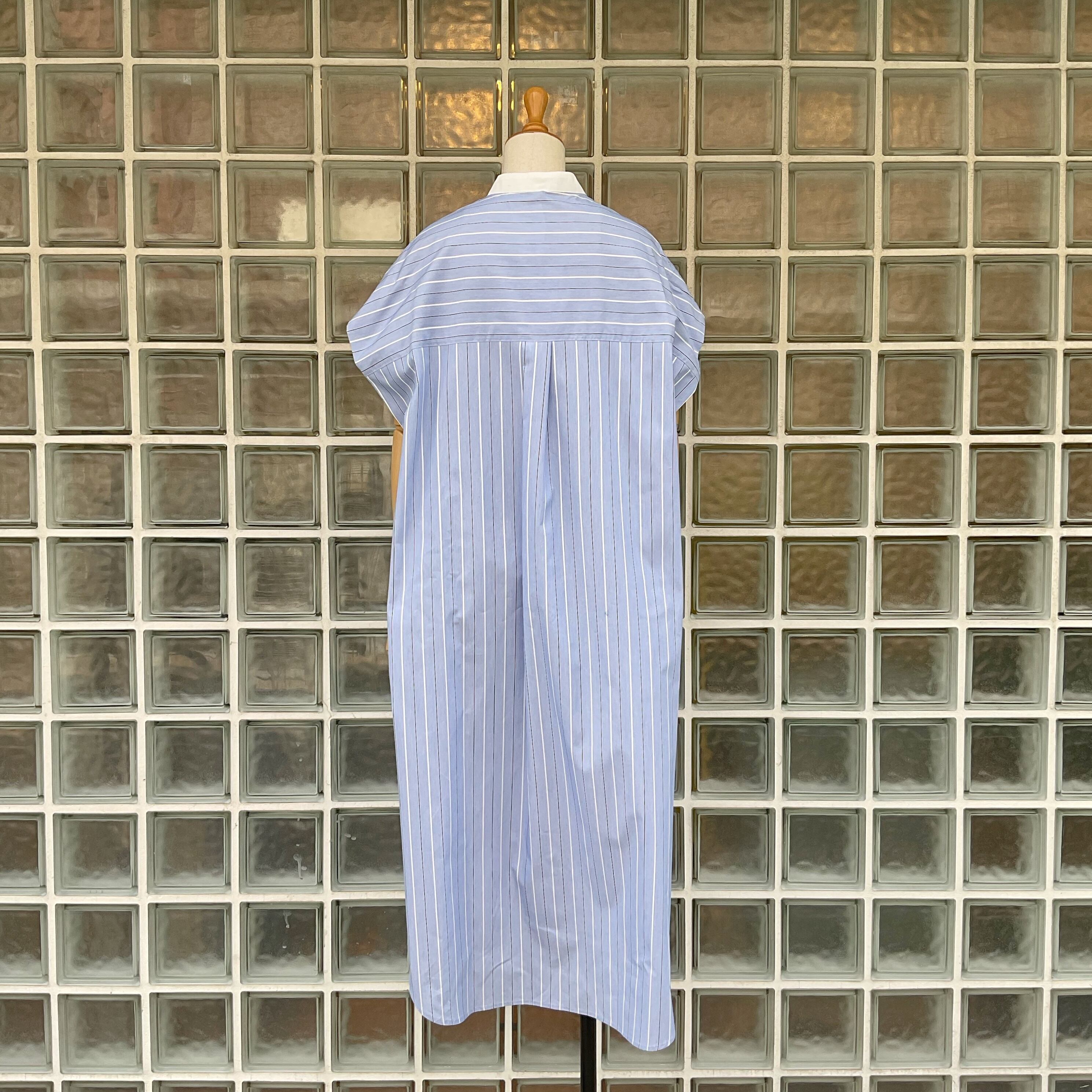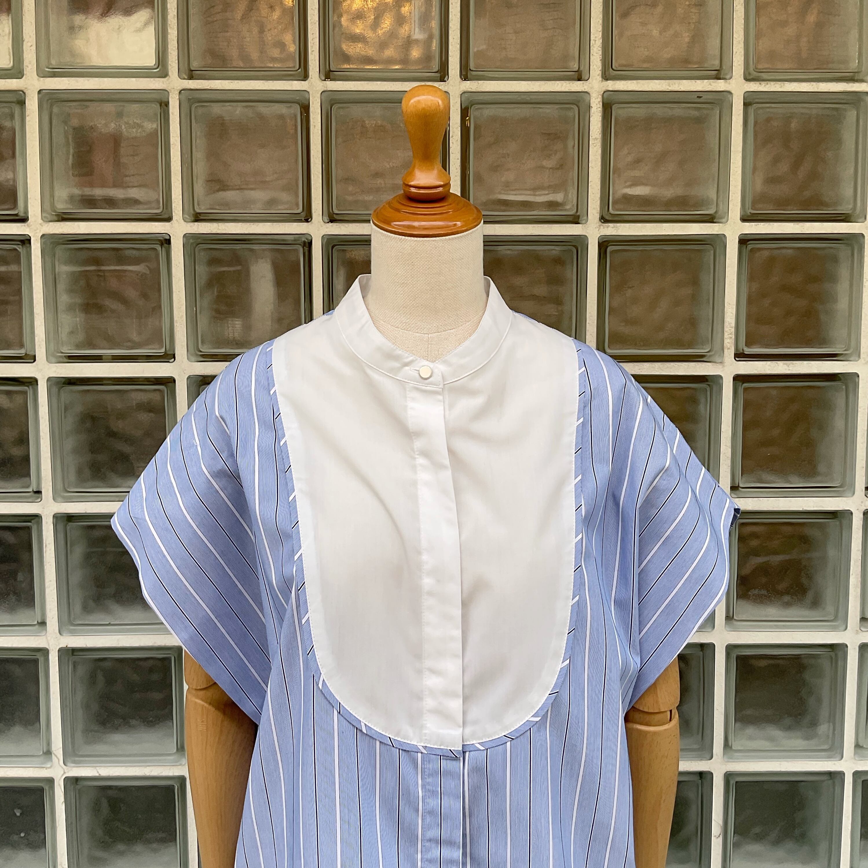 胸元のビブヨークと袖口の折り込みタックがポイントのシャツワンピース