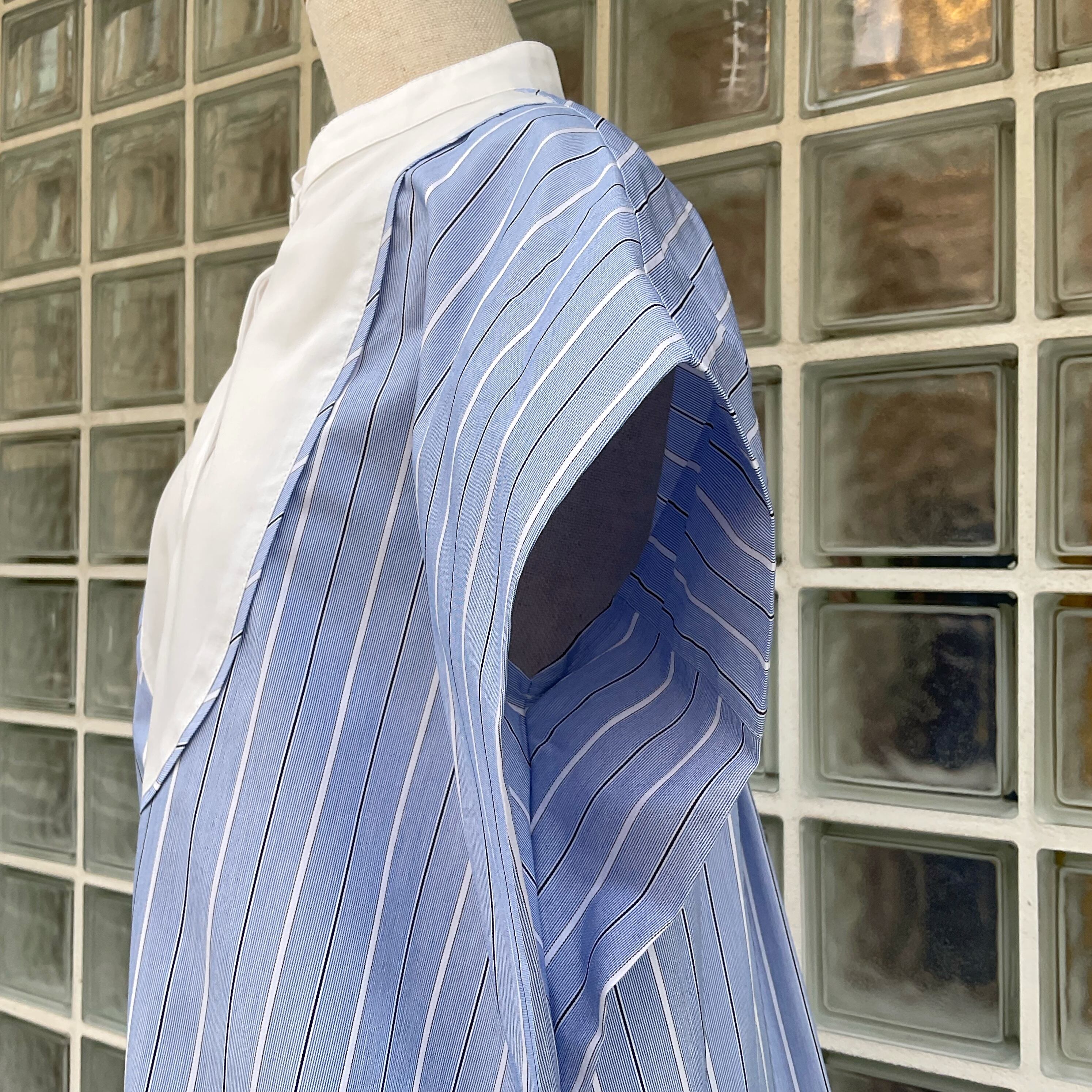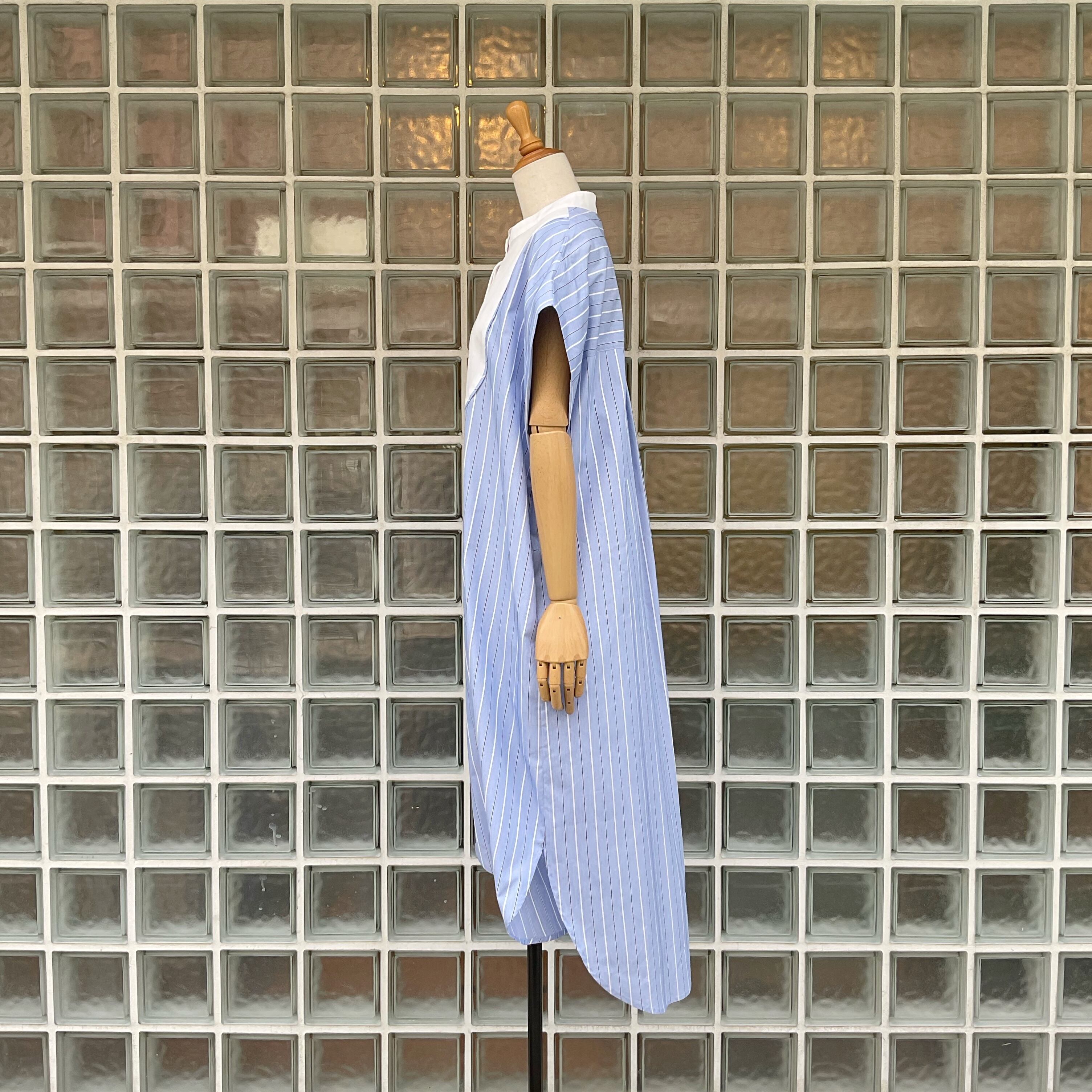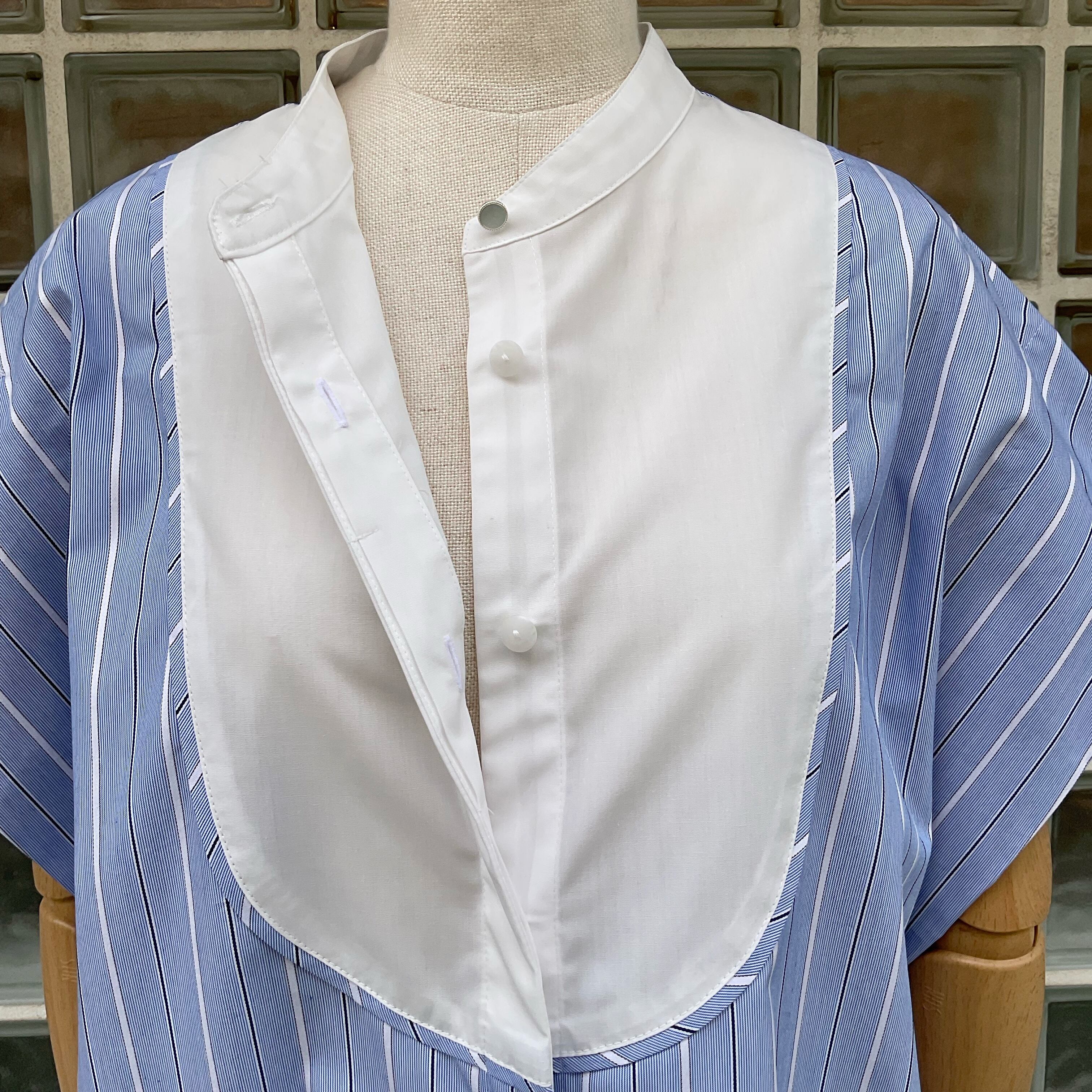 胸元のビブヨークと袖口の折り込みタックがポイントのシャツワンピース