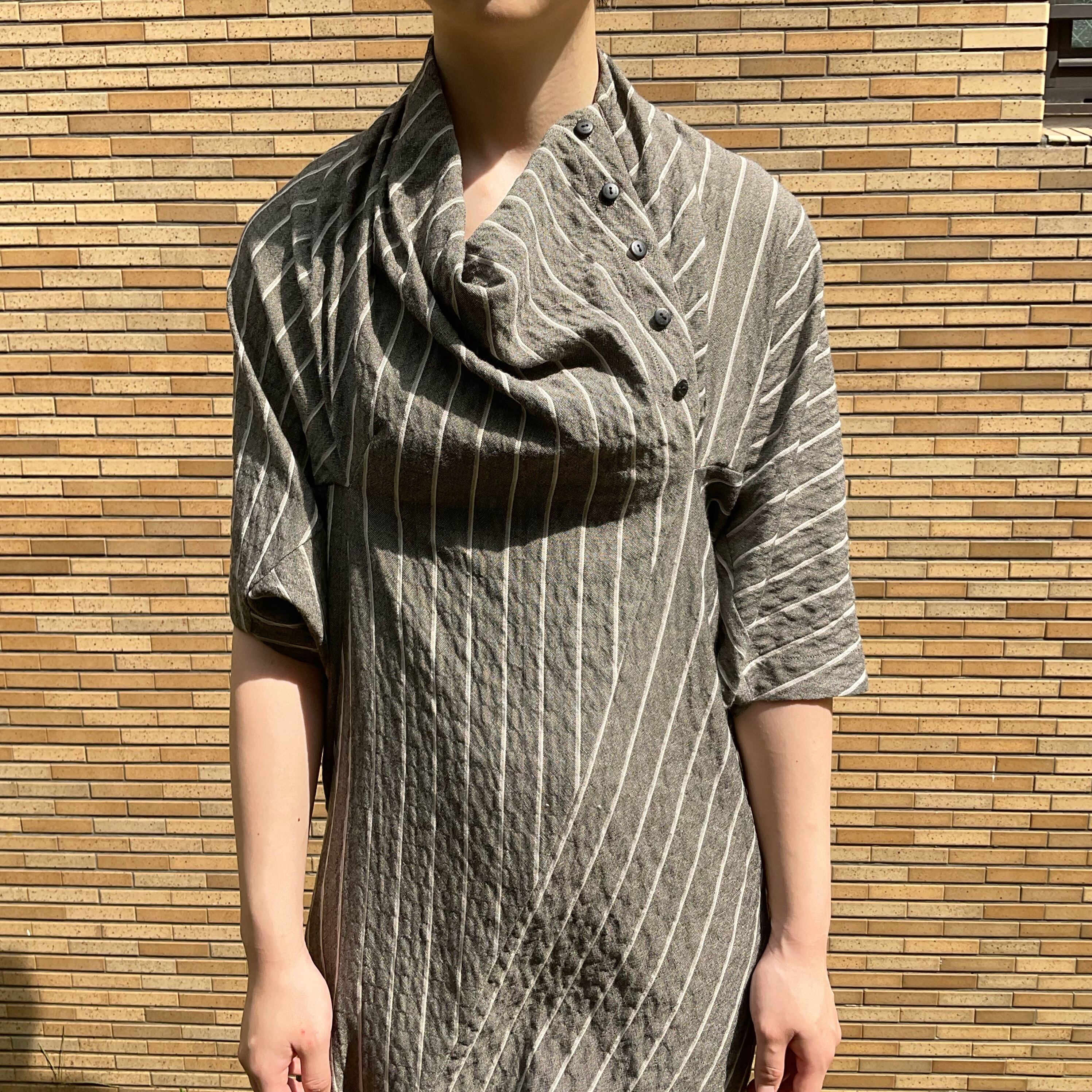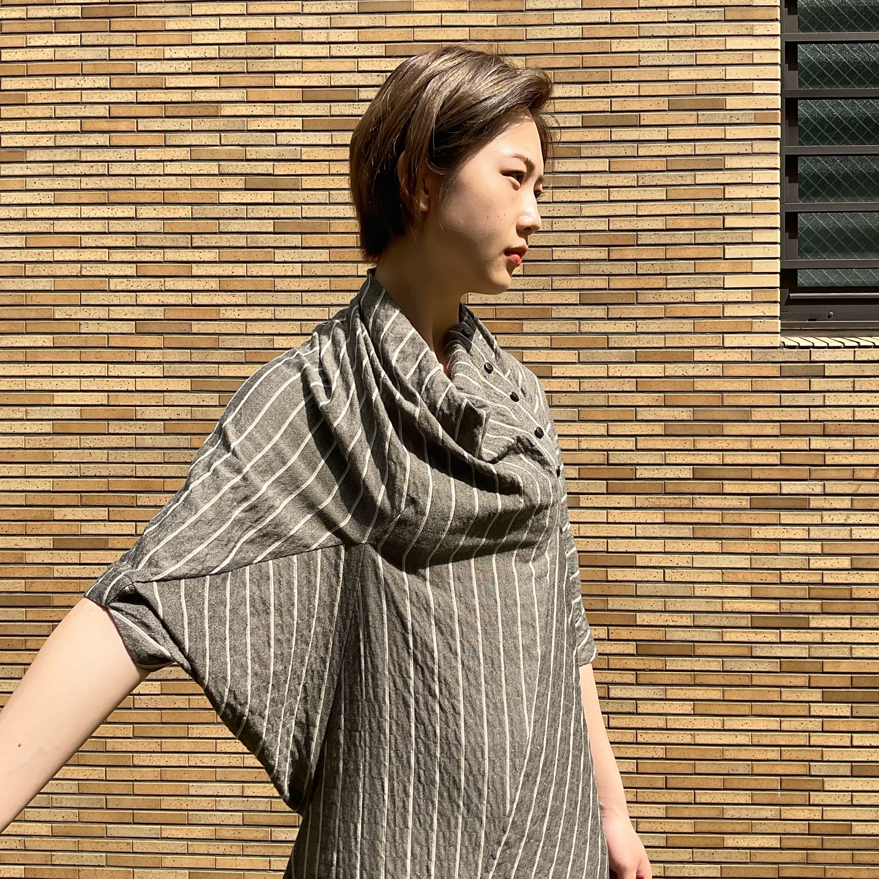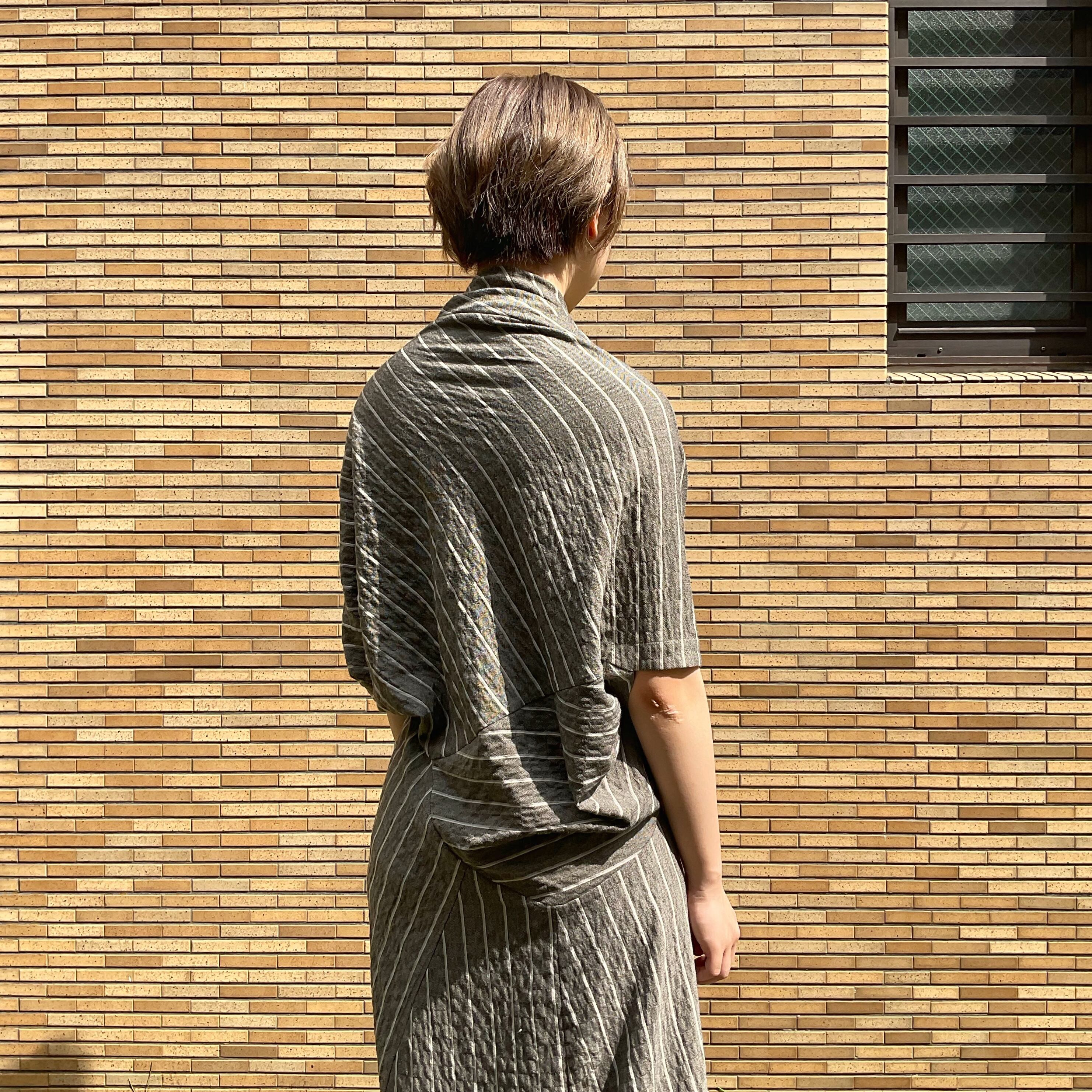 上半身は首元やバックにたっぷりとしたドレープを取り、フワッとポンチョのようなシルエットに