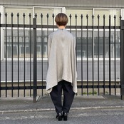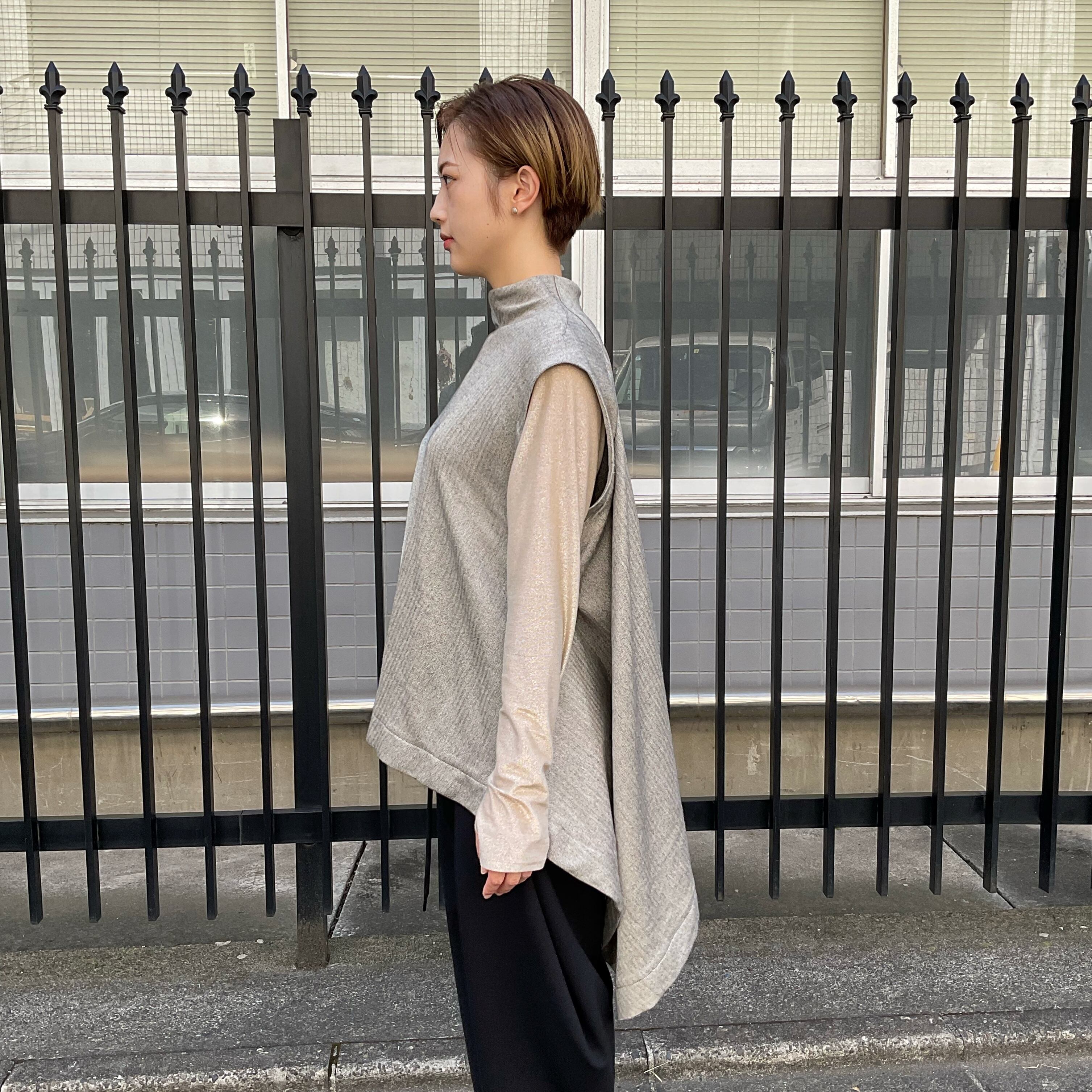 背中にたっぷり寄せたドレープと、首に沿うシュッとしたハイネックが特徴のノースリーブトップ