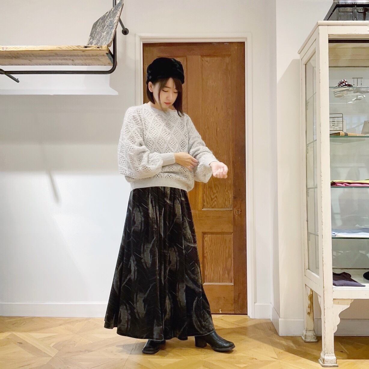 ニットにボリュームがあるので、スカートなら横に広がるフレアスカートより、