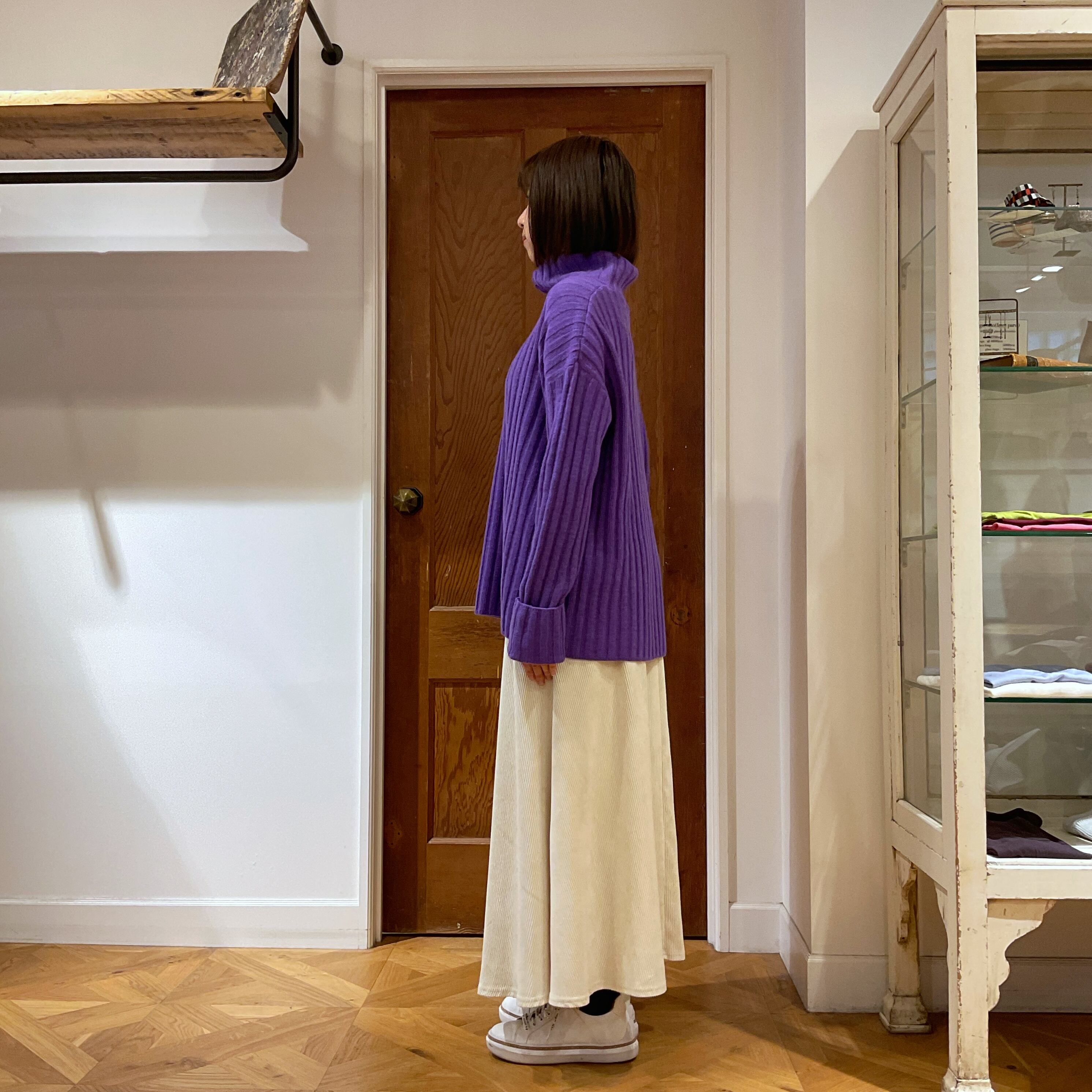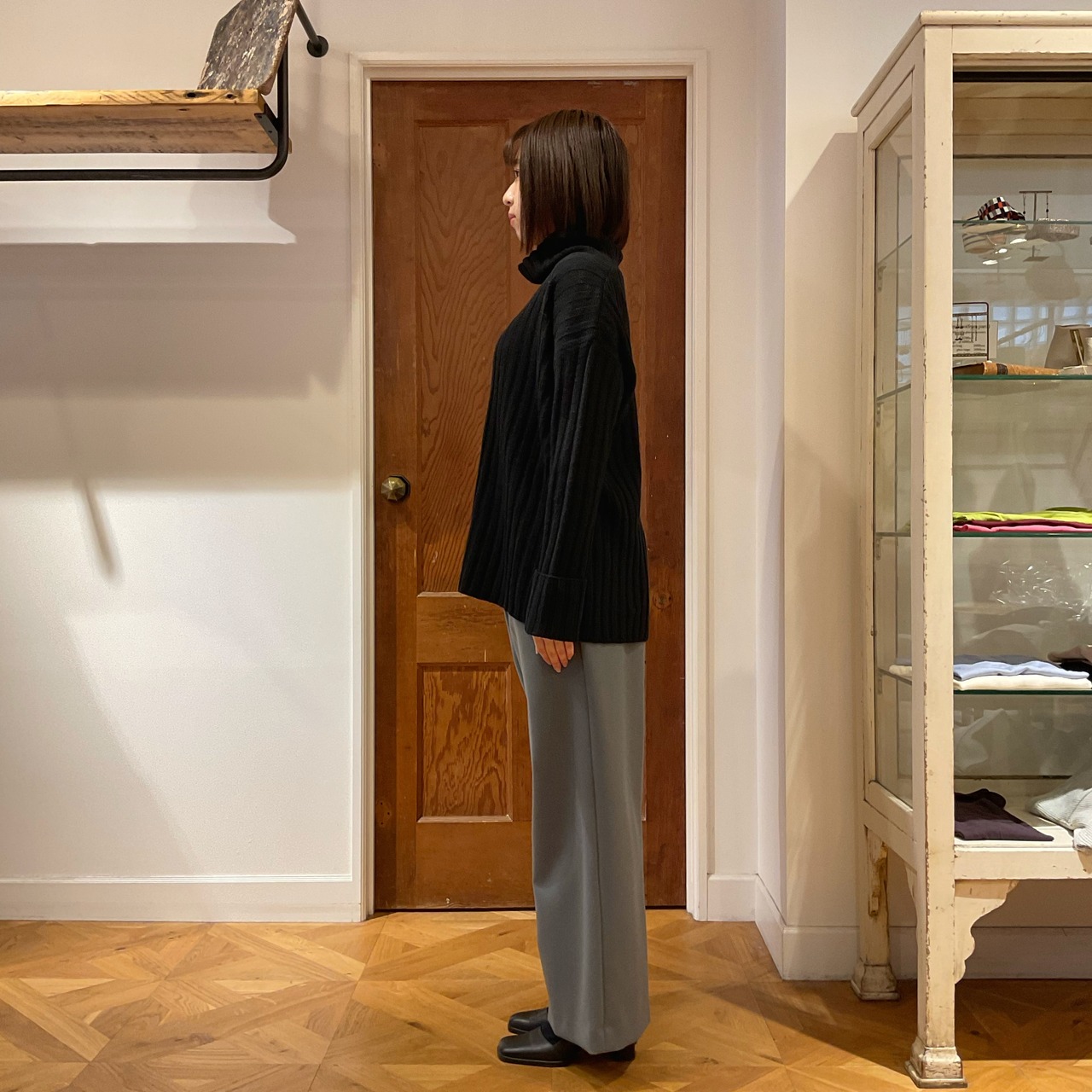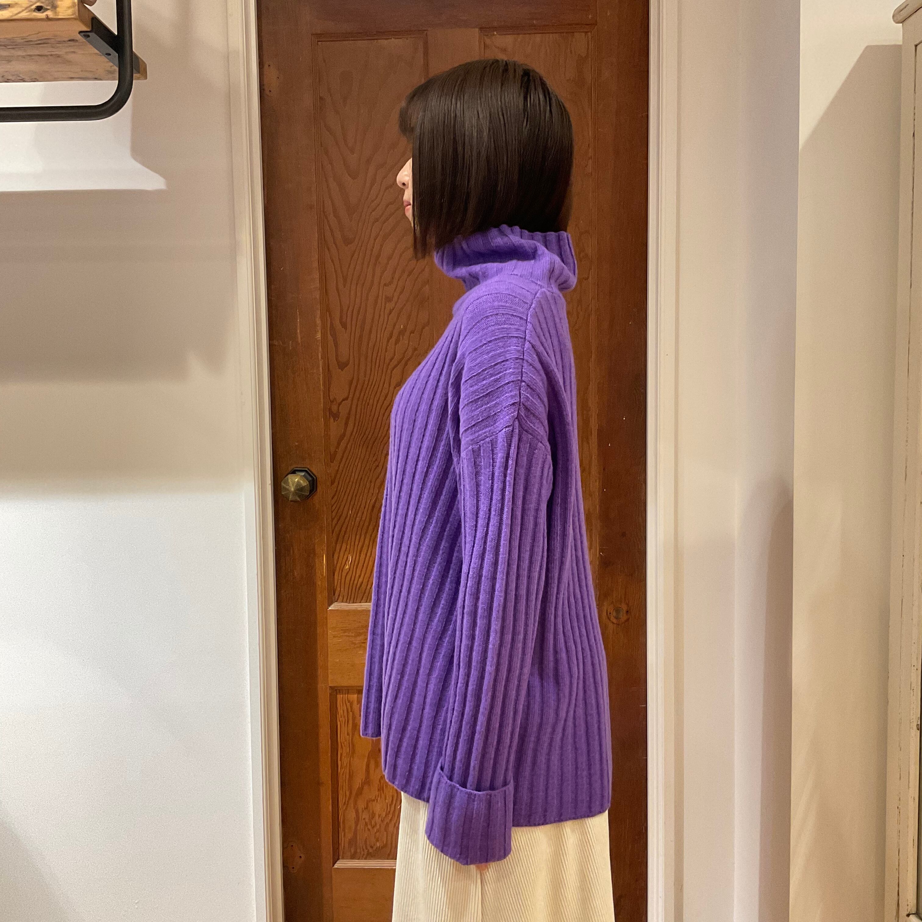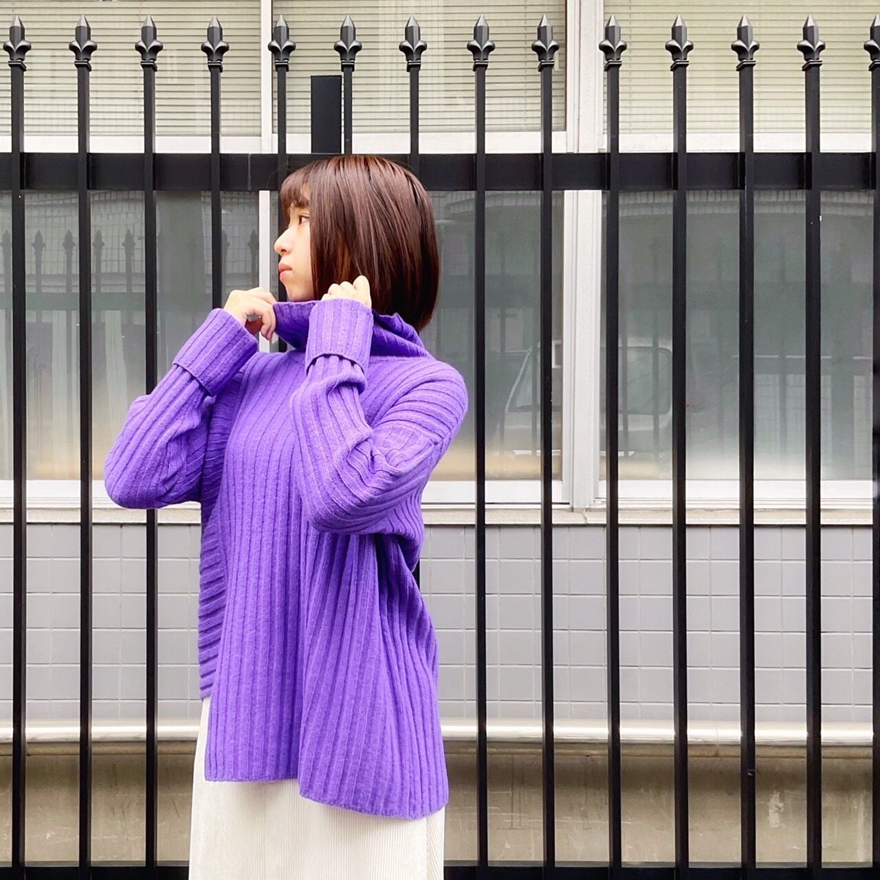 ワイドリブの編地をタテヨコ組み合わせた、オーバーサイズのタートルネックニット