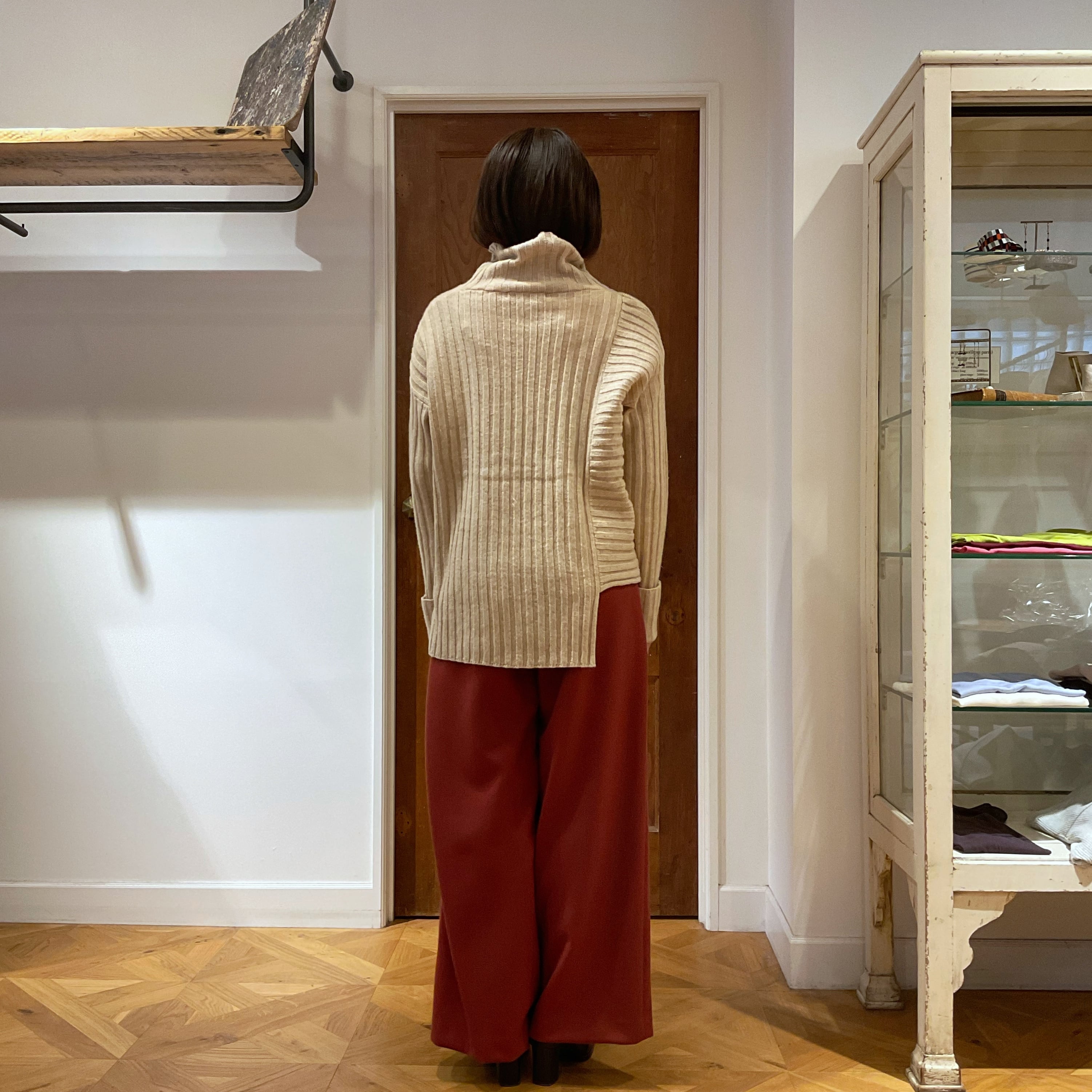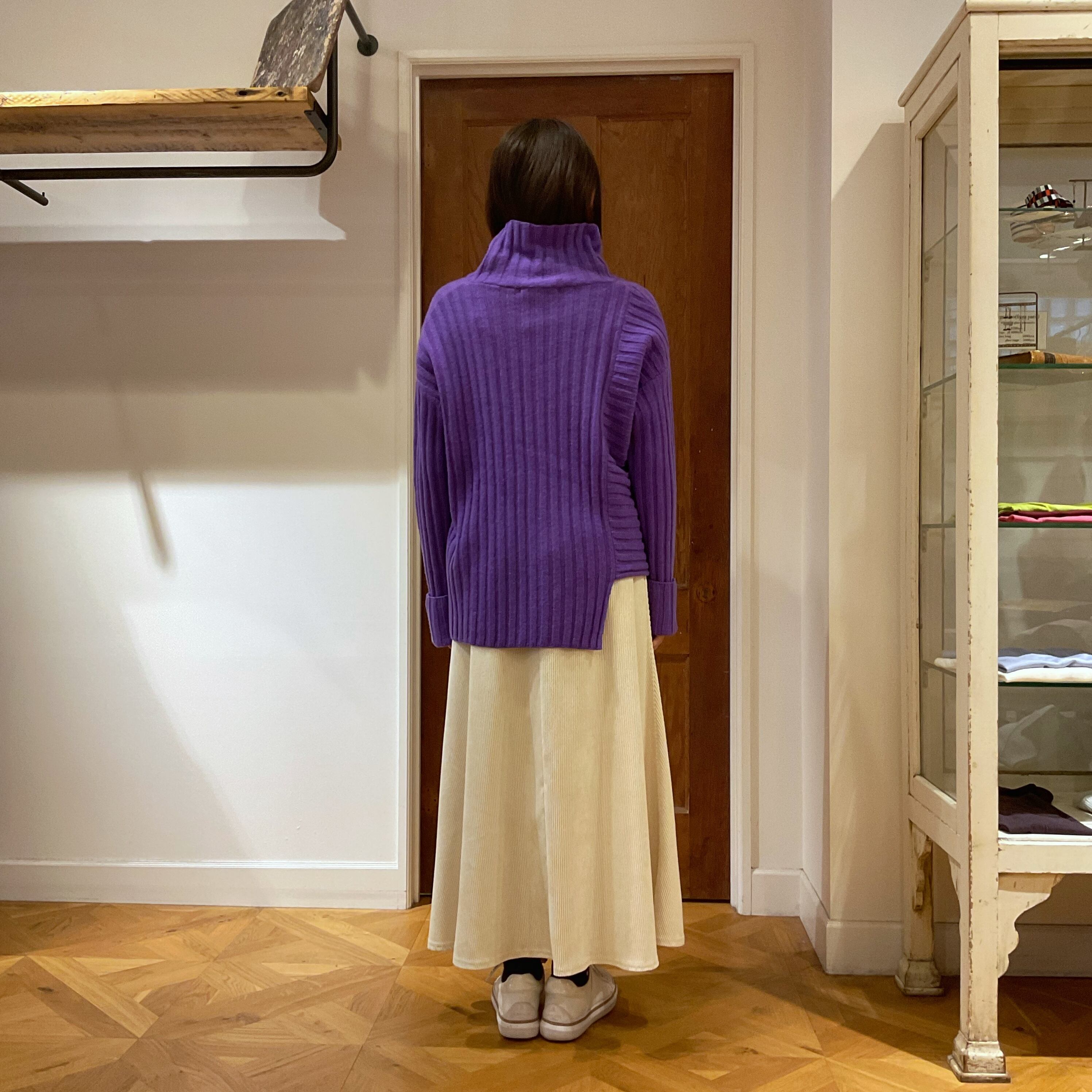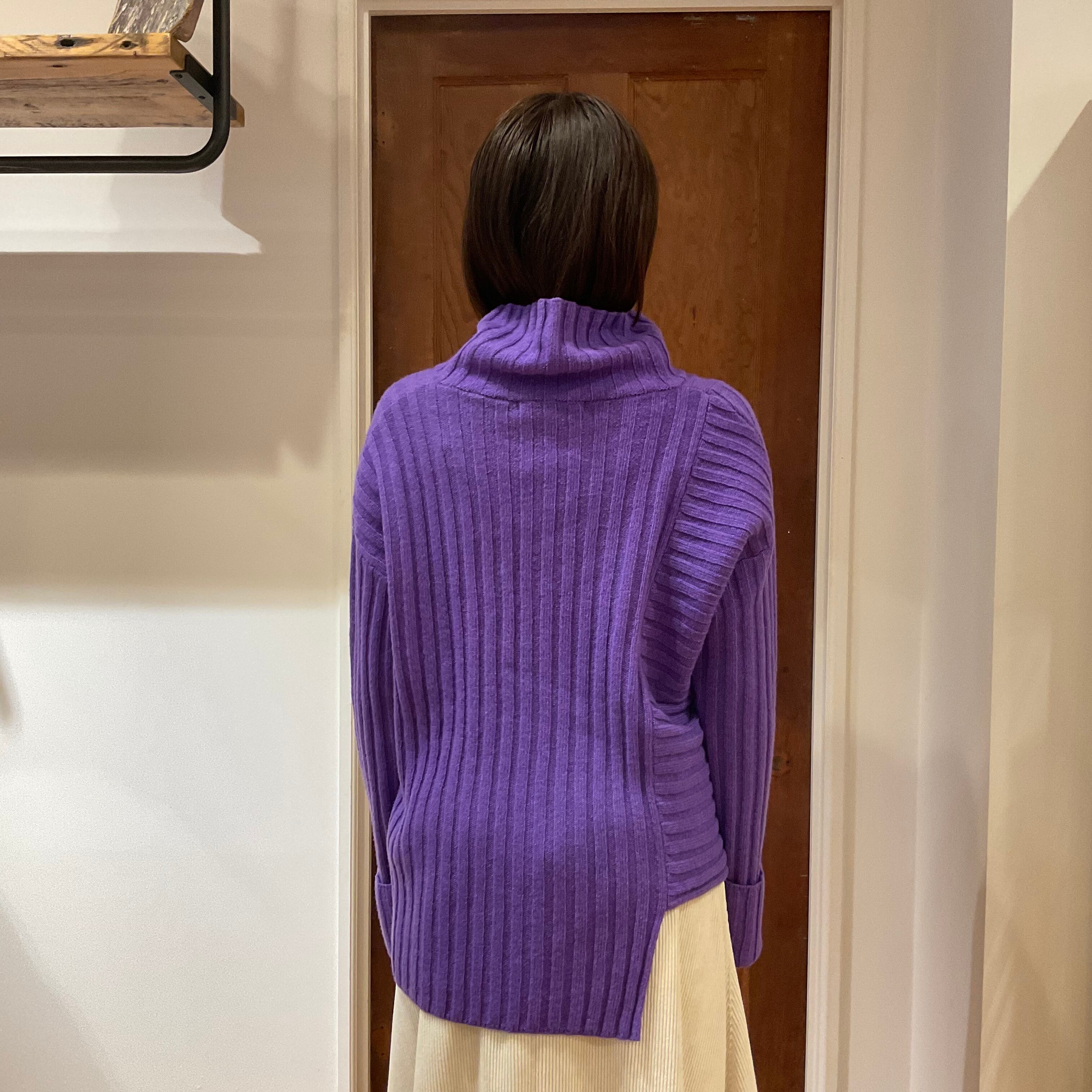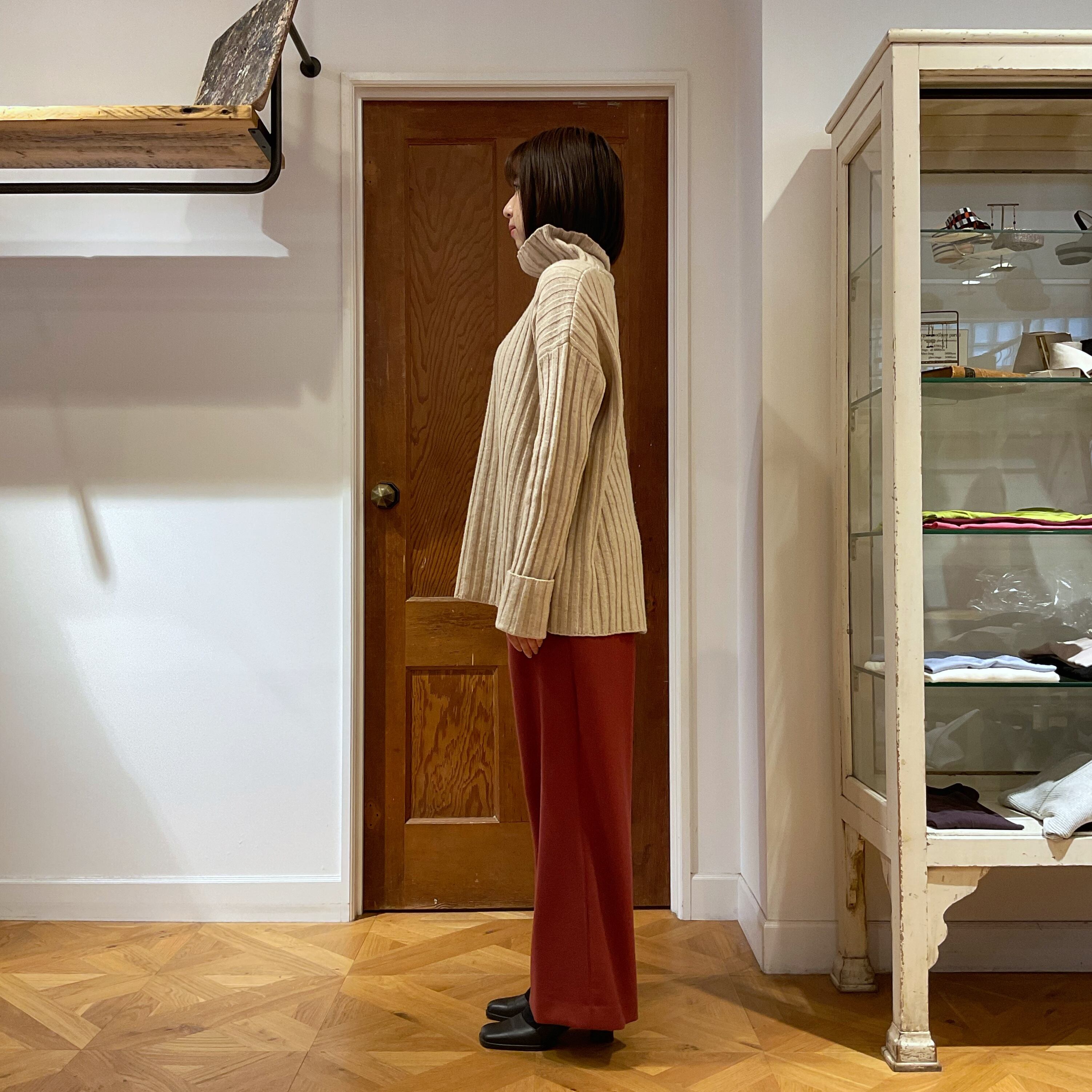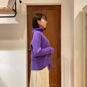 ワイドリブの編地をタテヨコ組み合わせた、オーバーサイズのタートルネックニット
