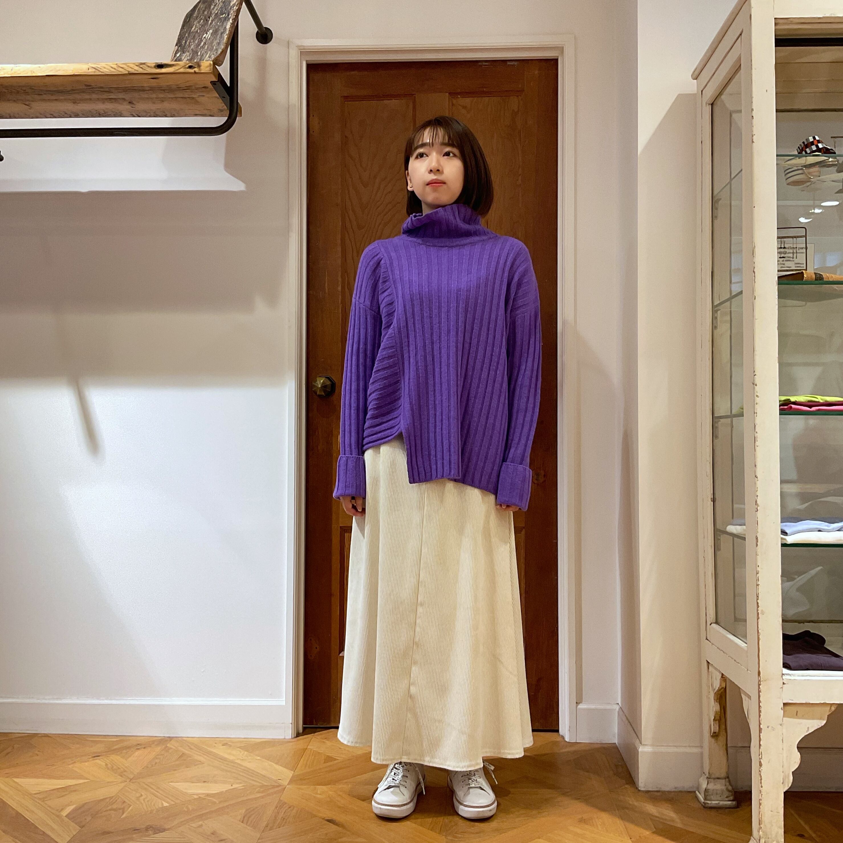 体の線を拾いがちなリブニットも、オーバーサイズだから安心、縦のラインの編地でボディーラインをスッキリ見せます