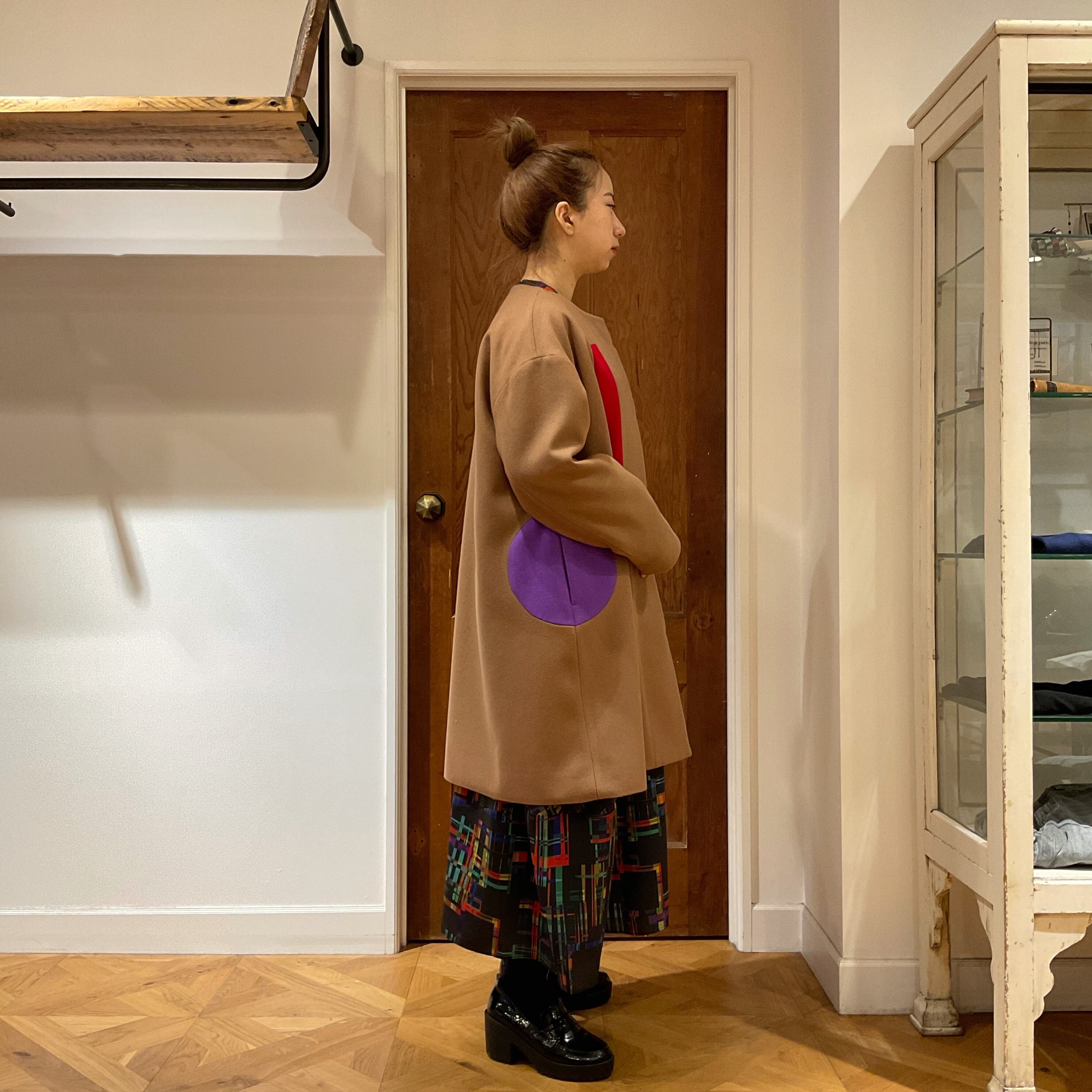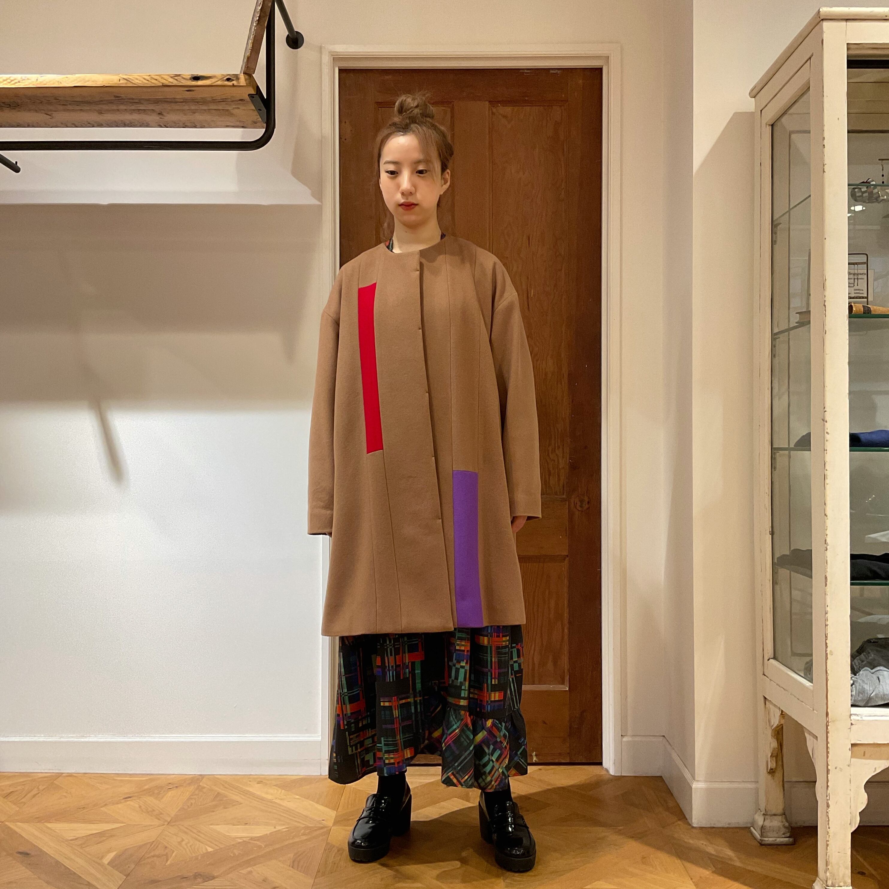 シンプルなノーカラーコートに〇や直線のモチーフが配されたハーフコート