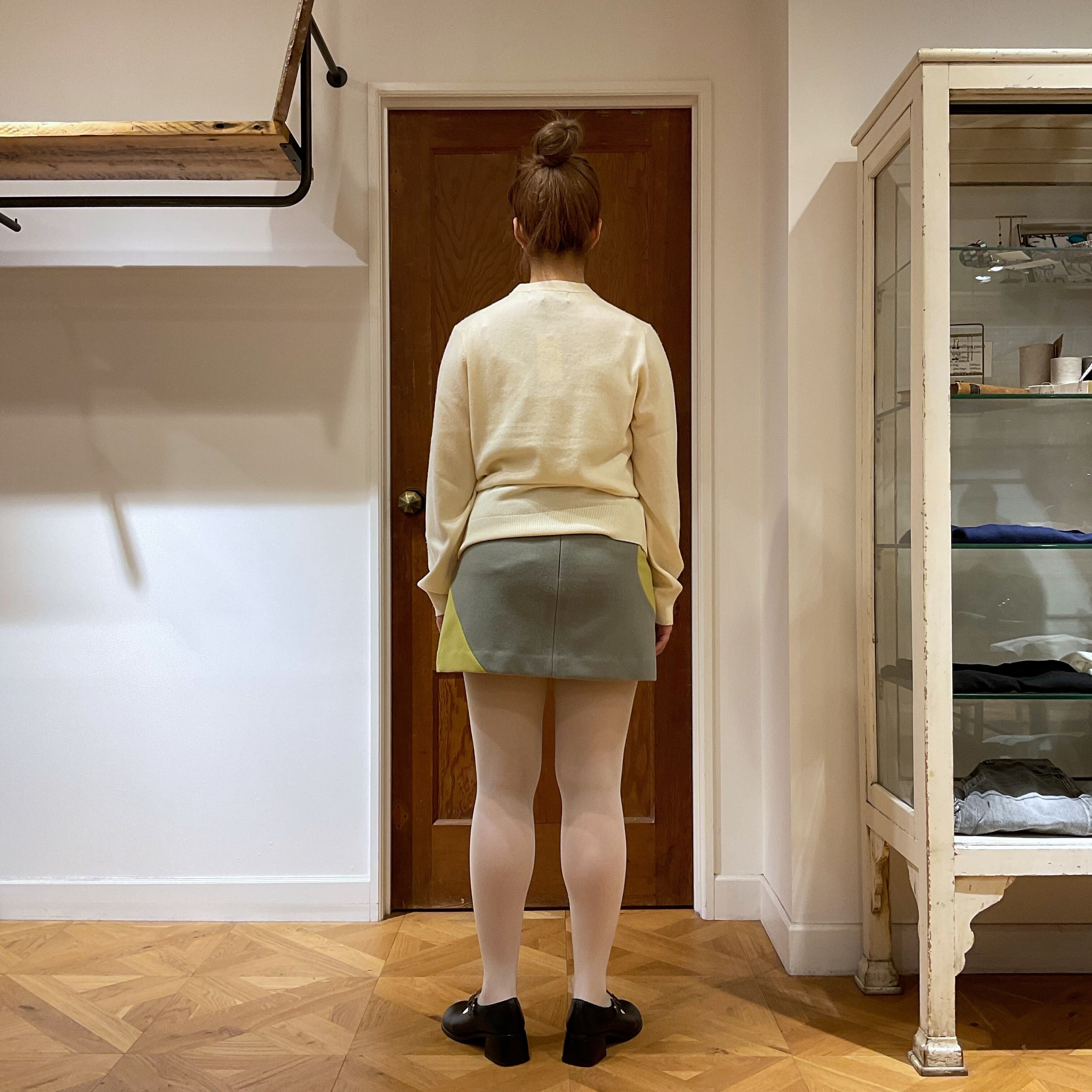 シンプルな台形ミニスカートに同素材コートと同じく〇とラインのモチーフ