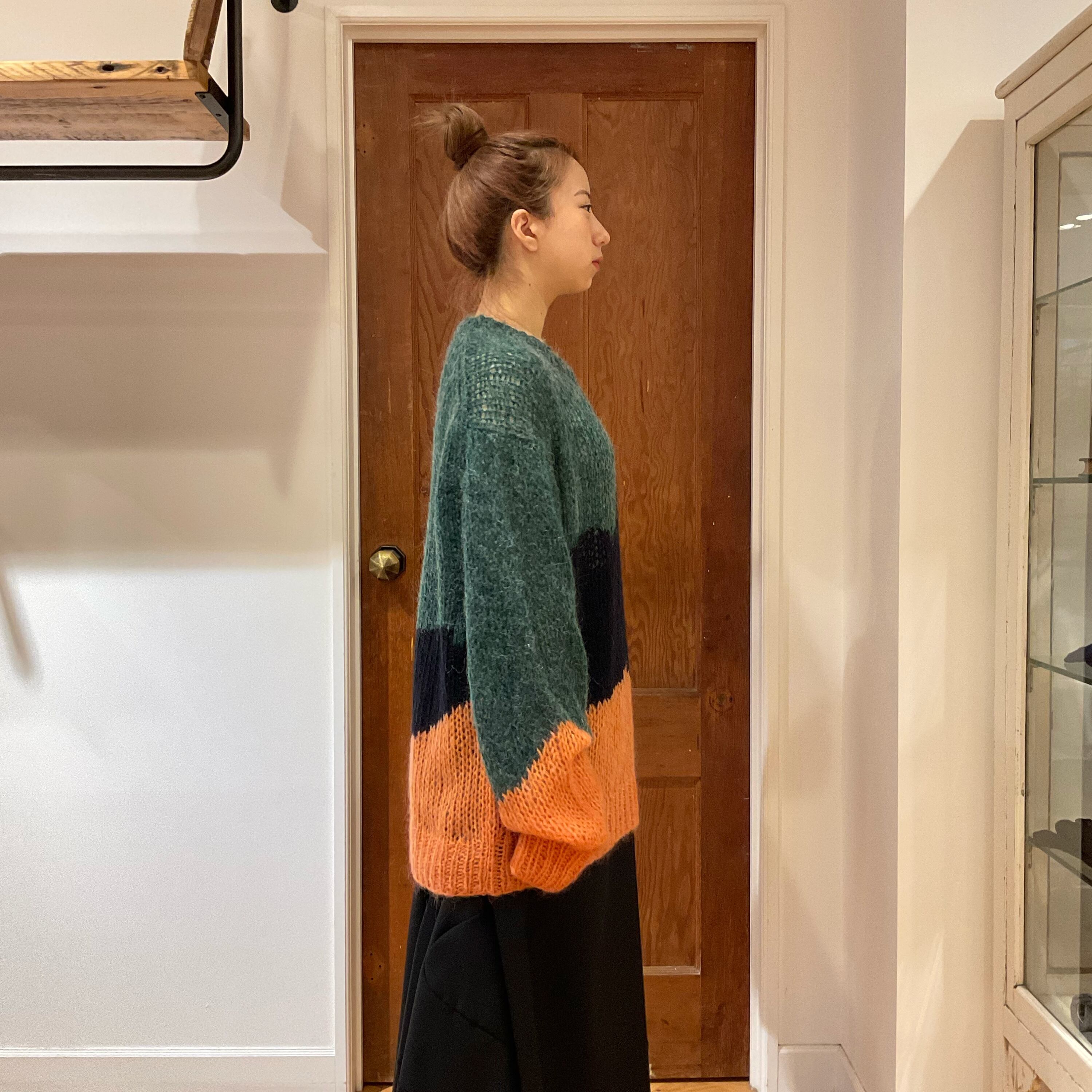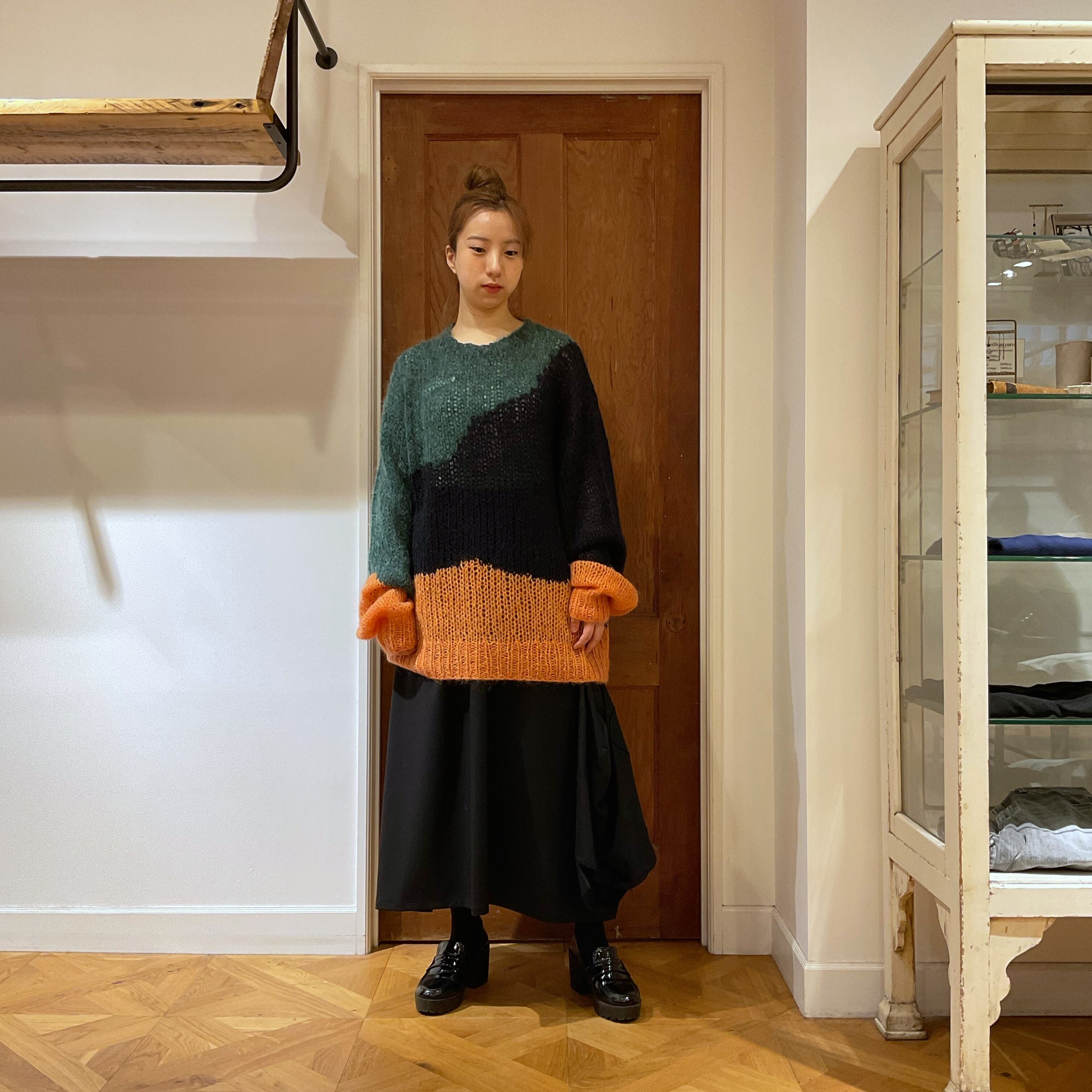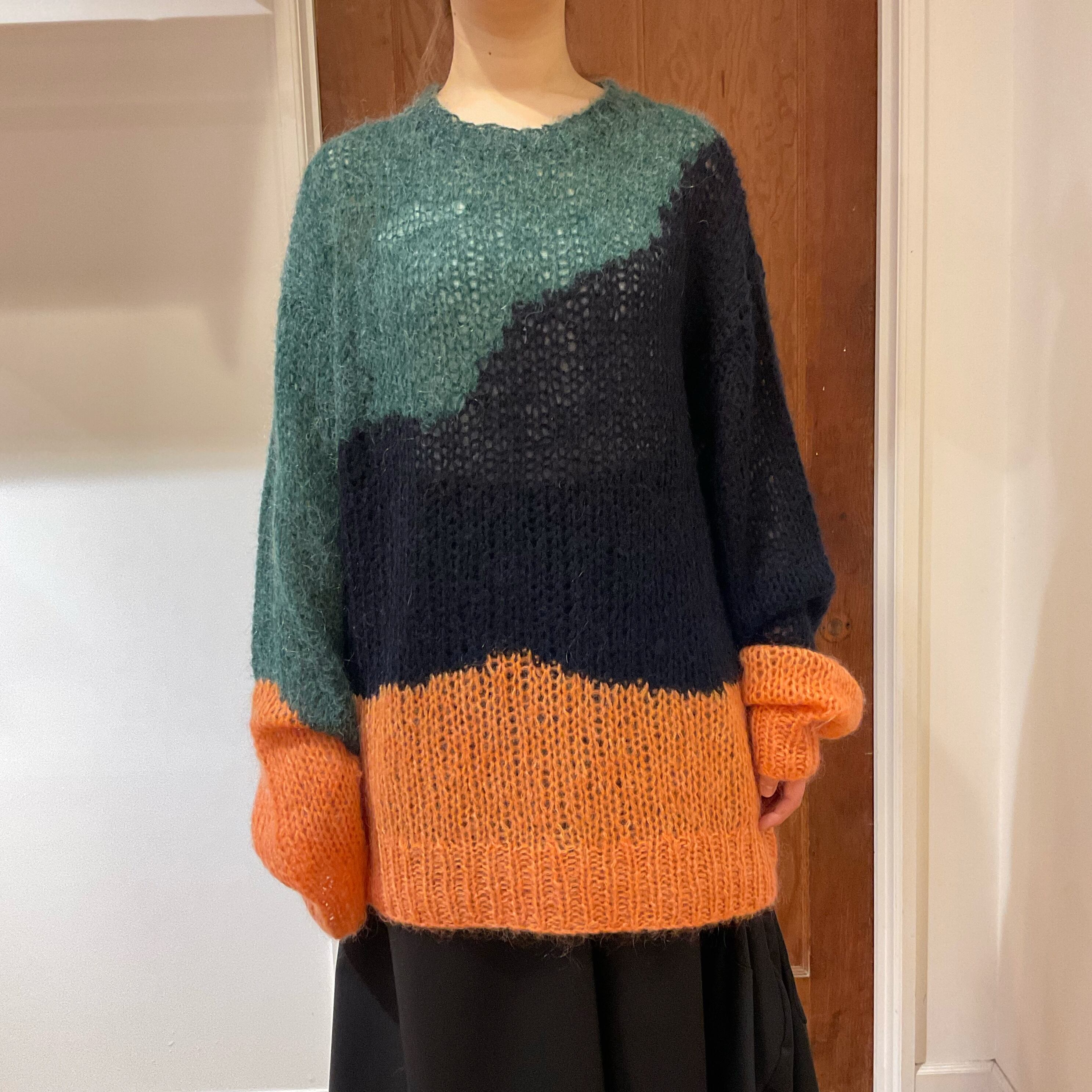 ローゲージのゆるい編地と、大胆なカラーパレットが特徴のあま編みニット