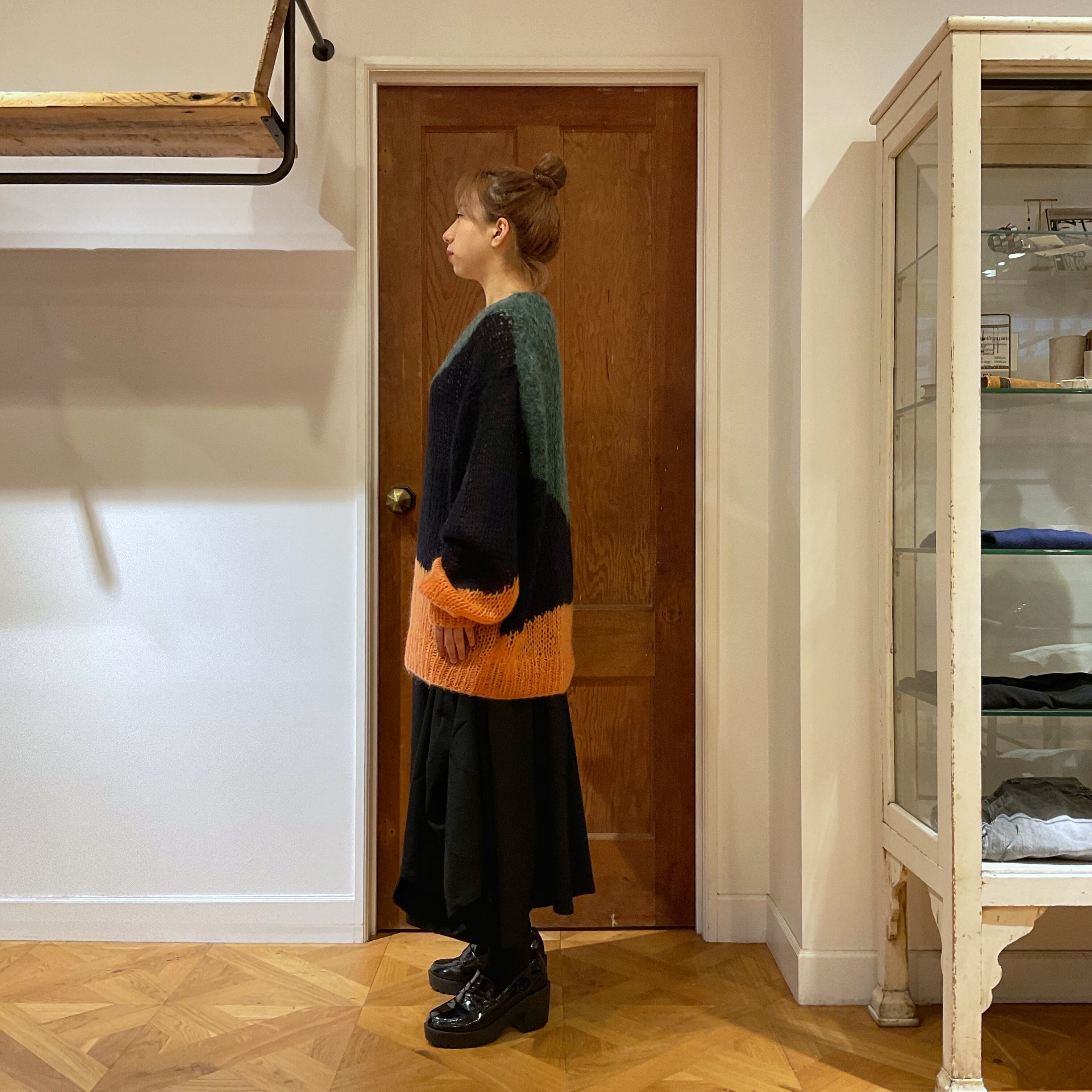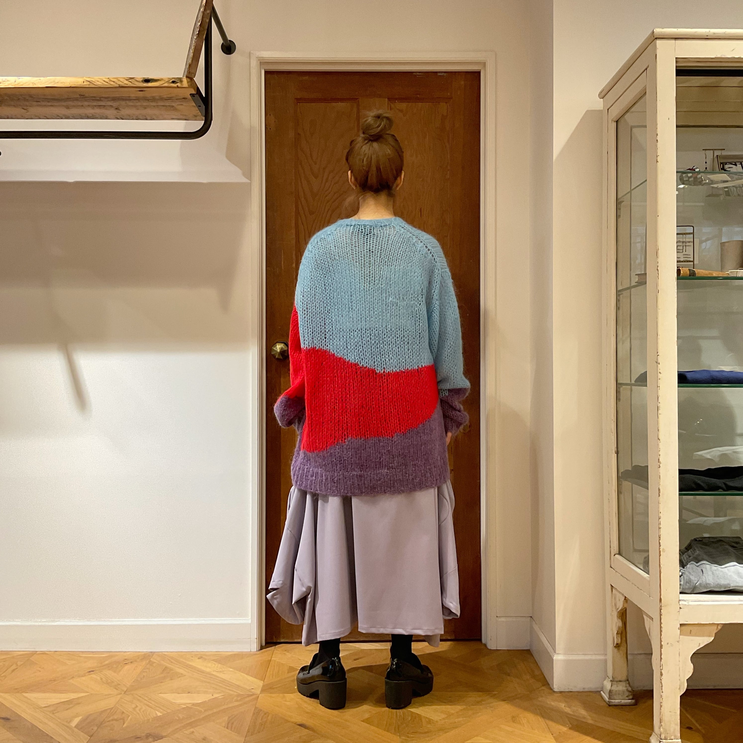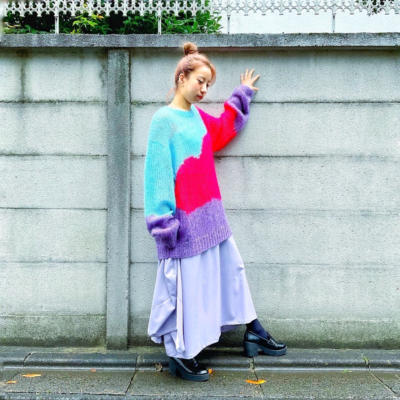 ローゲージのゆるい編地と、大胆なカラーパレットが特徴のあま編みニット