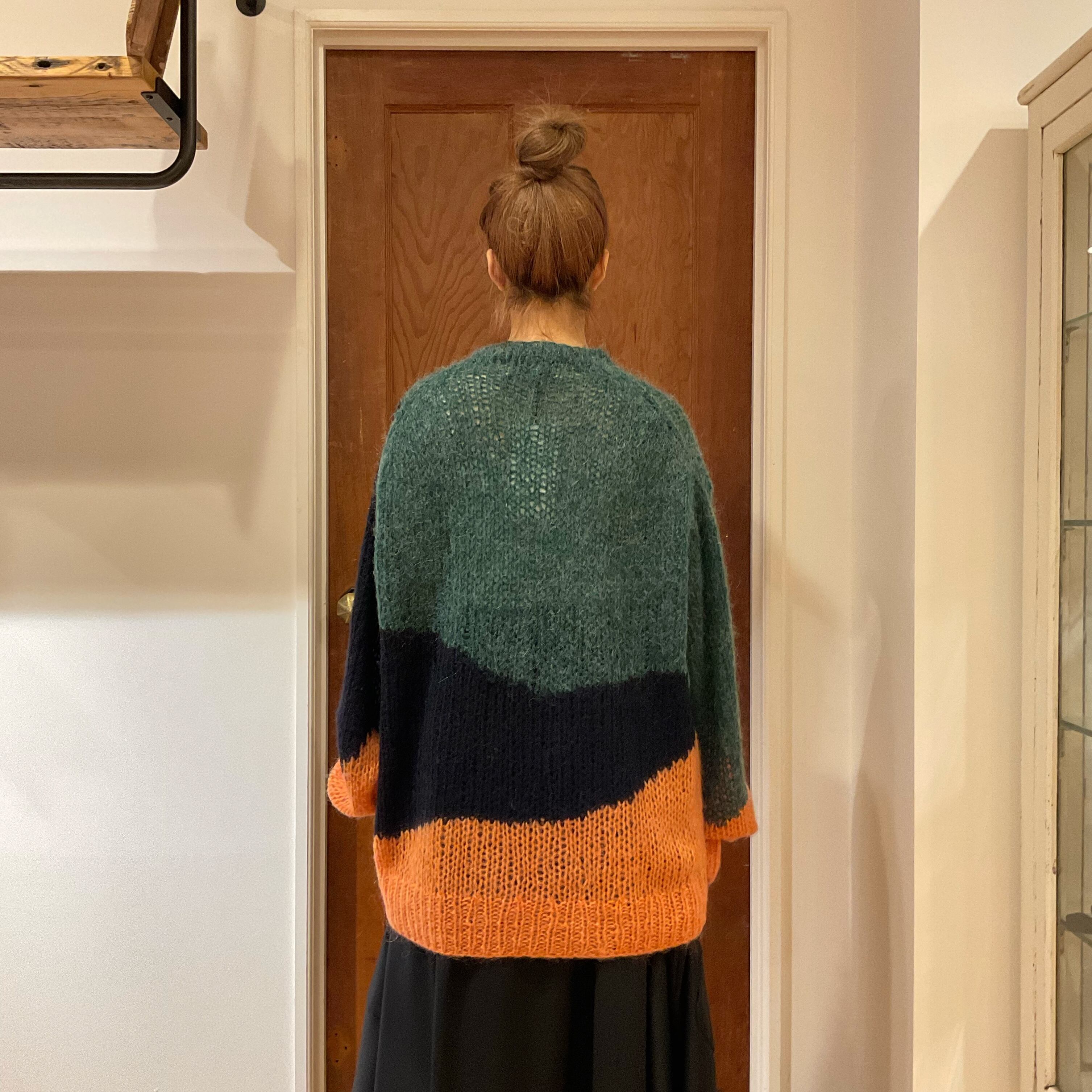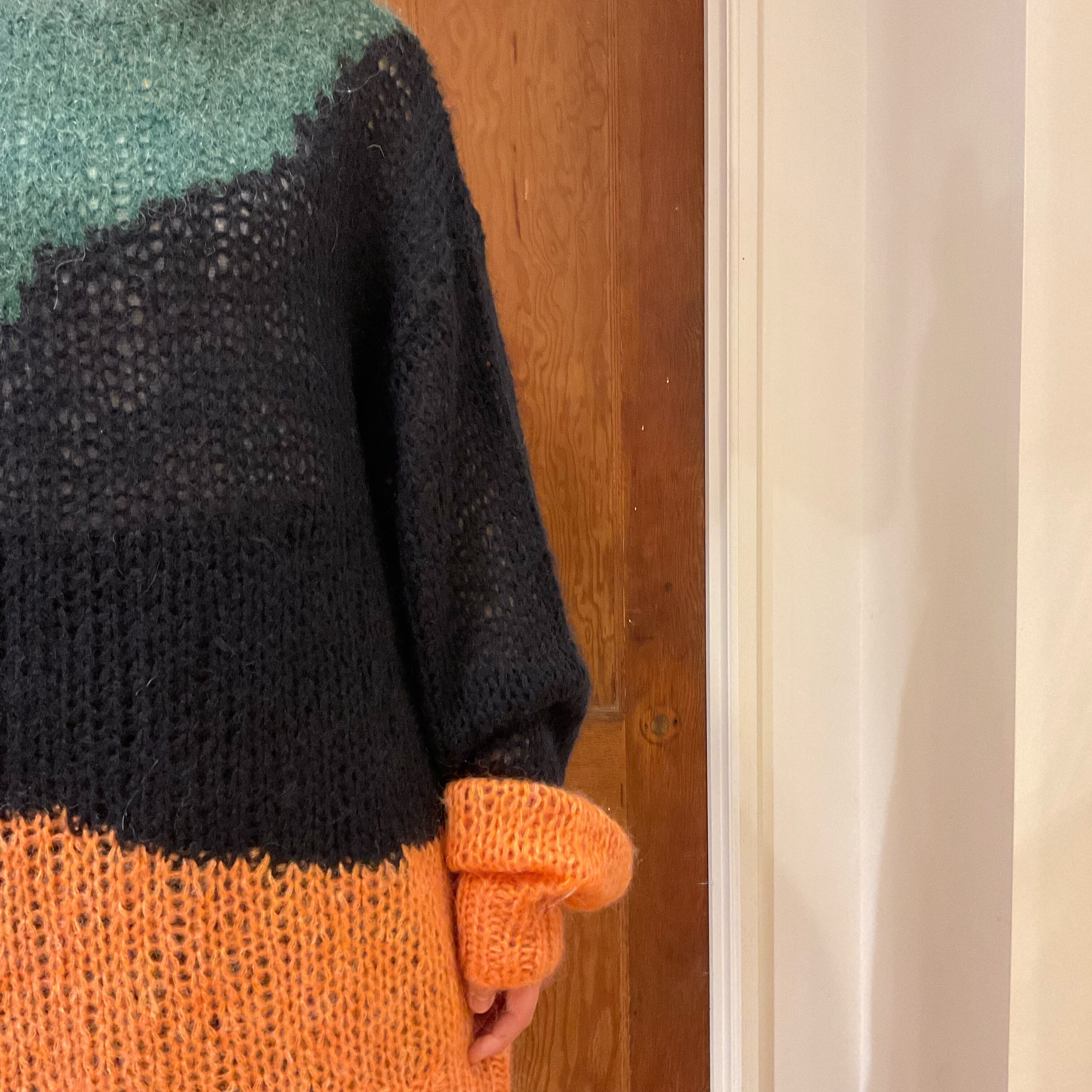 An oversize mohair jumper with bold wave motif with quirky colour mix.