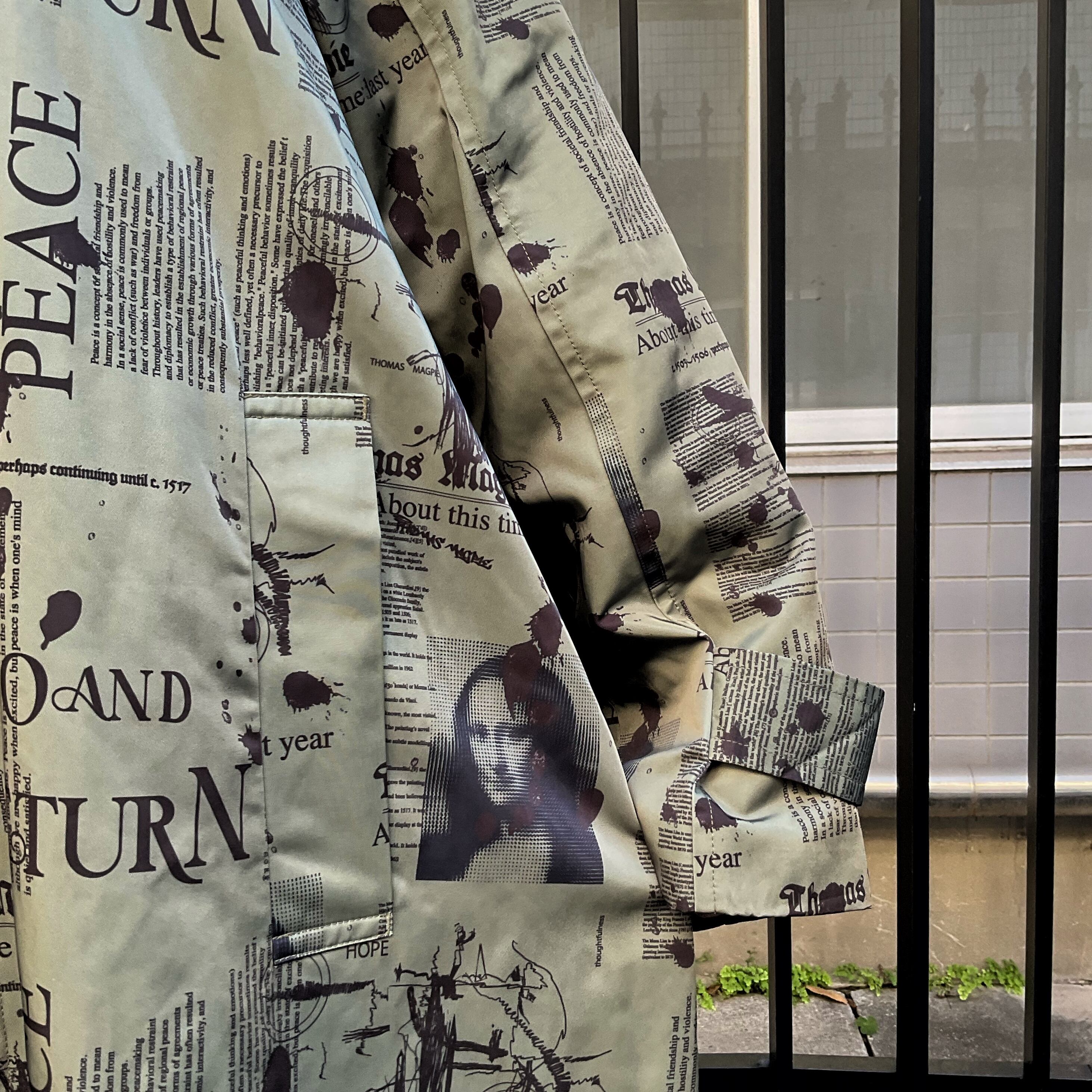 ハリがありシャリ感のあるポリエステル素材のオリジナルプリントのステンカラーコート