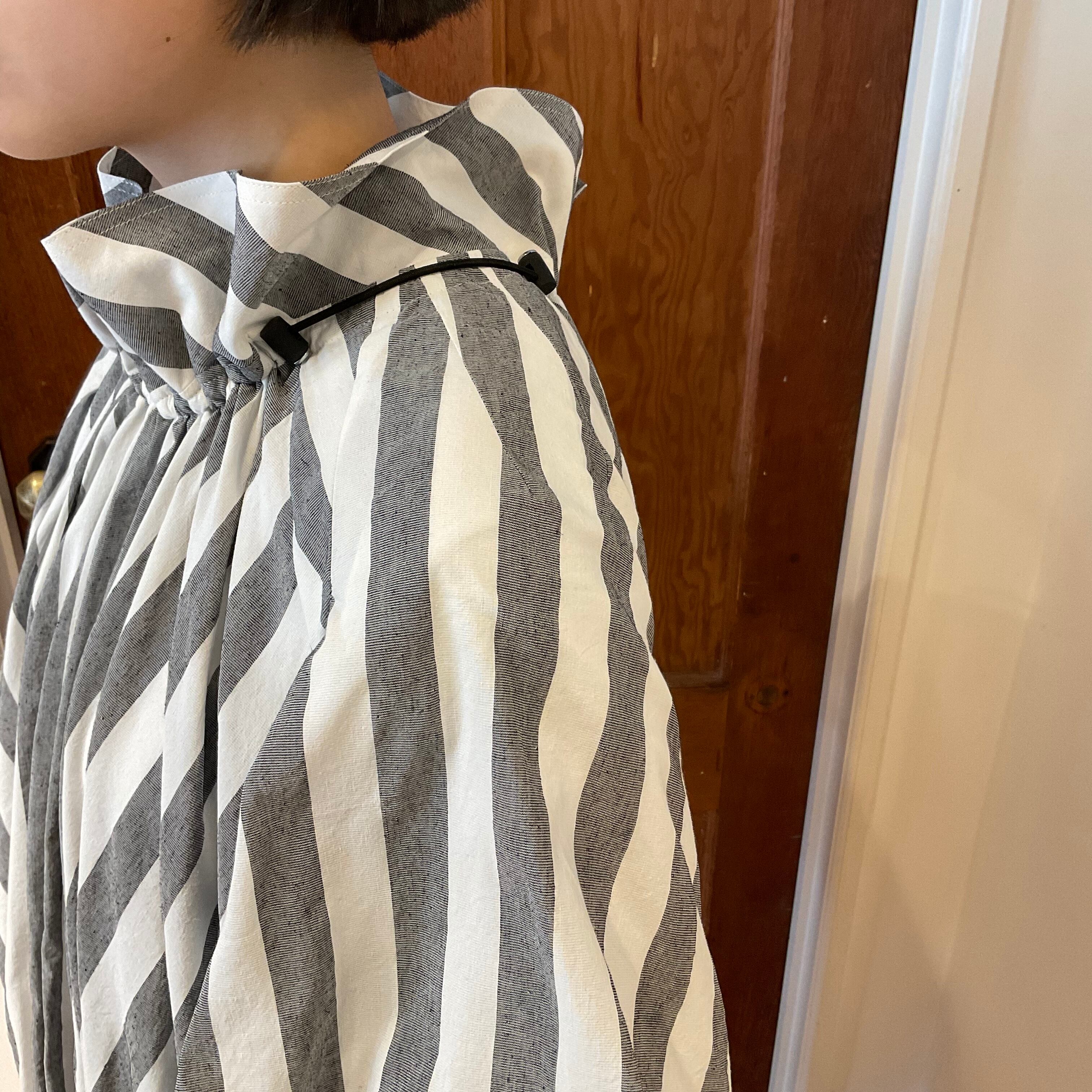 まるいシルエットでも、ライトグレーxピュアホワイトの極太ストライプが直線を強調し、シャキッと見せます