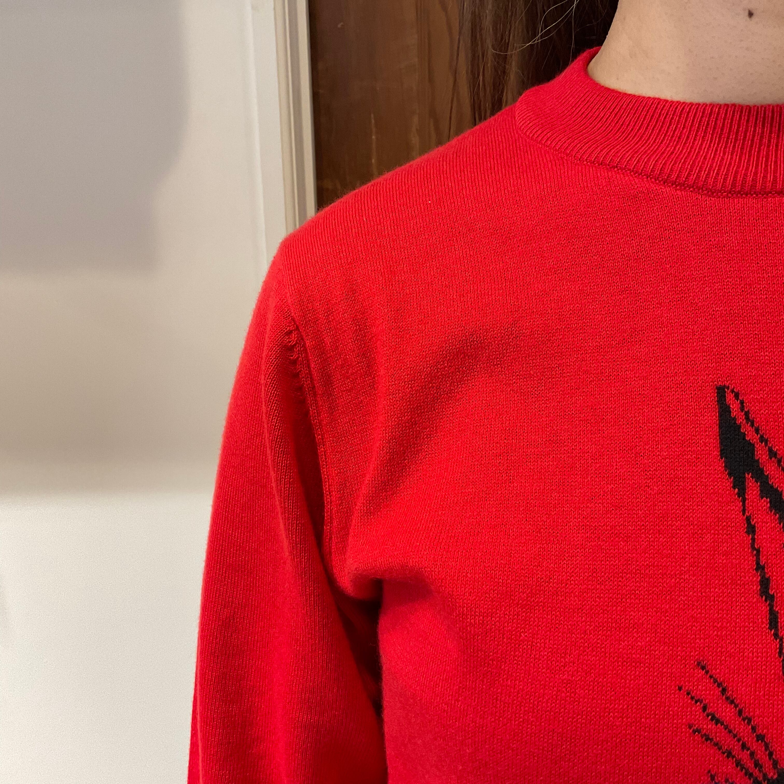 This is the knit with playful illustration and cheerful red,