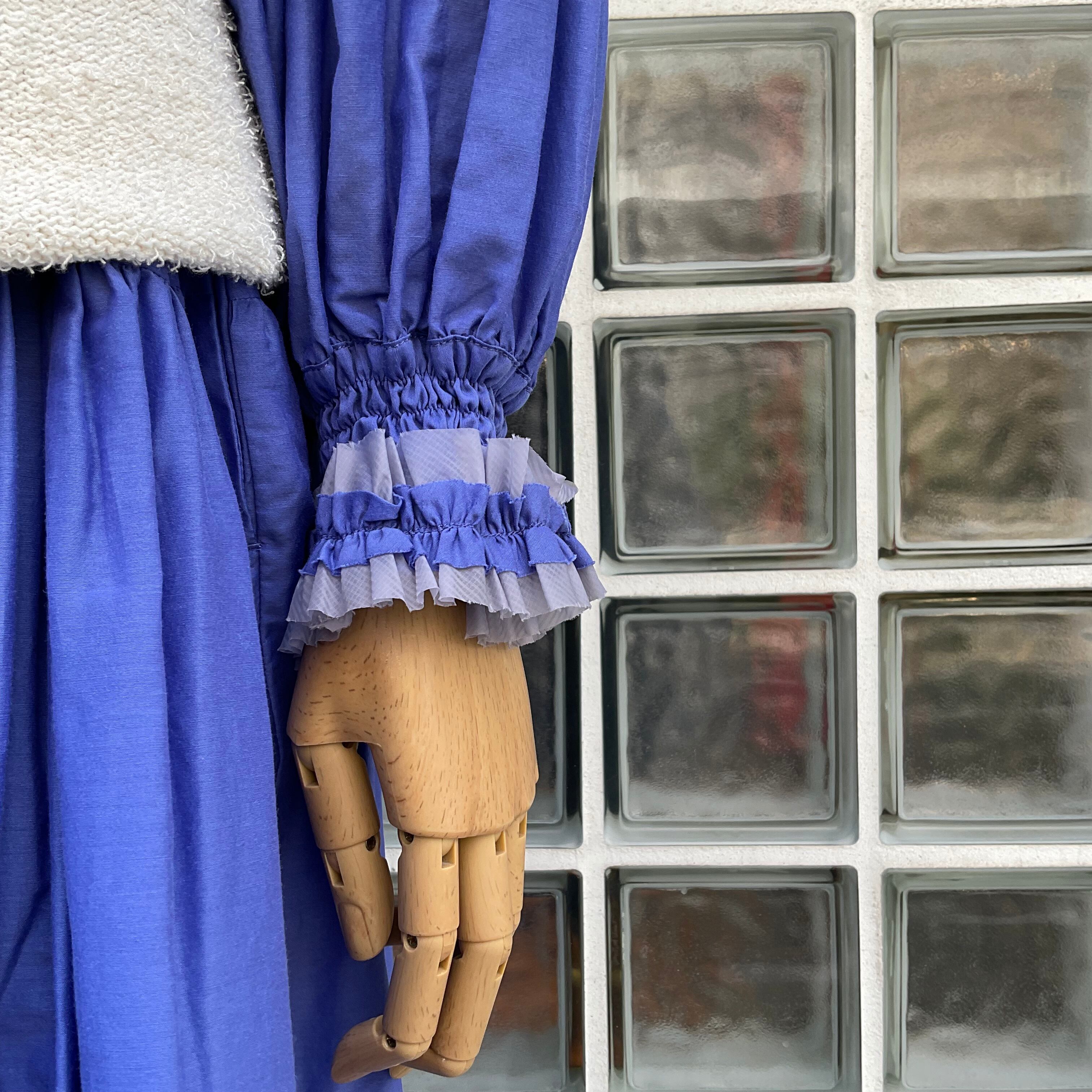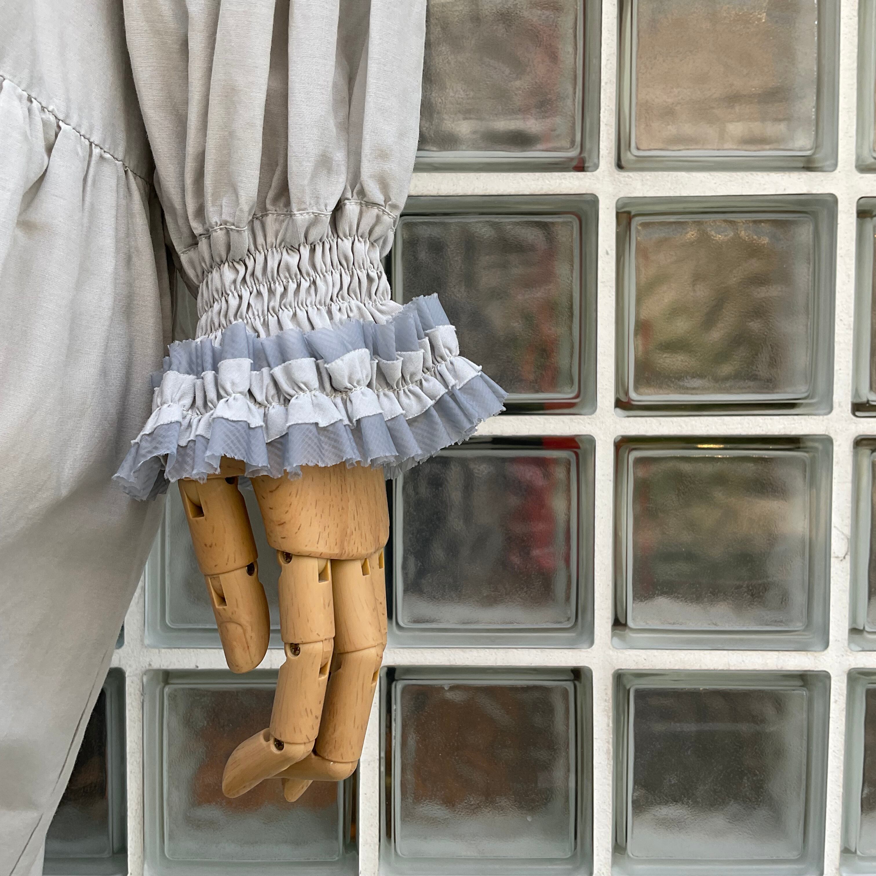 ウエストの絞りがなく、また腕まわりはゴムのシャーリングにプラスフリル。