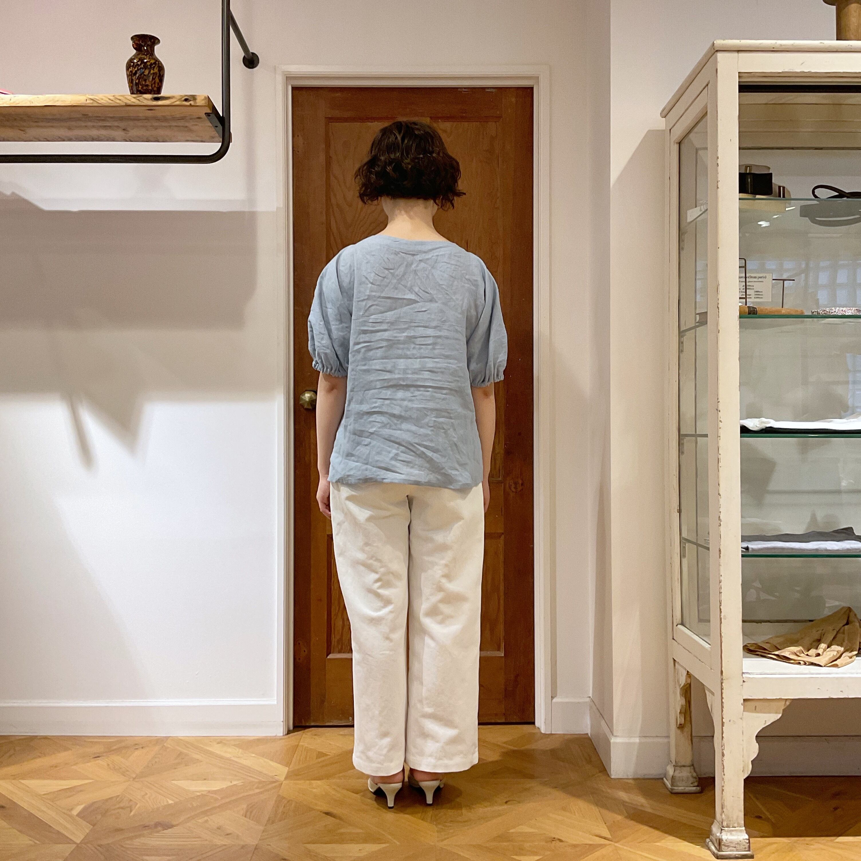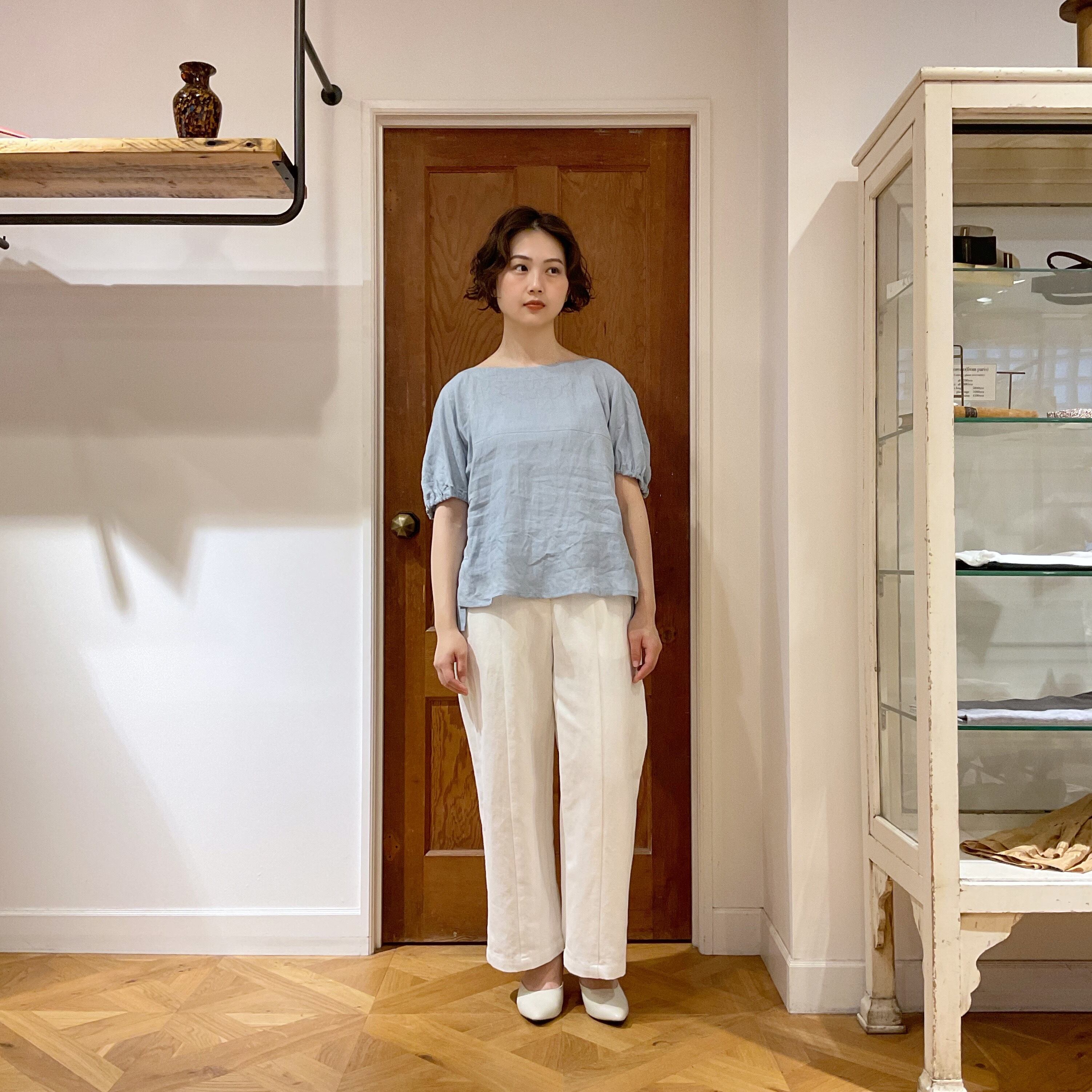 The material is made of lightweight French linen canvas fabric. It offers a natural and refreshing feel, and as you wear it repeatedly, it becomes softer in texture.