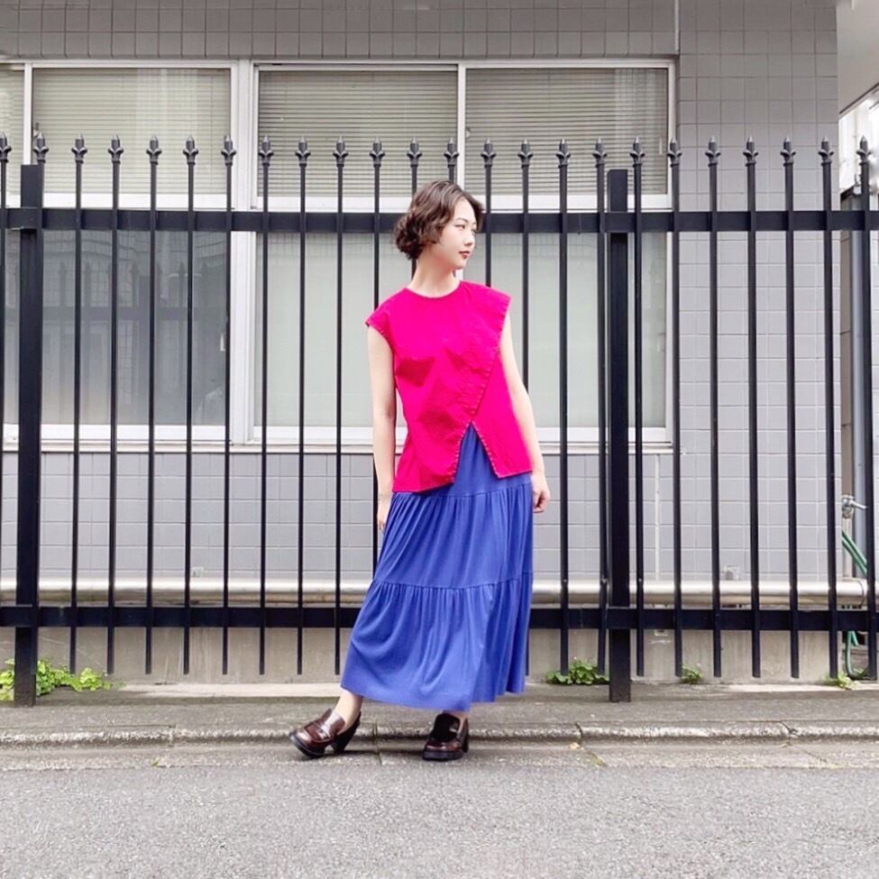 小柄な方なら細身のパンツや、写真のような横に広がらず下に落ちるスカートを持ってくると、バランスが取り易そう。