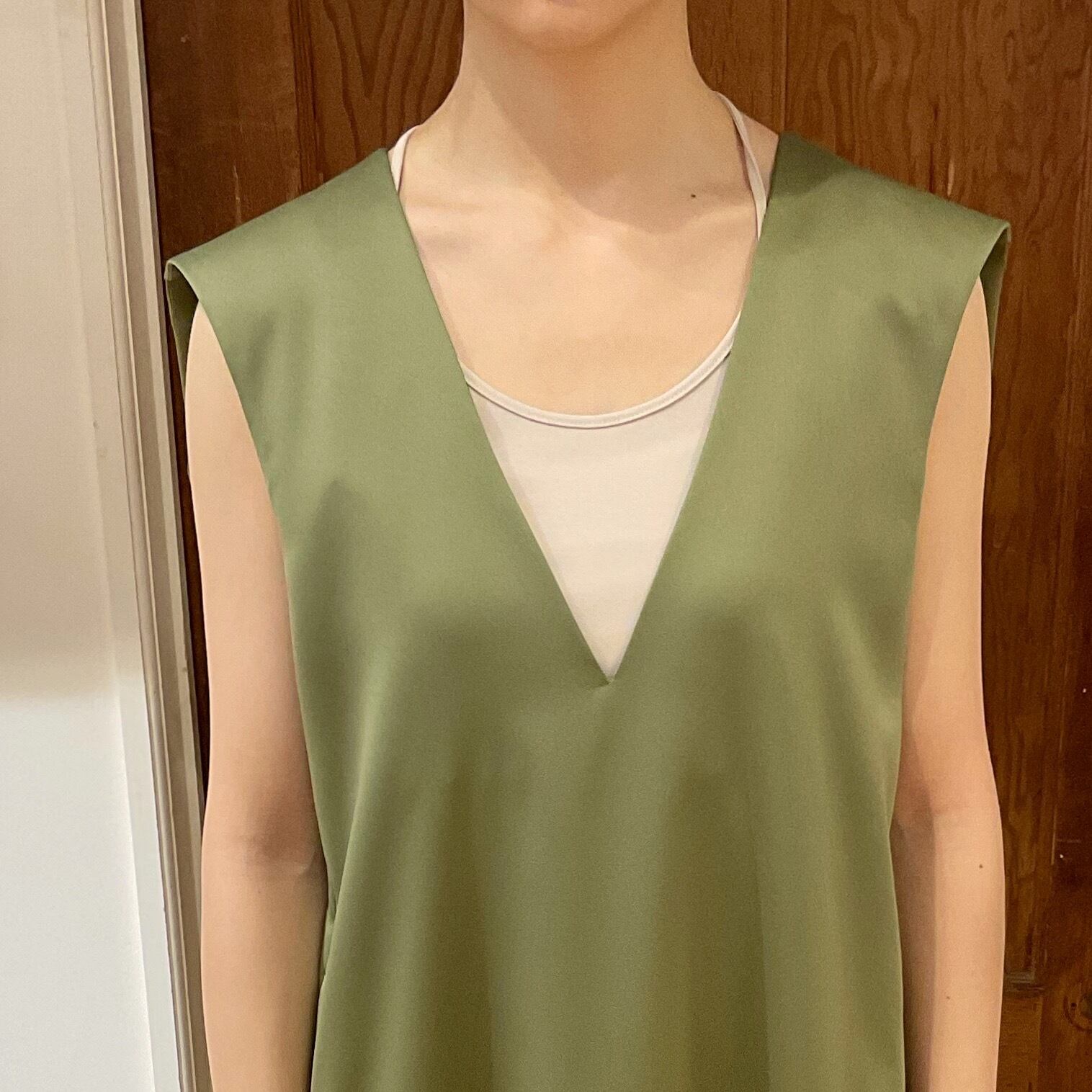 With its subtle sheen and a narrow yet deep V-neck, this garment exudes an elegant and feminine vibe.