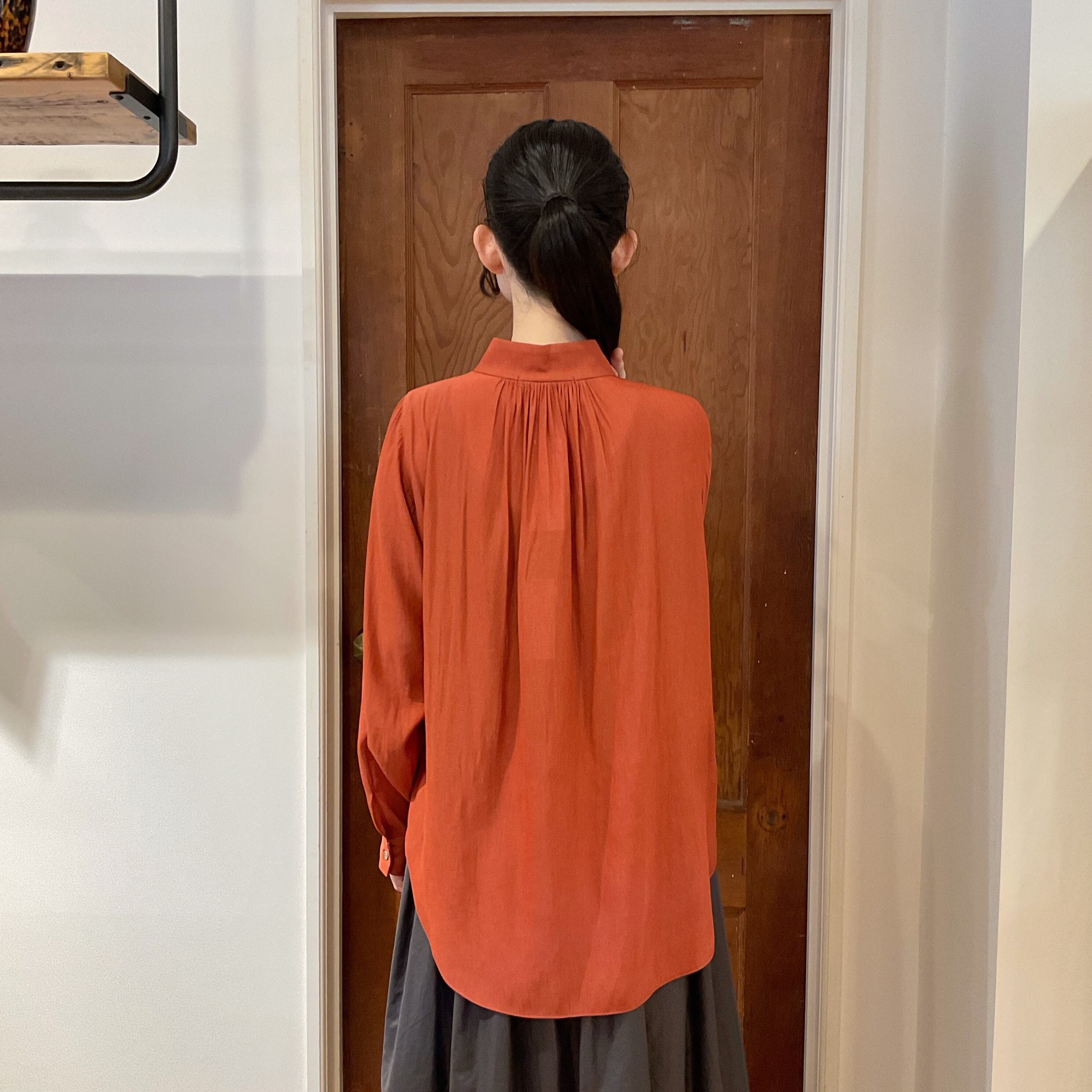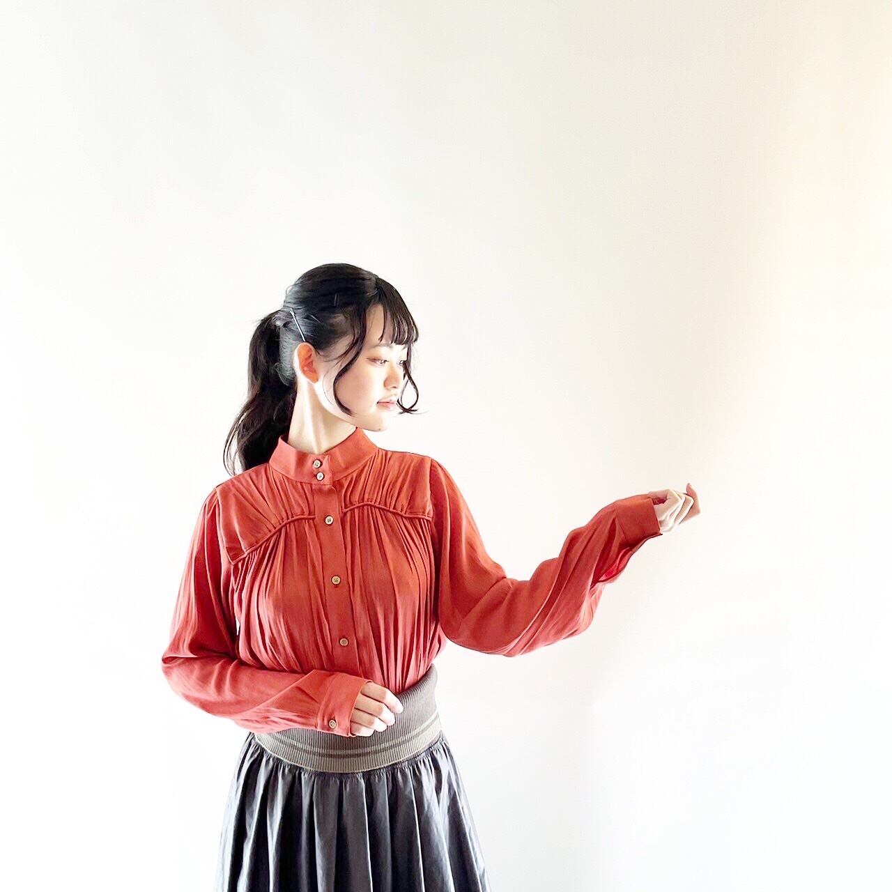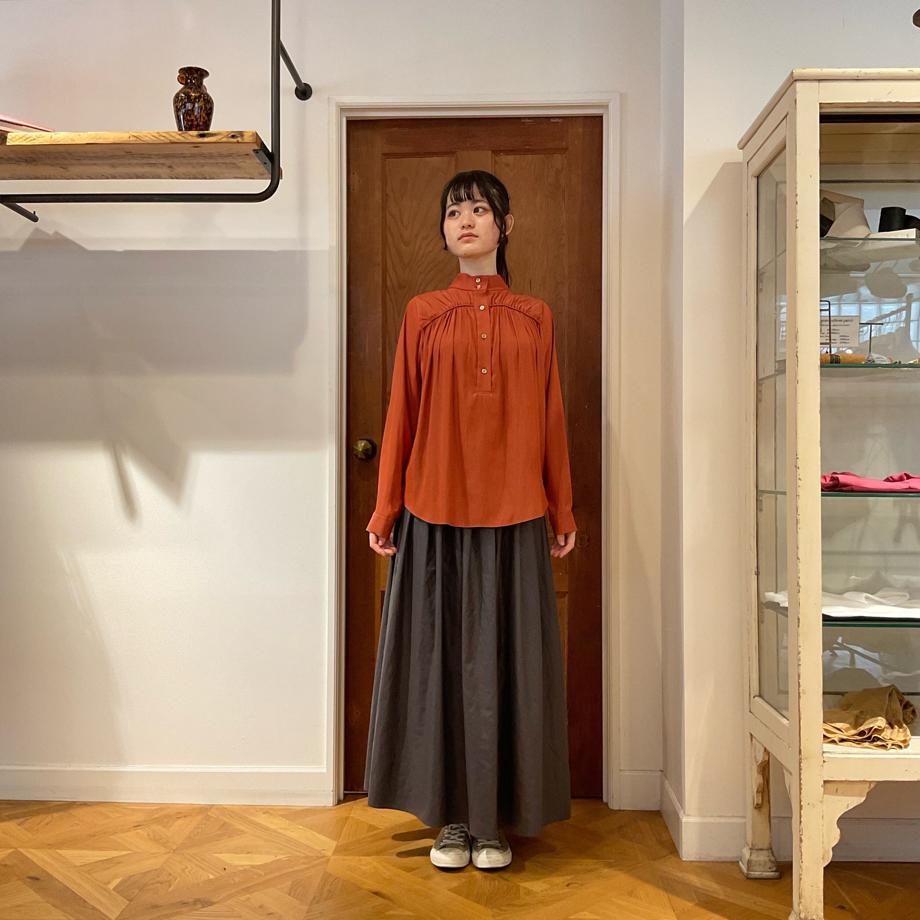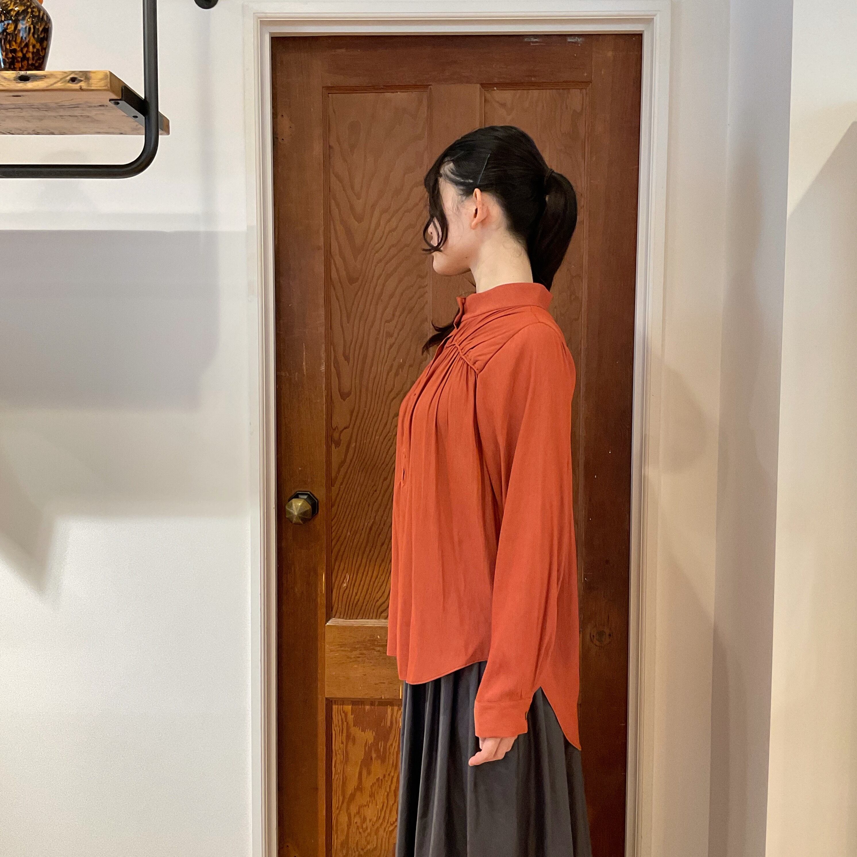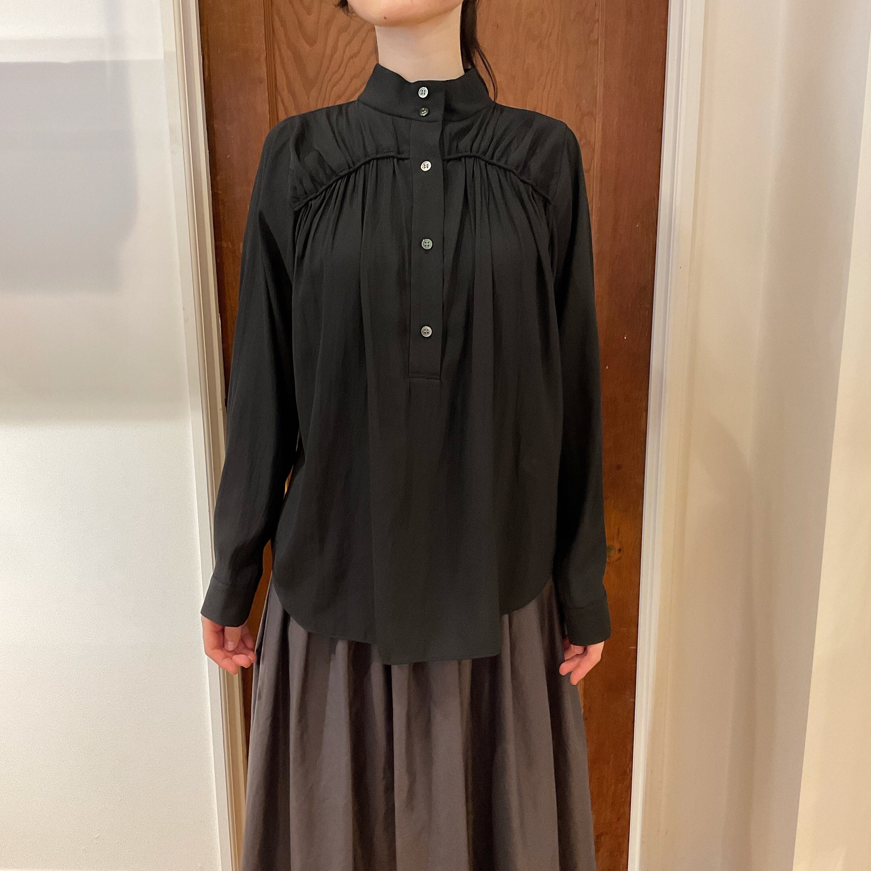 胸元のギャザーとちょっと立ち上がったハイネックがデザインポイントの、被りタイプのブラウス。
