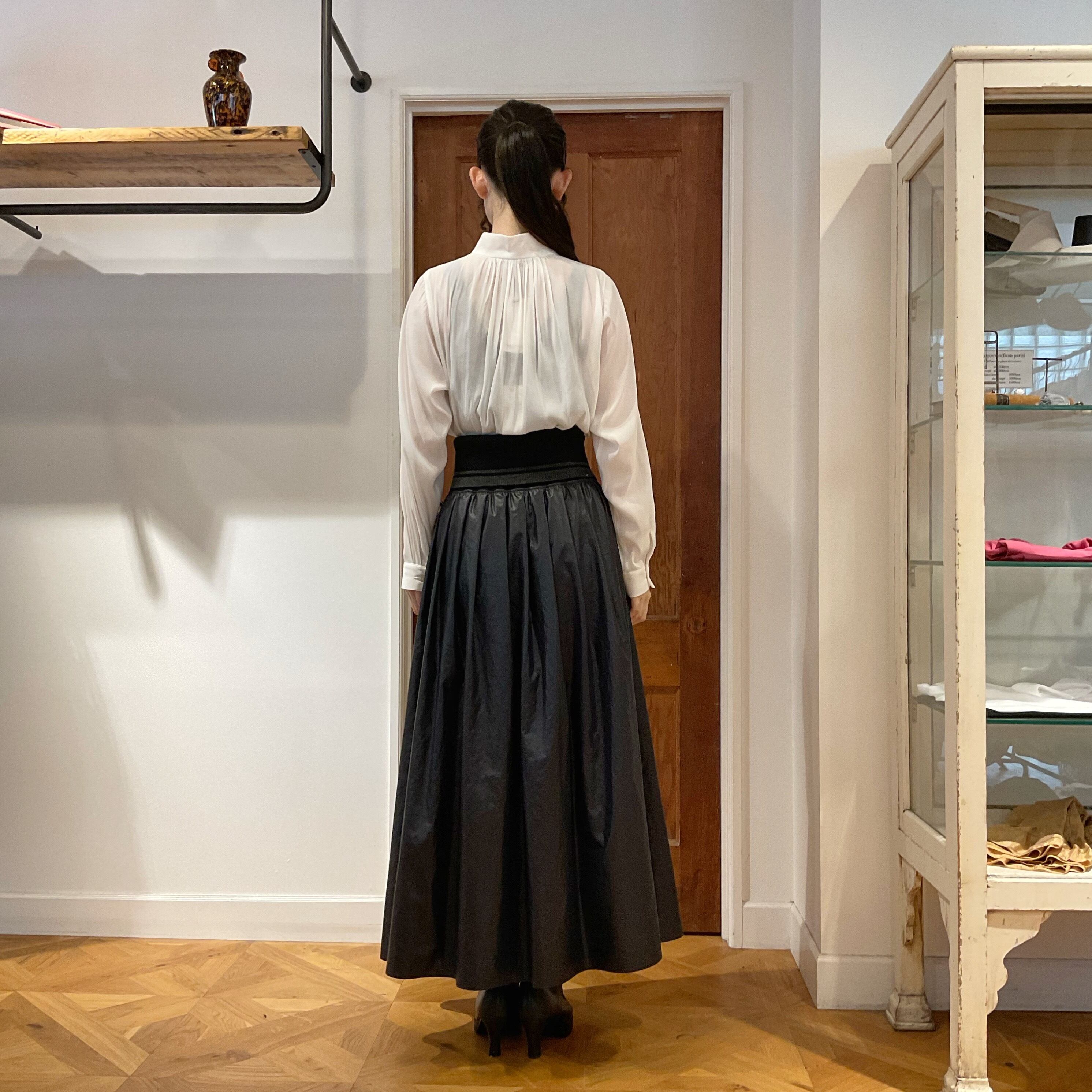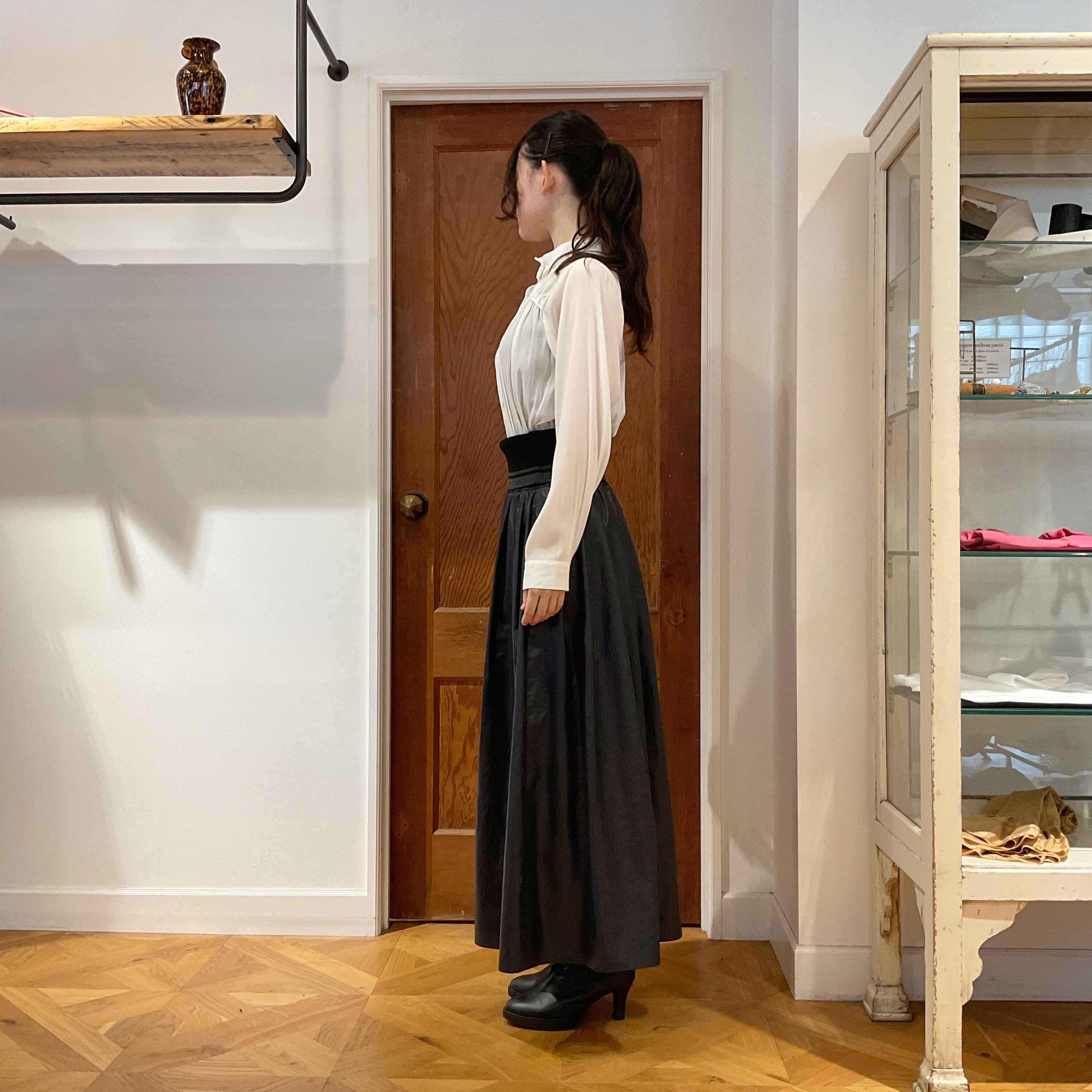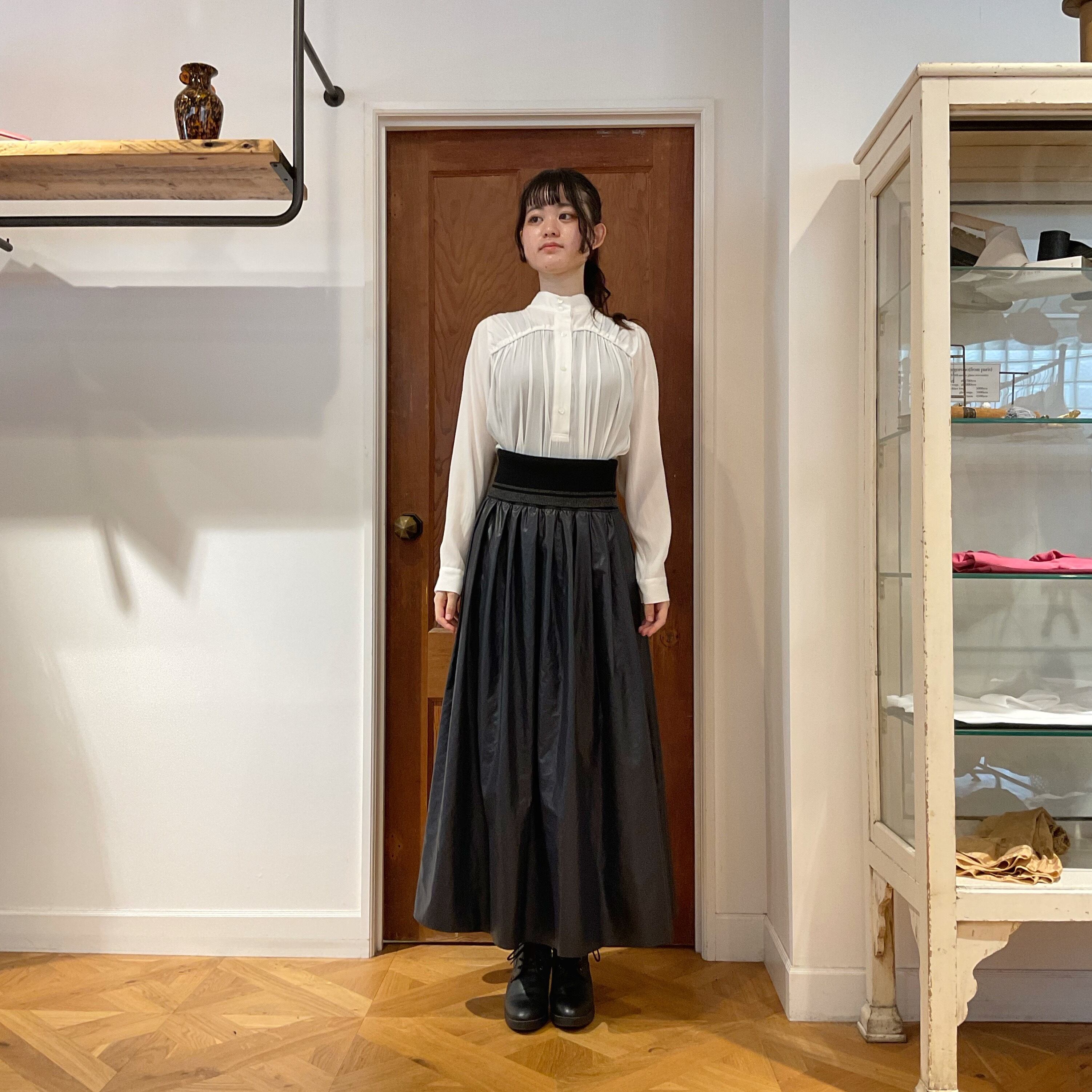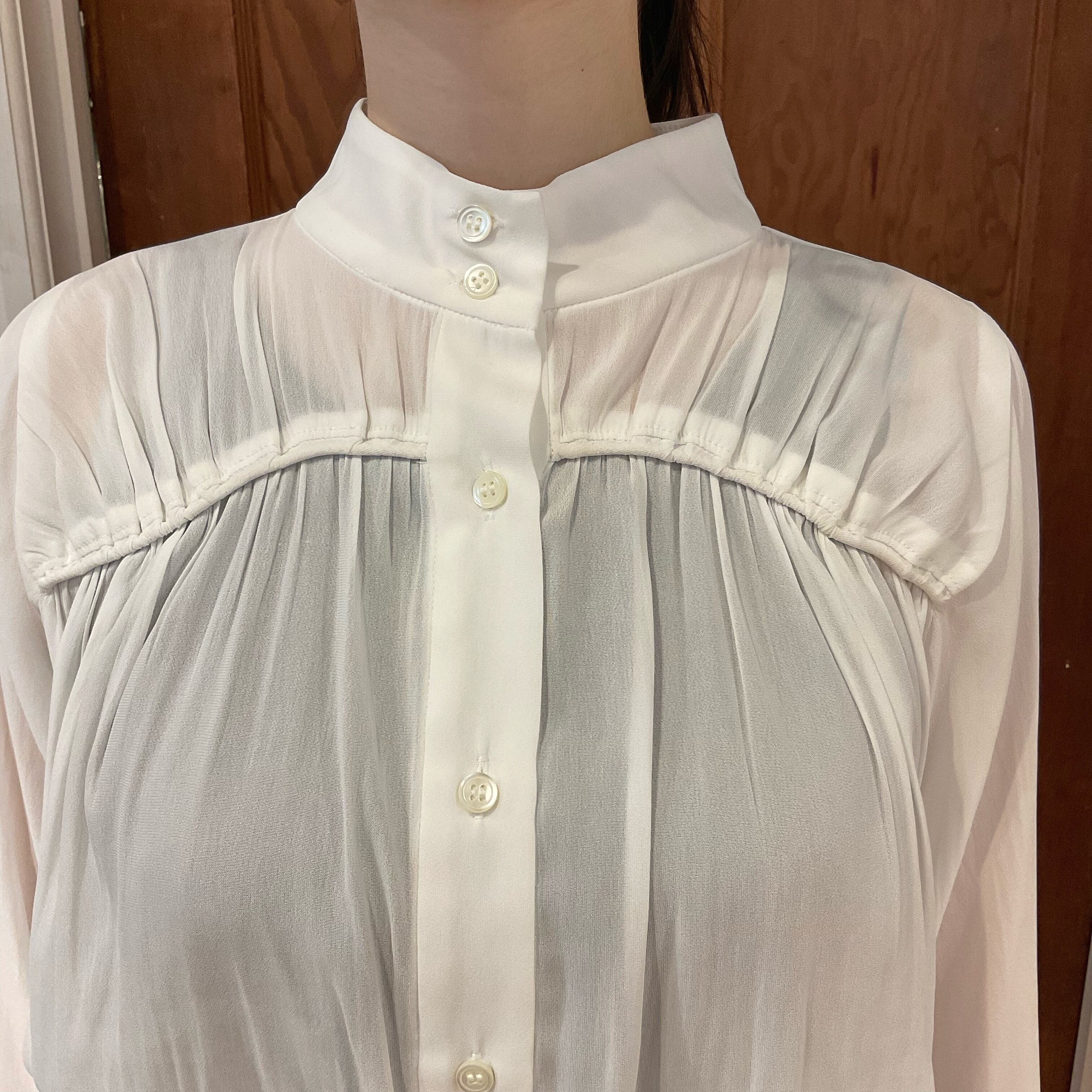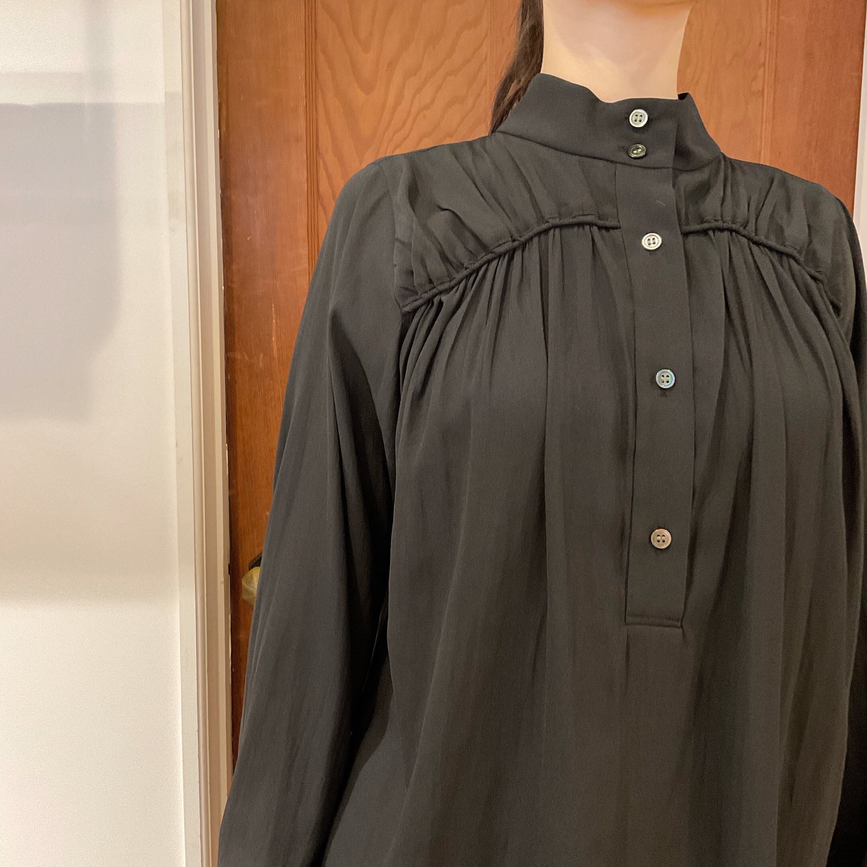胸元のギャザーとちょっと立ち上がったハイネックがデザインポイントの、被りタイプのブラウス。