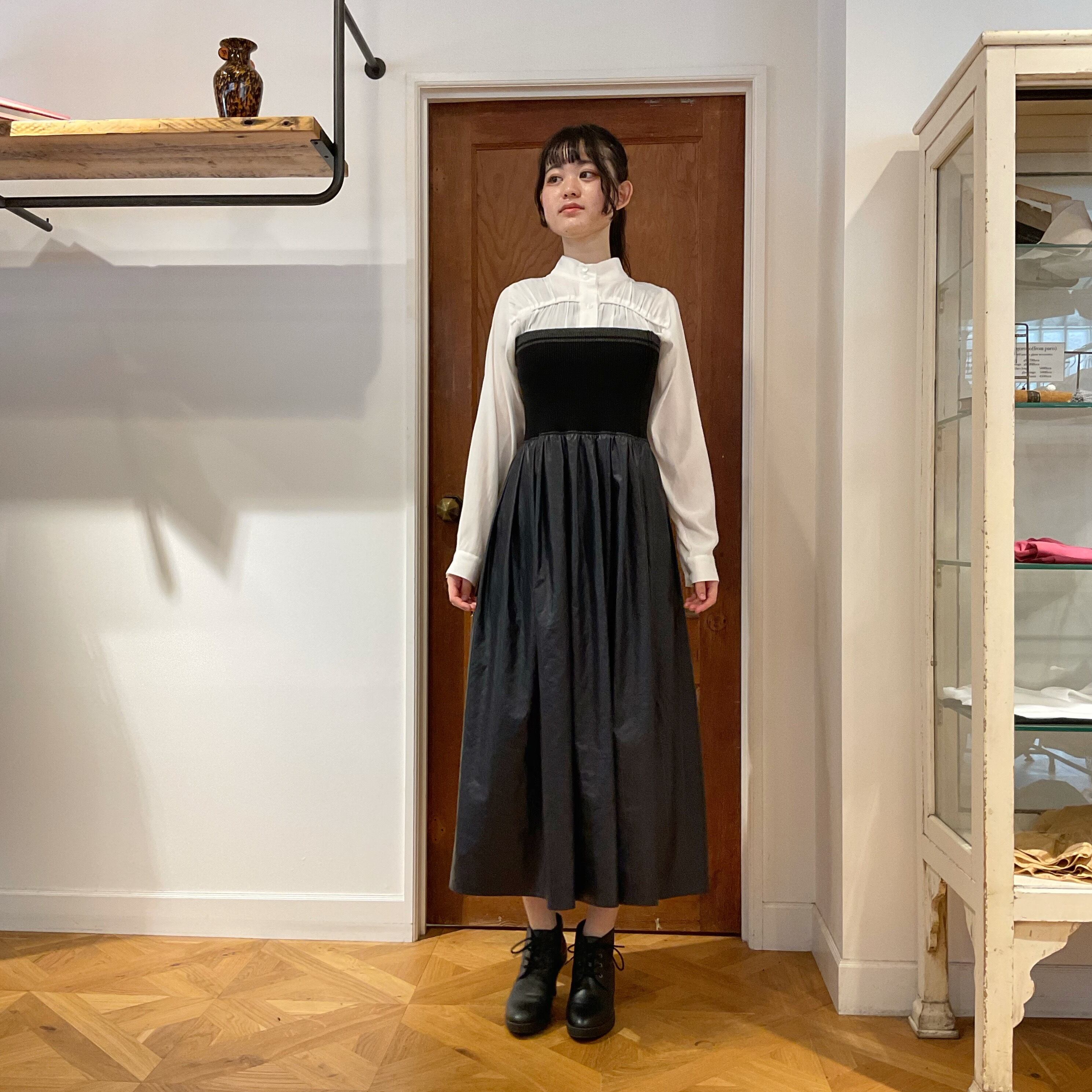 ウエスト部分はギャザーとタックで分量をとっているため、ギャザーだけよりもボリュームが抑えられており、大人っぽいすっきりとした見え方に。