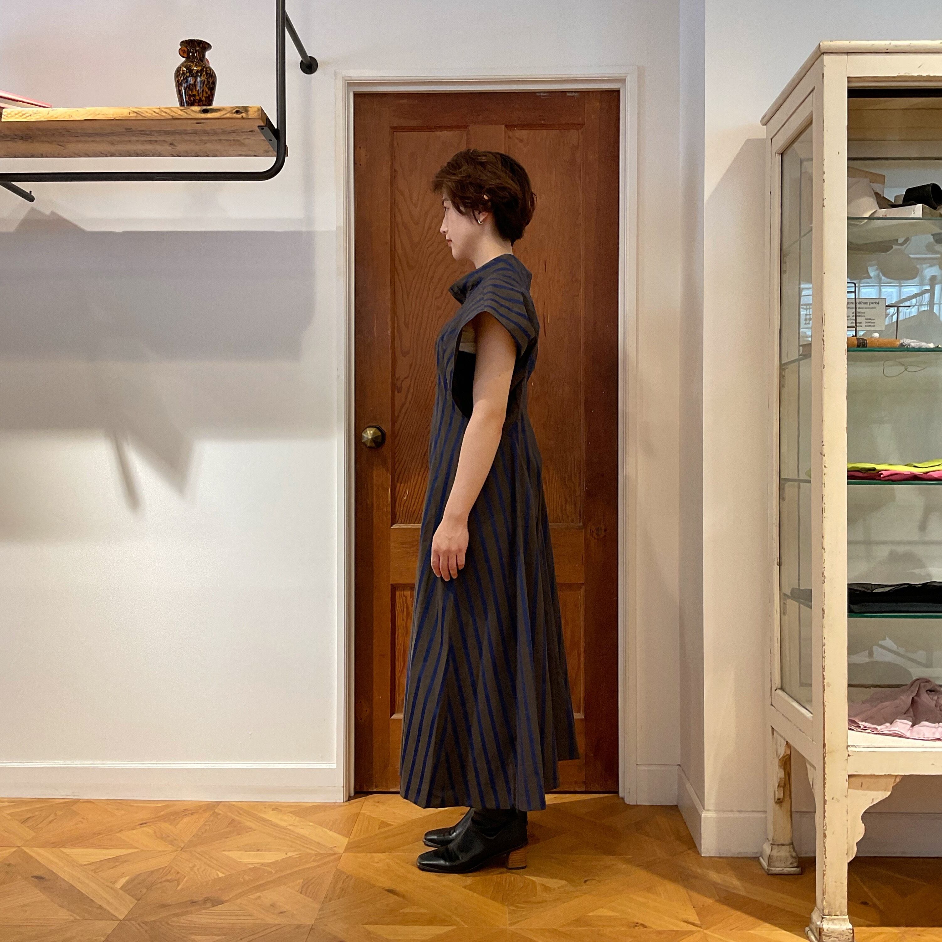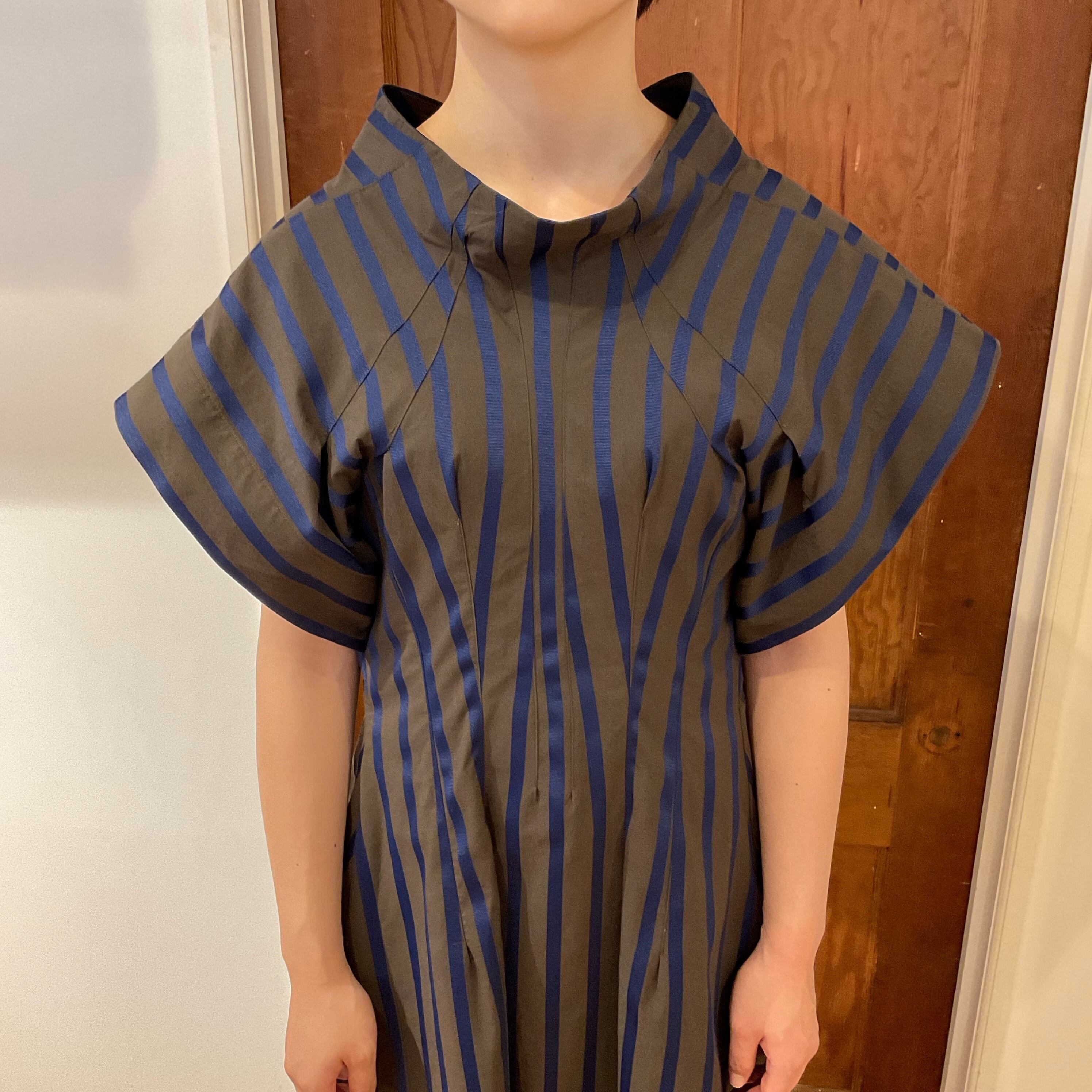 大胆なストライプと肩のデザインが目を引くけれど、どこか静寂な雰囲気も漂うワンピース。
