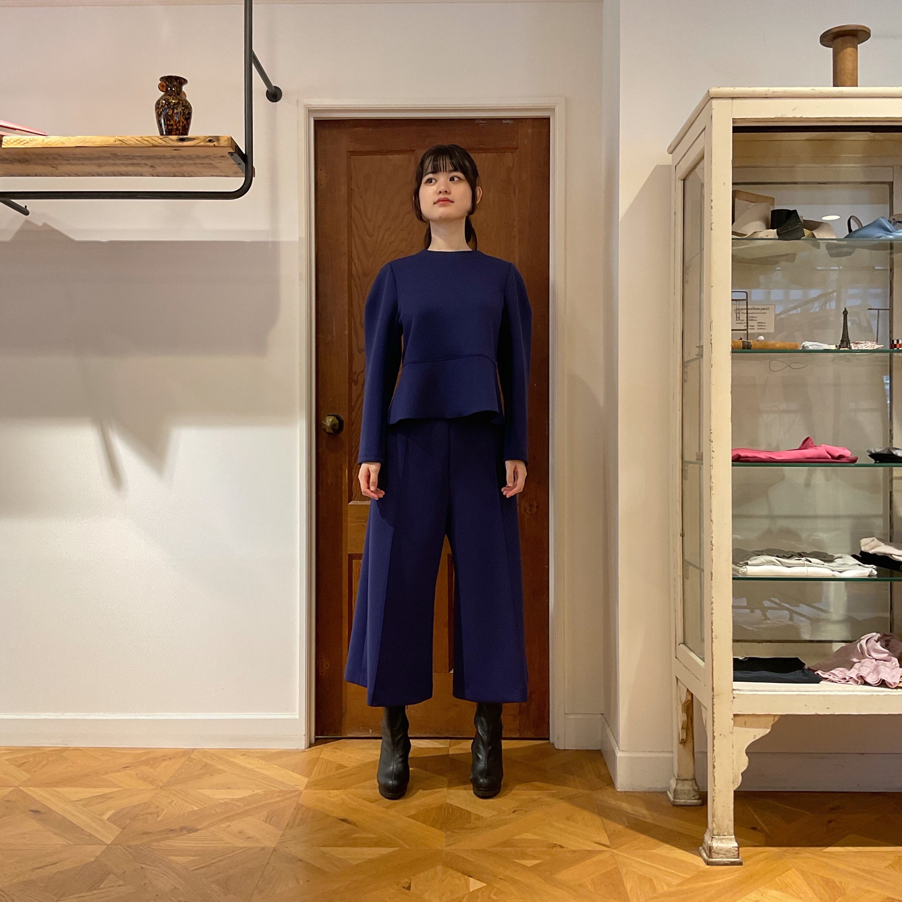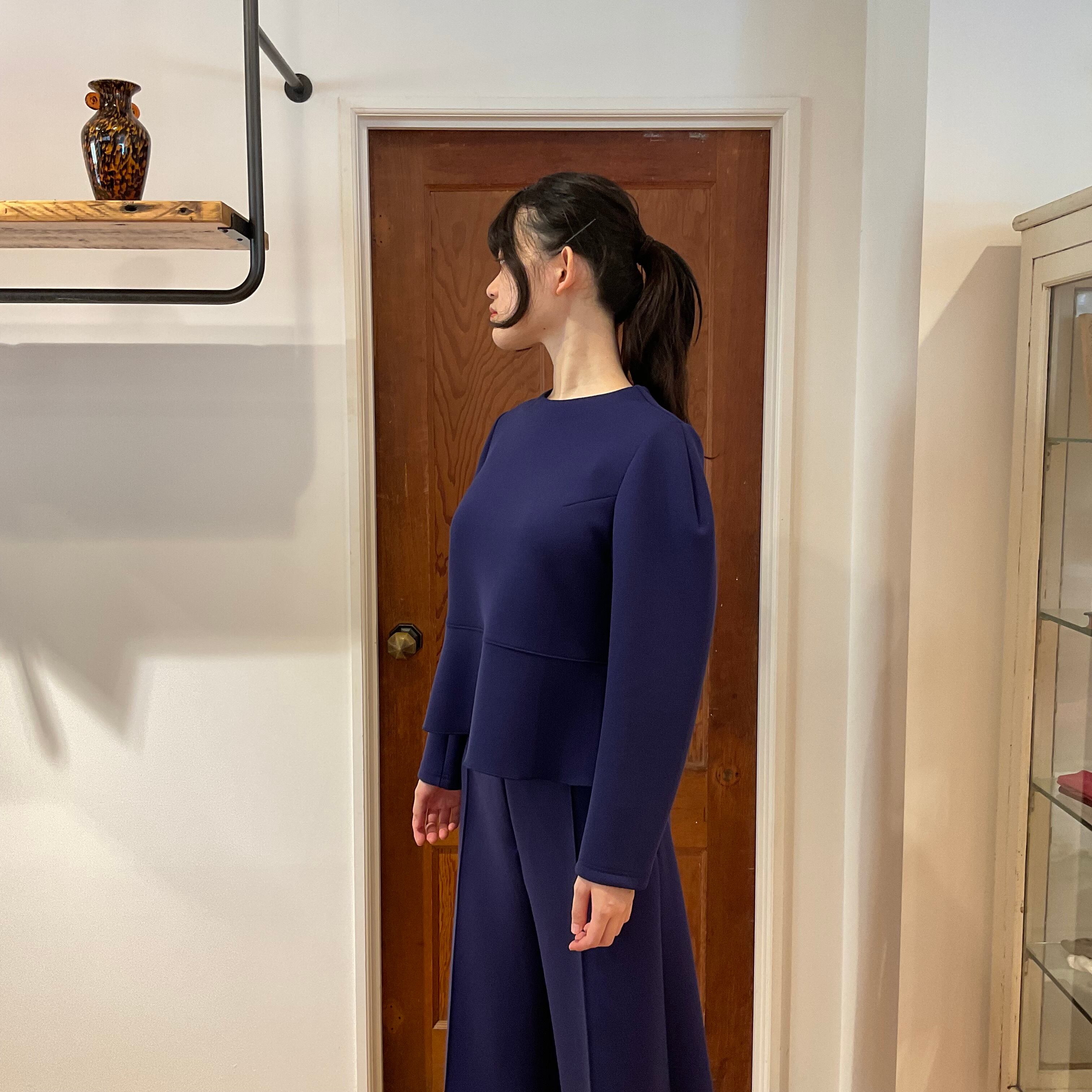 マスキリンな肩デザインと裾のレディなペプラムがバランス良く融合した1枚で決まるデザイントップ。