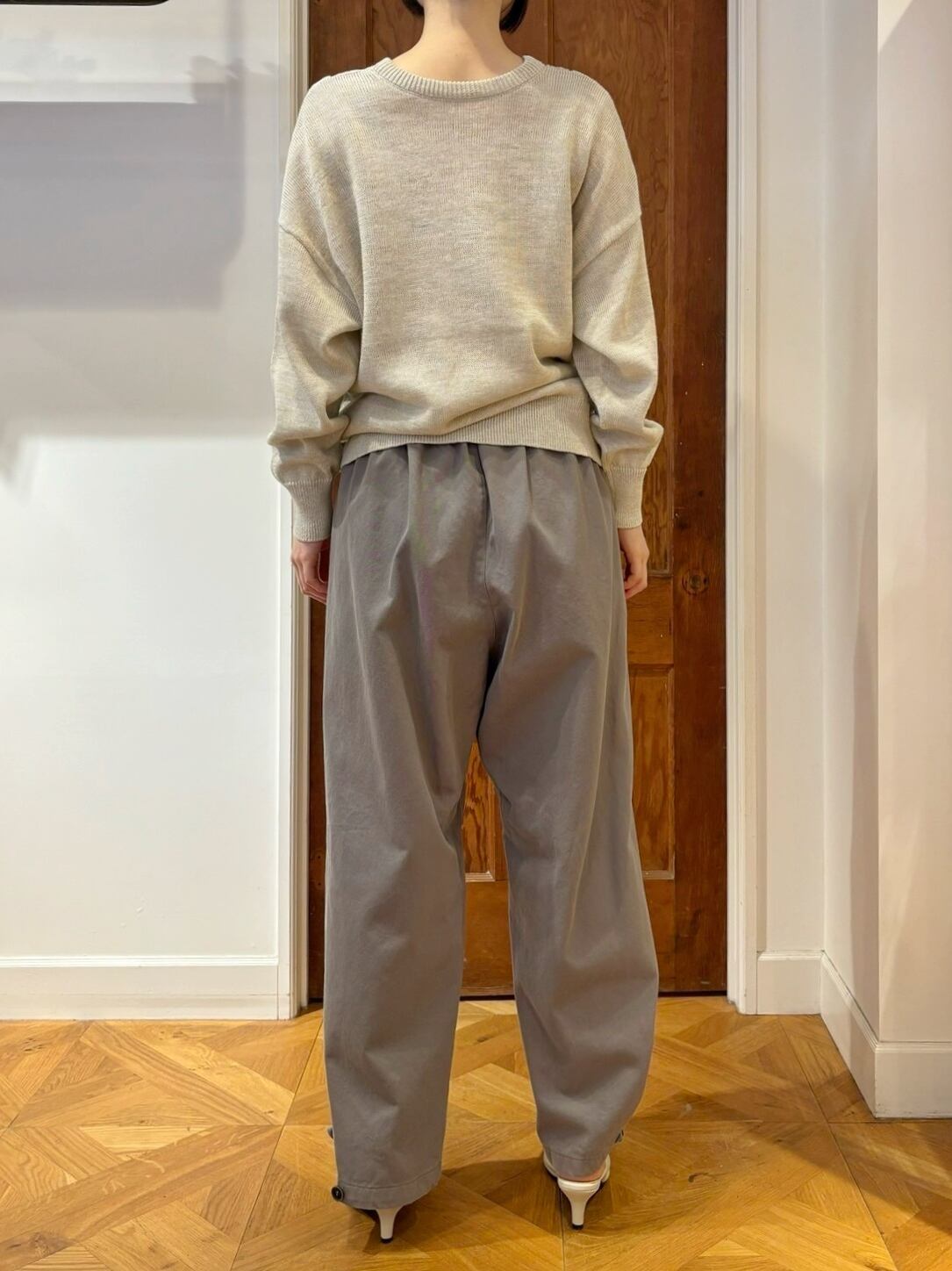 パンツはスキニーなどのピタッとする細身よりは、裾にかけて緩やかに細くなるくらいのシルエットやトレンドのパラシュートパンツやカーブパンツを選ぶとより、ニットのリラックス感が引き立ち、こなれた雰囲気に。
