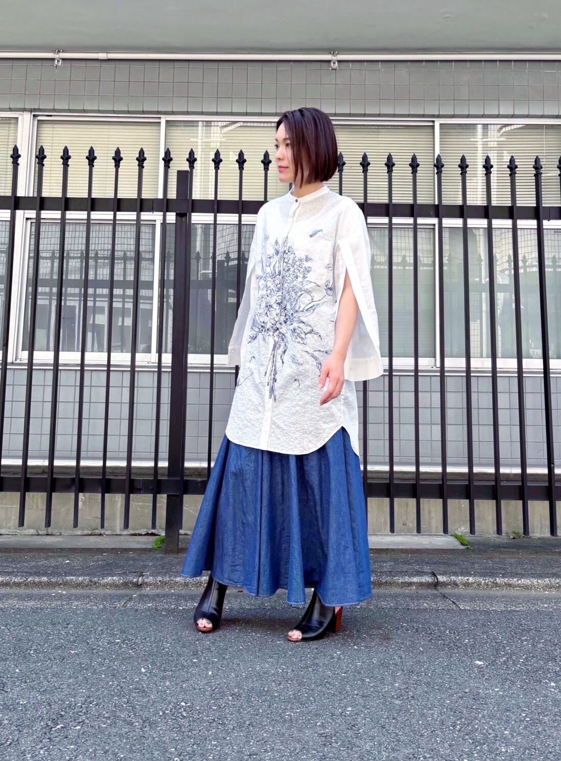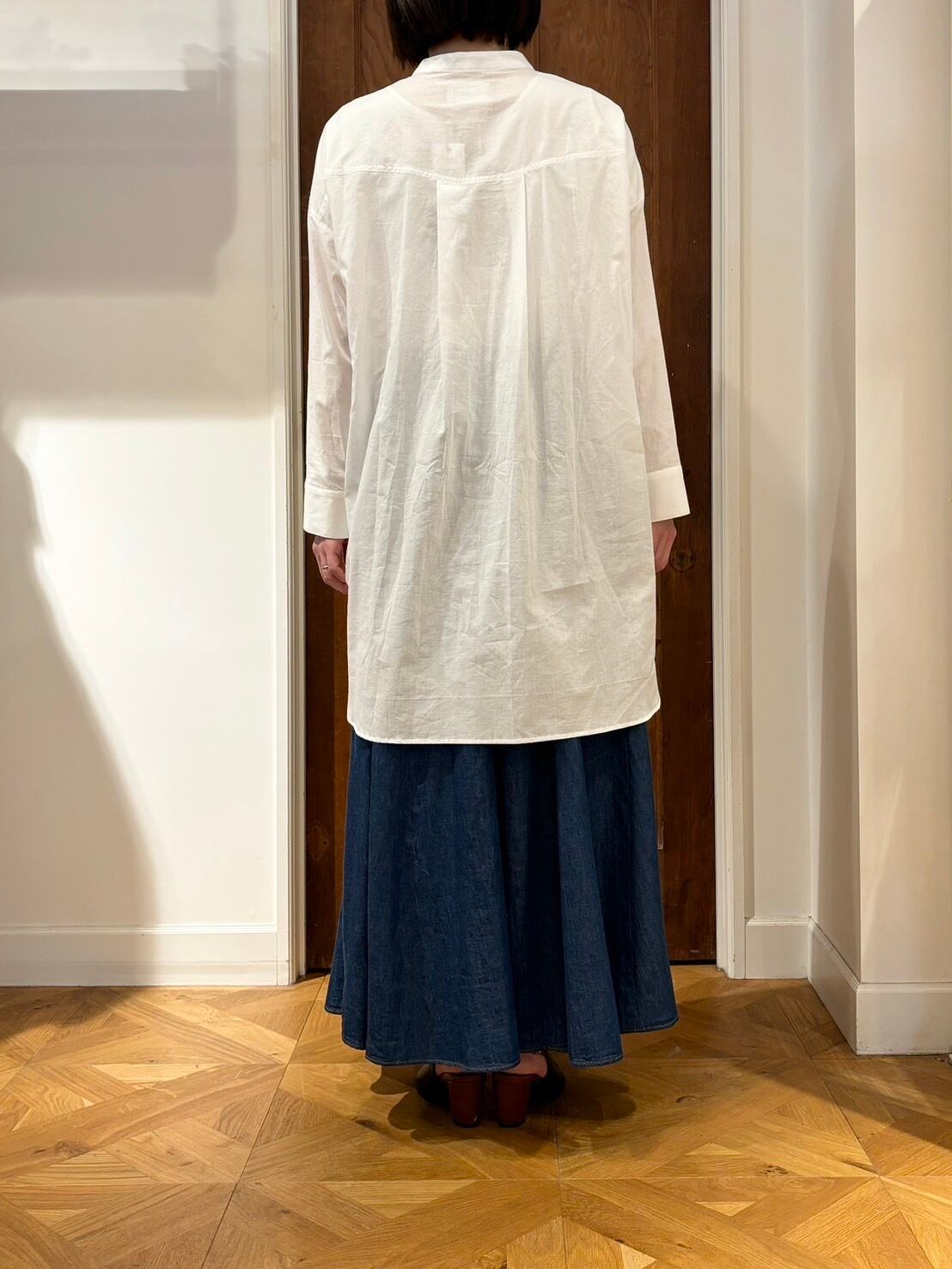 シアー感のある軽いコットンなので、ワイドパンツやロング丈のタイトスカートでIラインを意識した着こなしも良さそう。