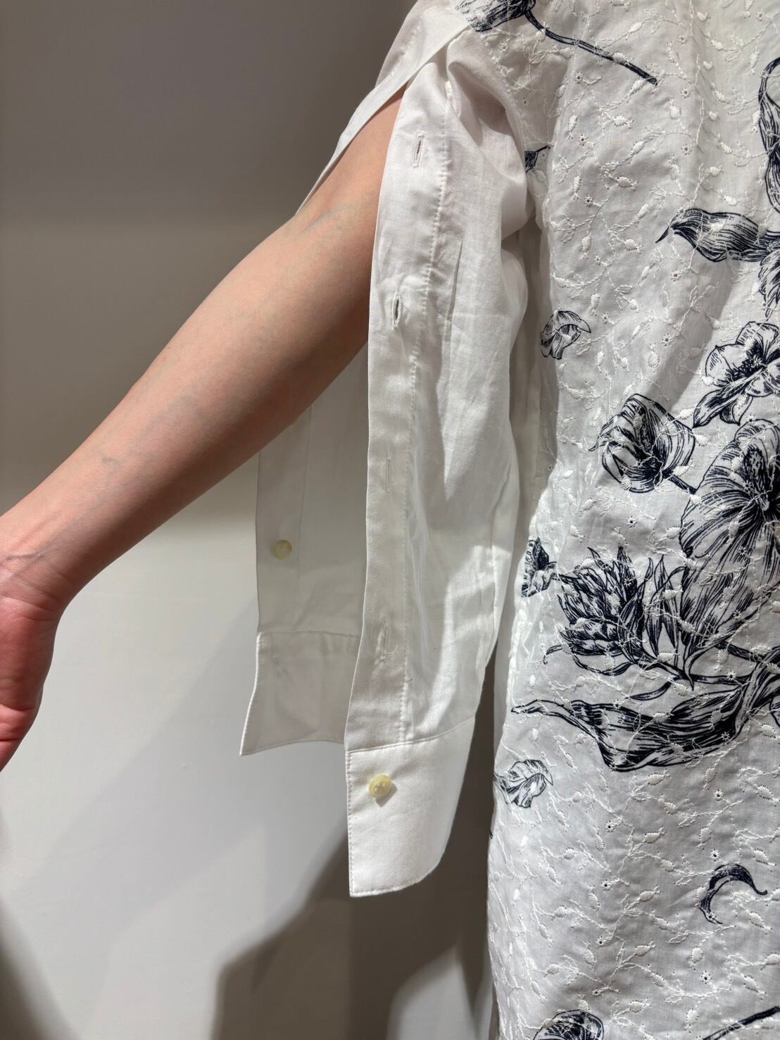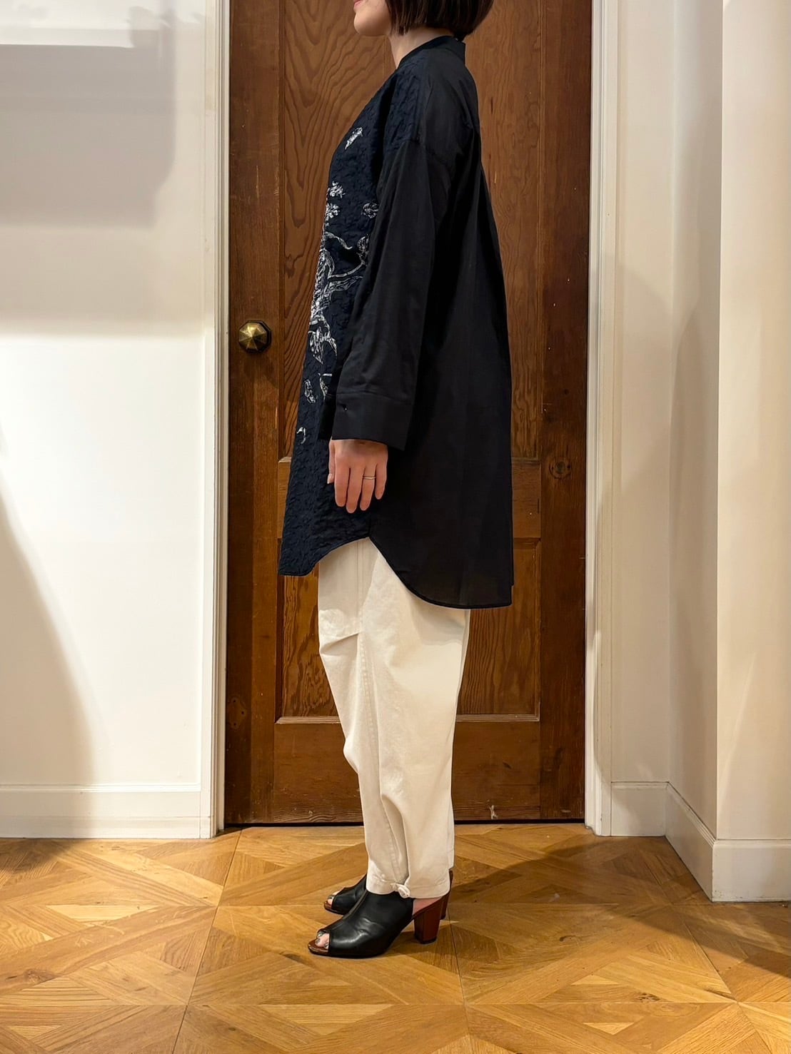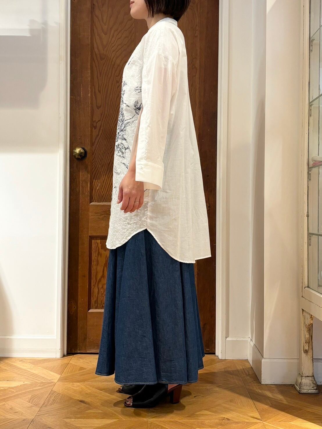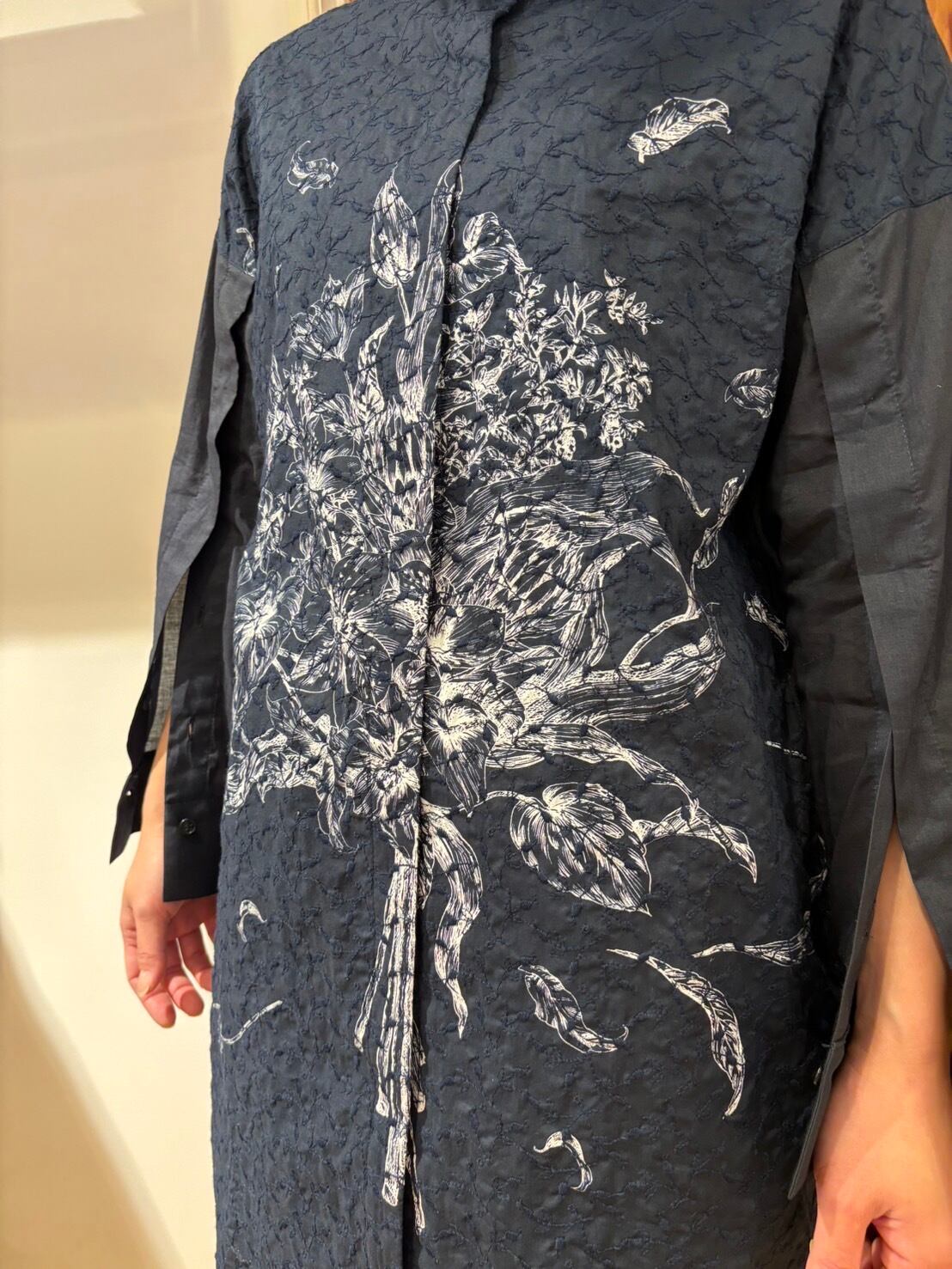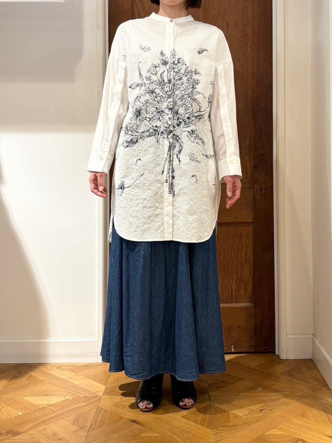 前面にオリジナル刺繍とデザイナー自身がブーケを描いたドローイングがプリントで配されたチュニックブラウス。