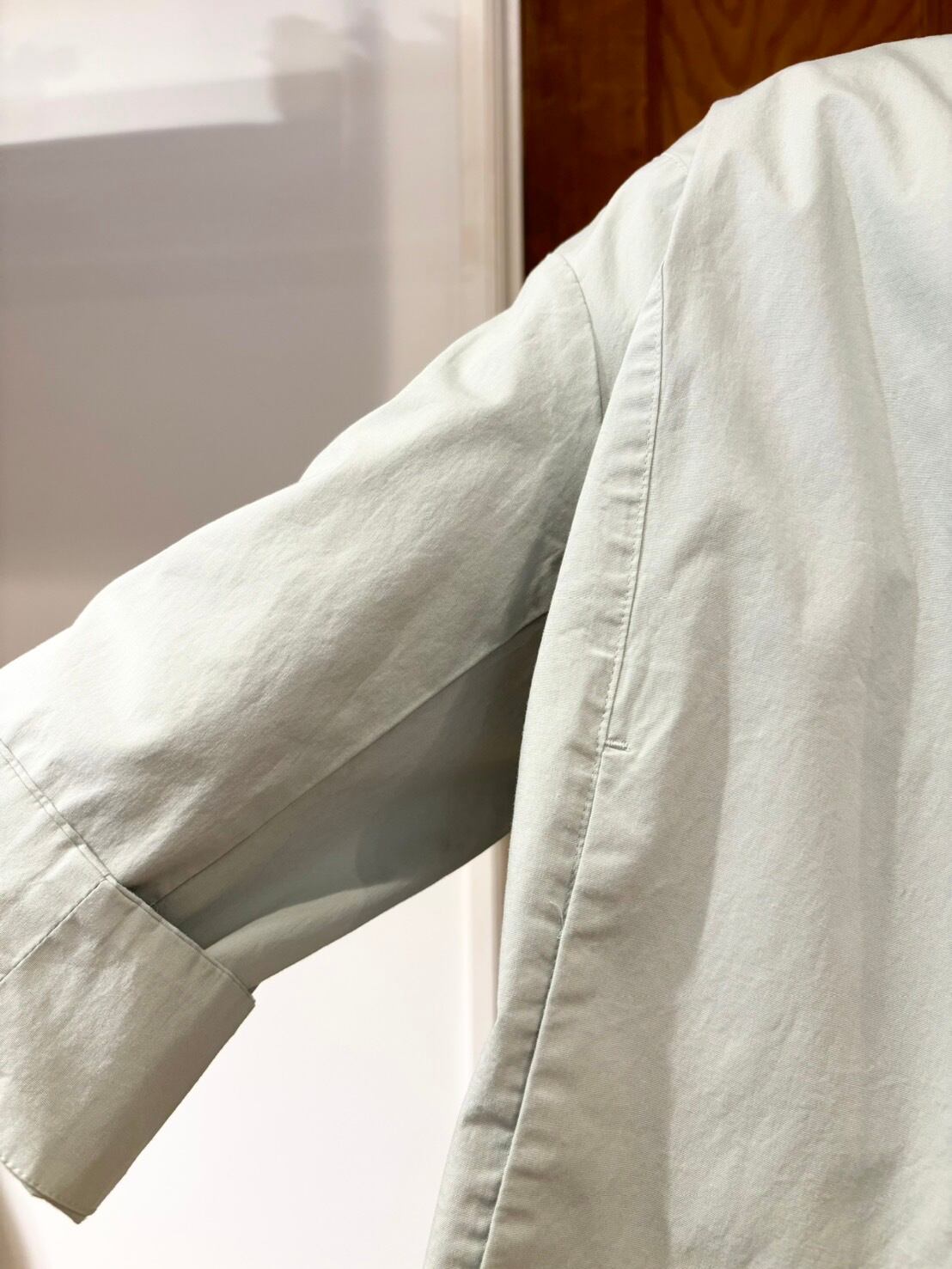 What stands out first is the material. Despite being cotton, it is resistant to wrinkles and has quick-drying properties, making it an easy-care fabric.