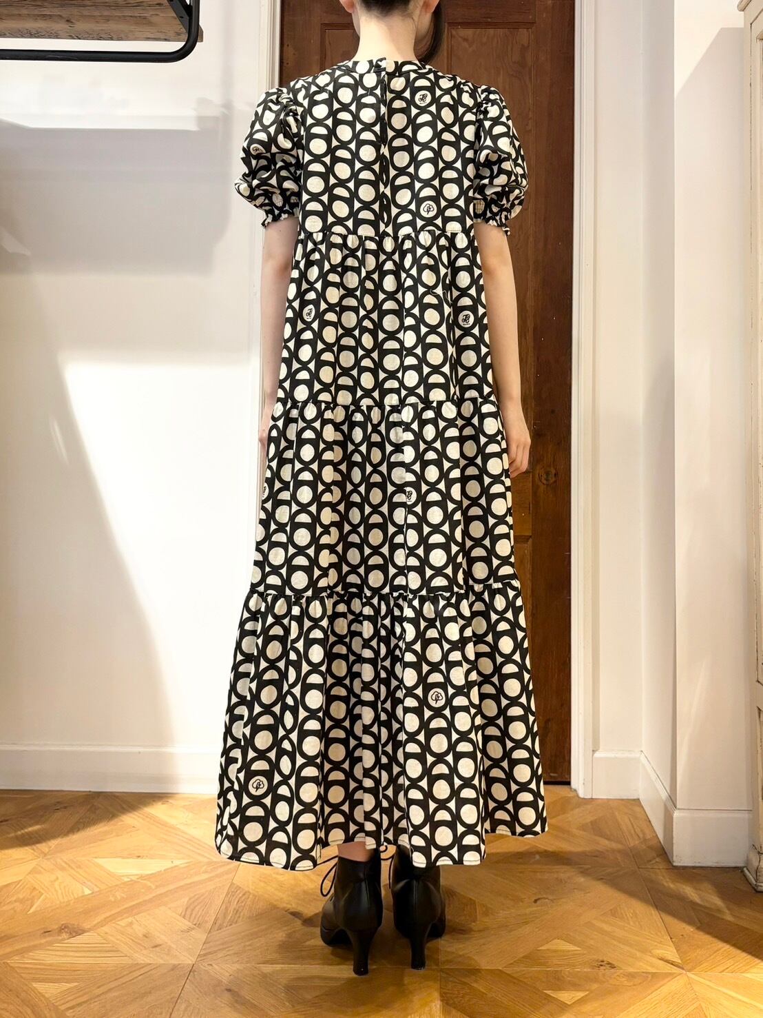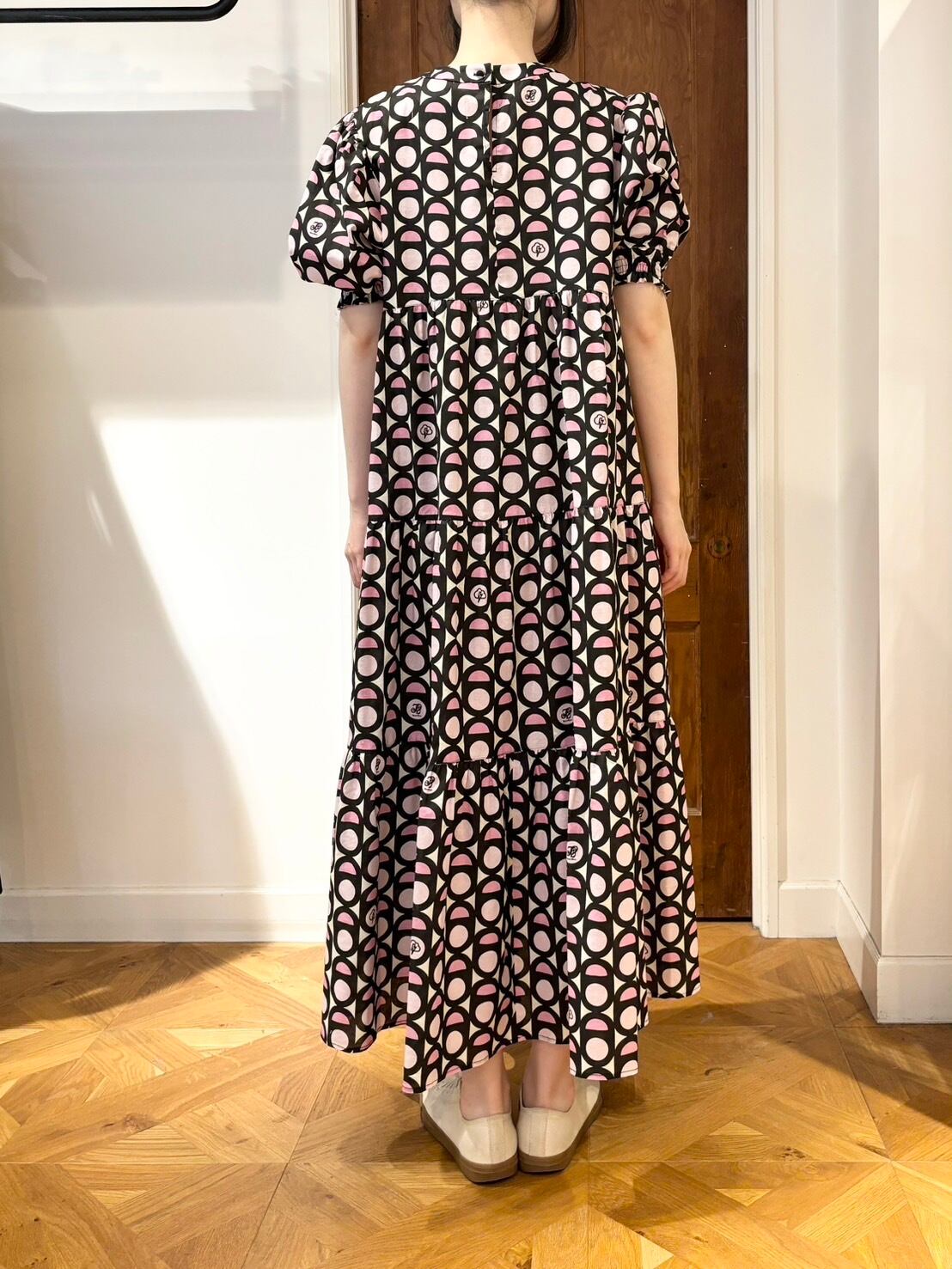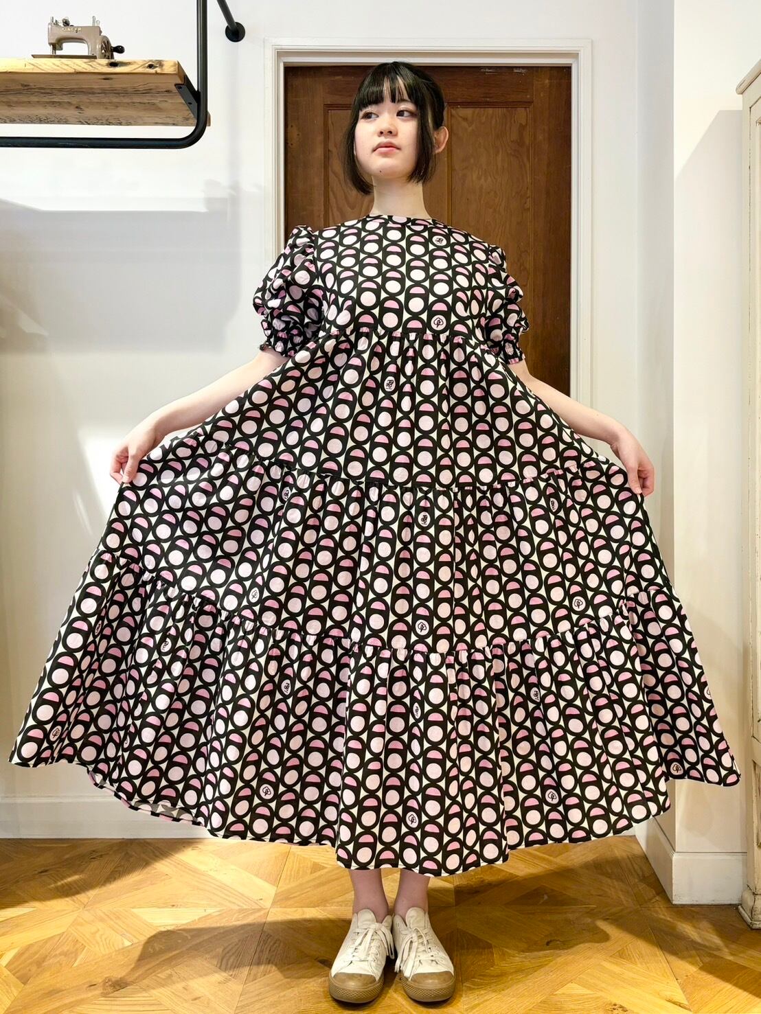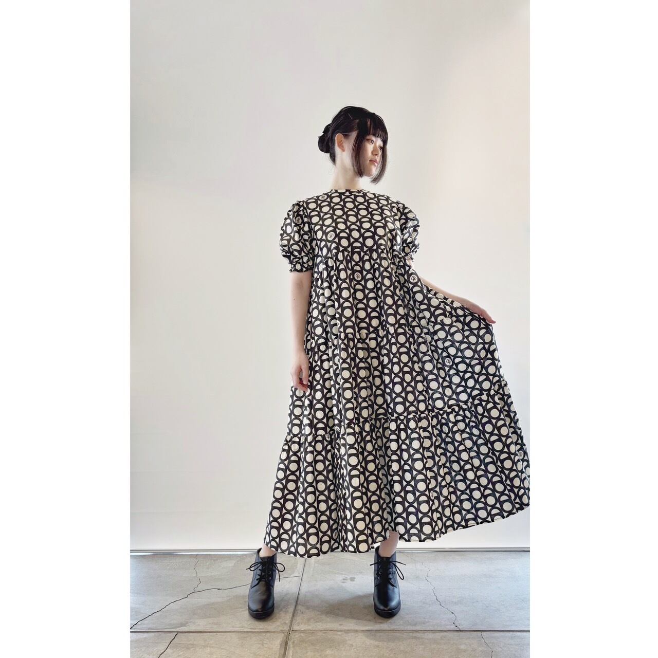レトロ風のオリジナルプリントをのせた綿xラミーのティアードドレス。