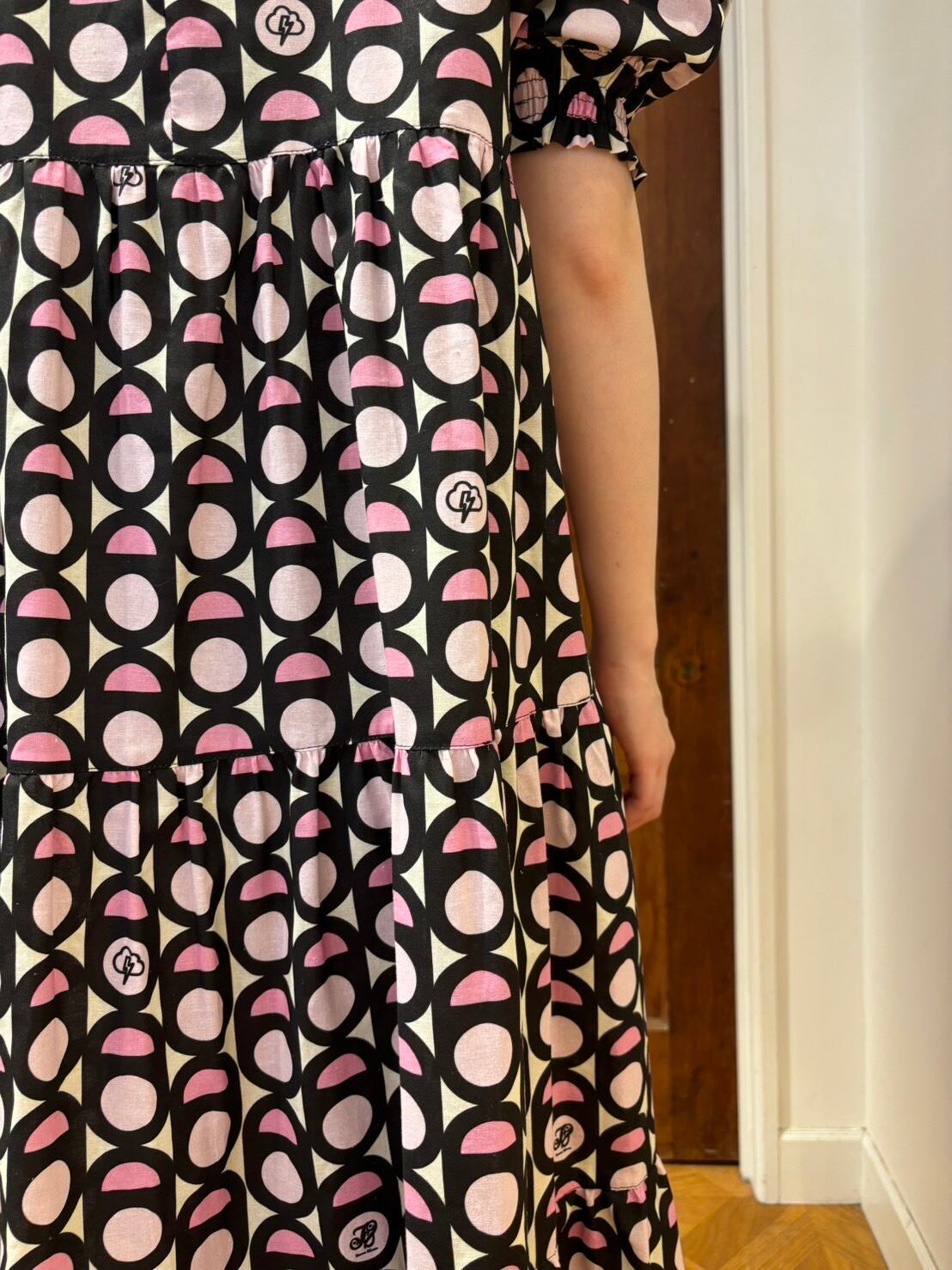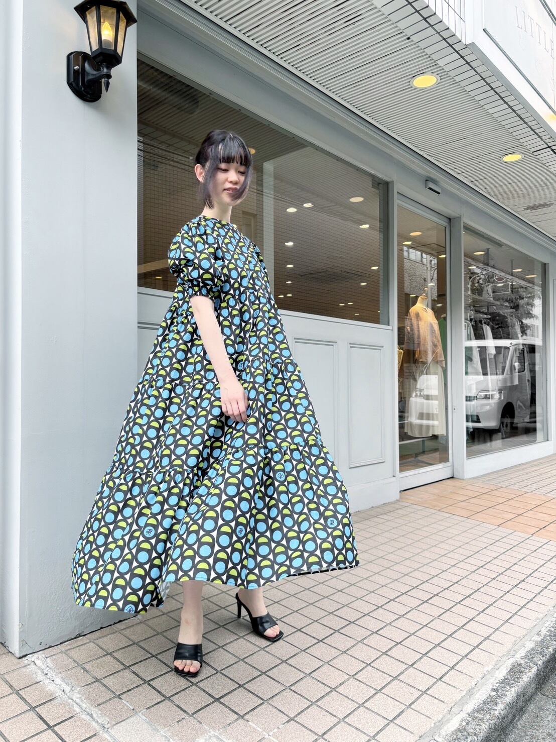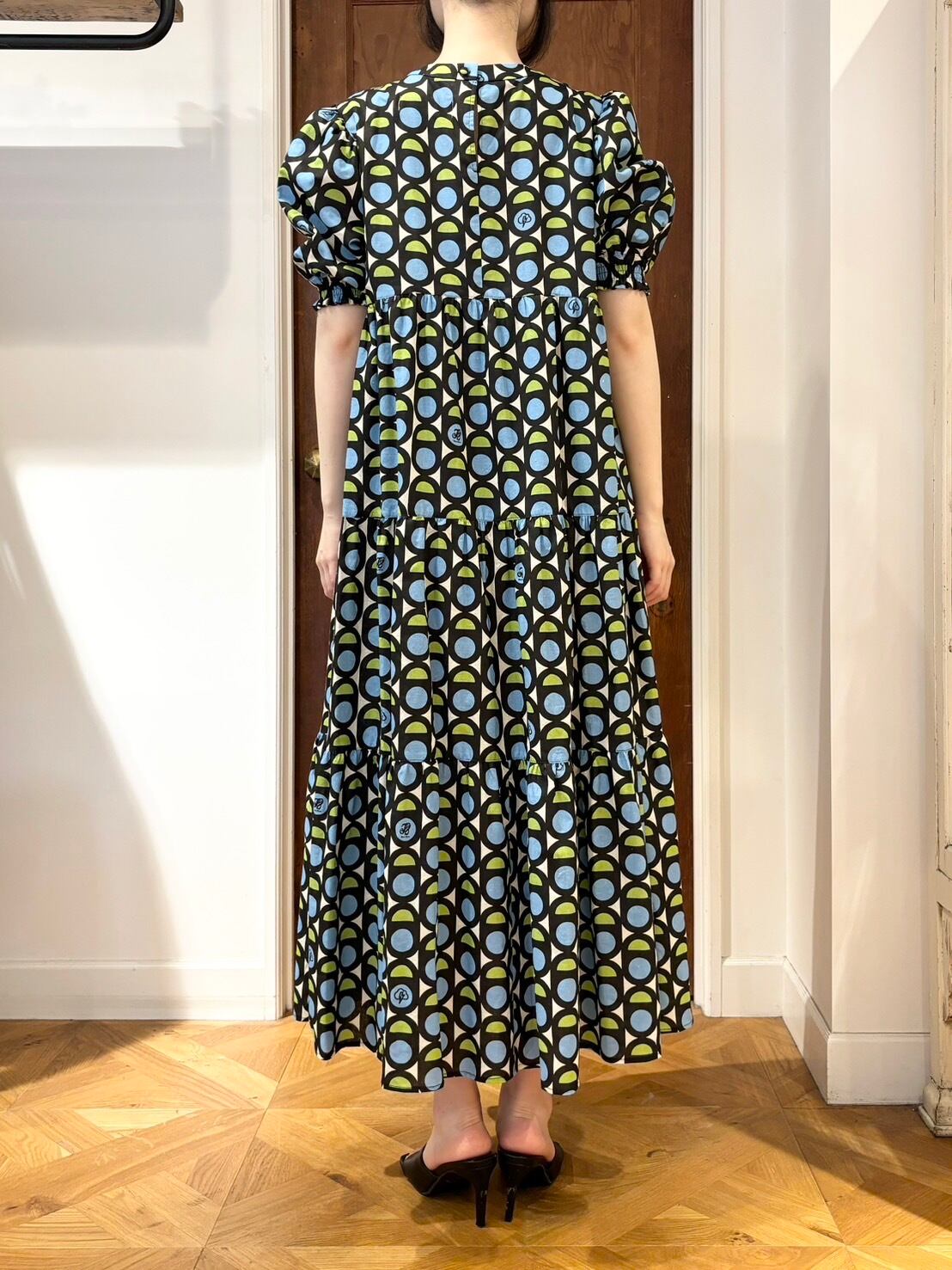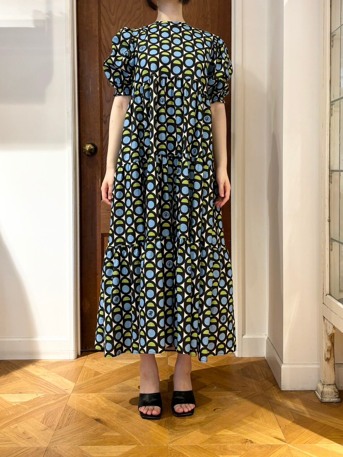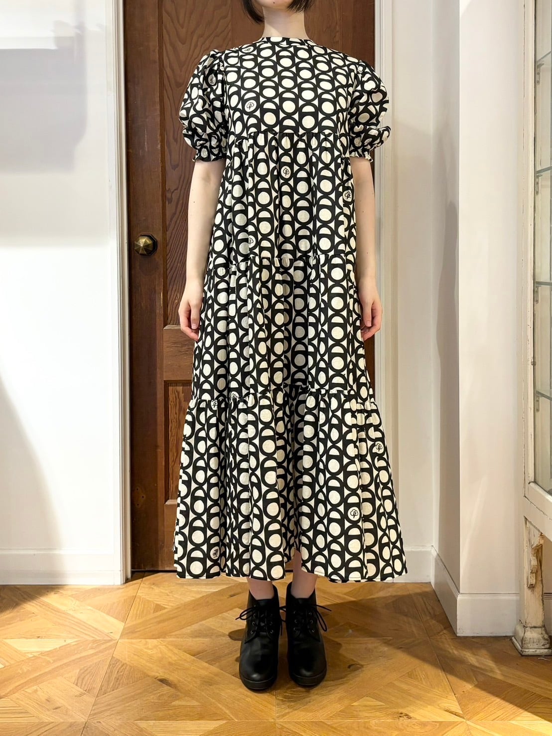 レトロ風のオリジナルプリントをのせた綿xラミーのティアードドレス。