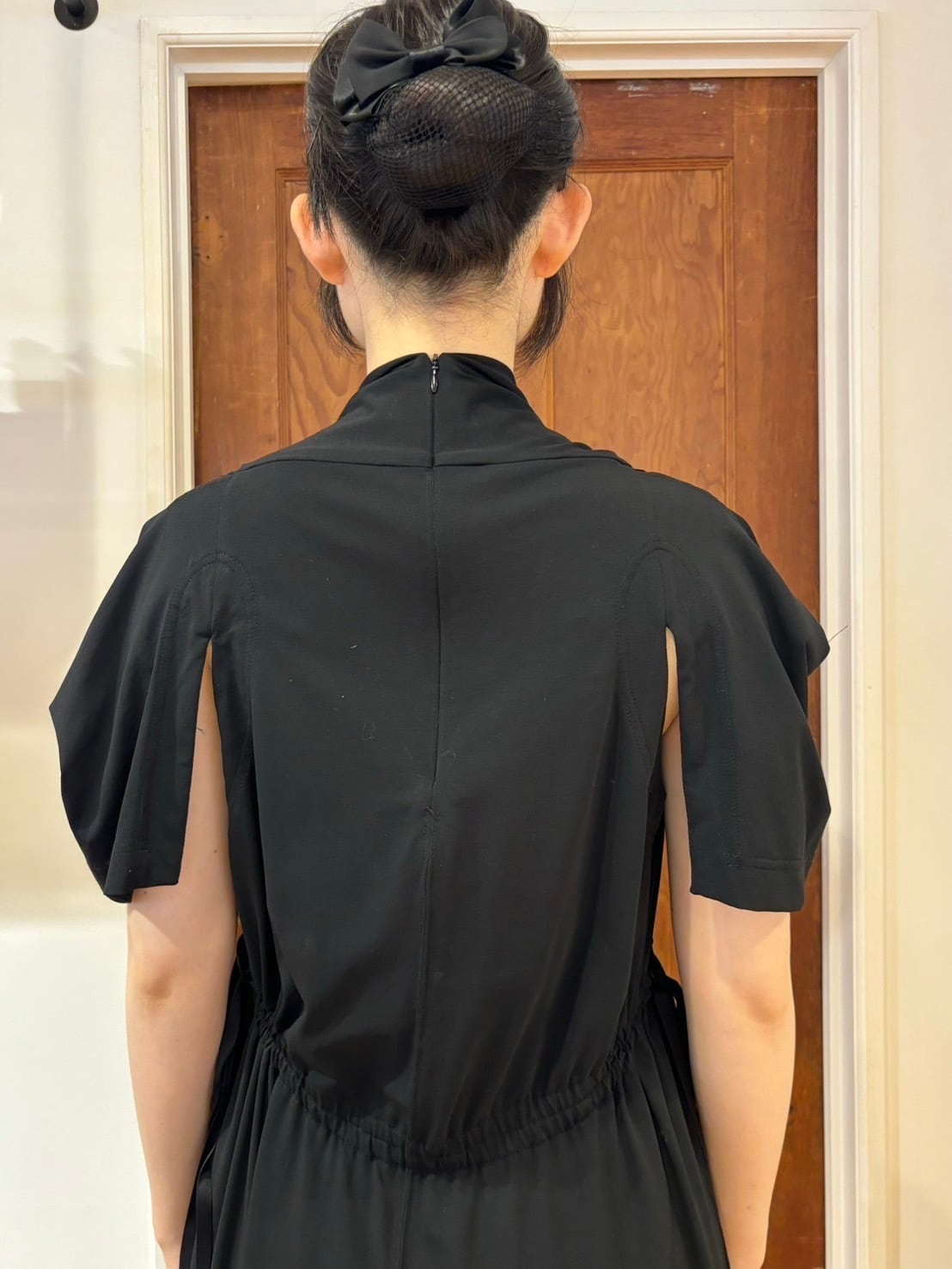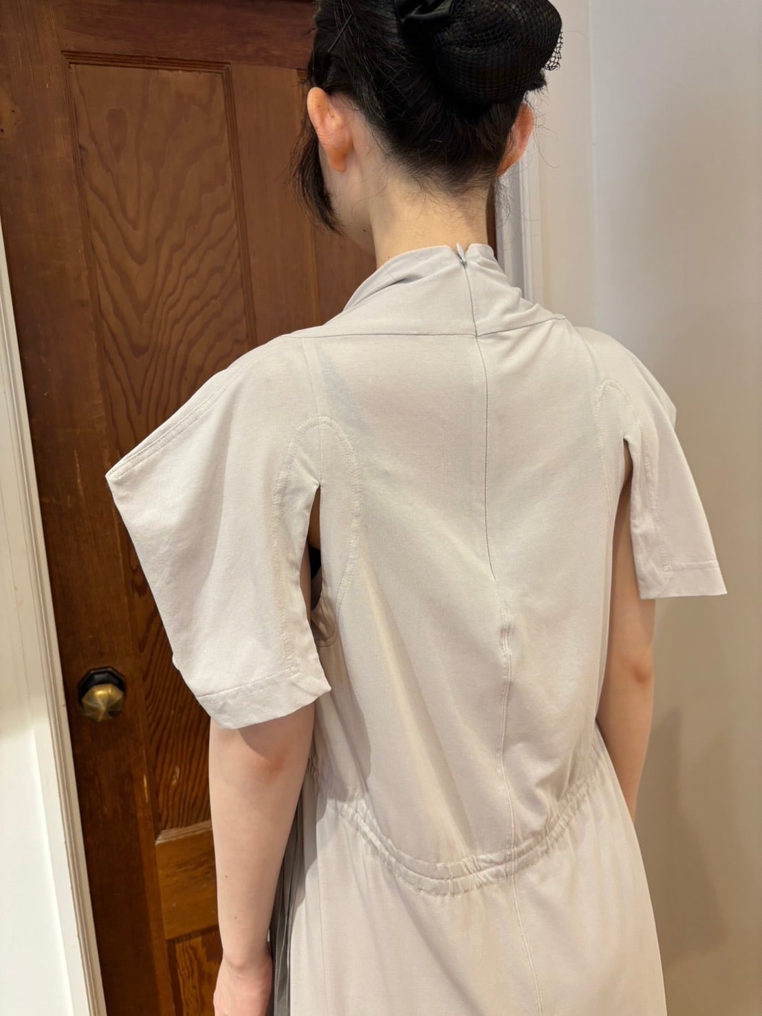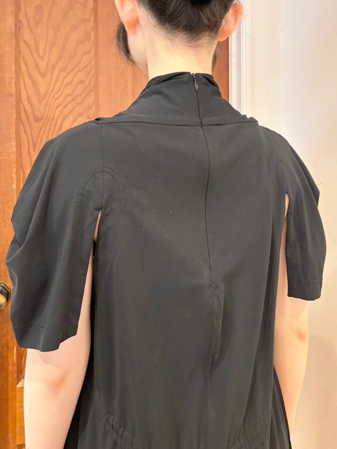 ツンと立ったケープをかけたような袖デザインは、腕回りをスッキリ見せる効果アリ。